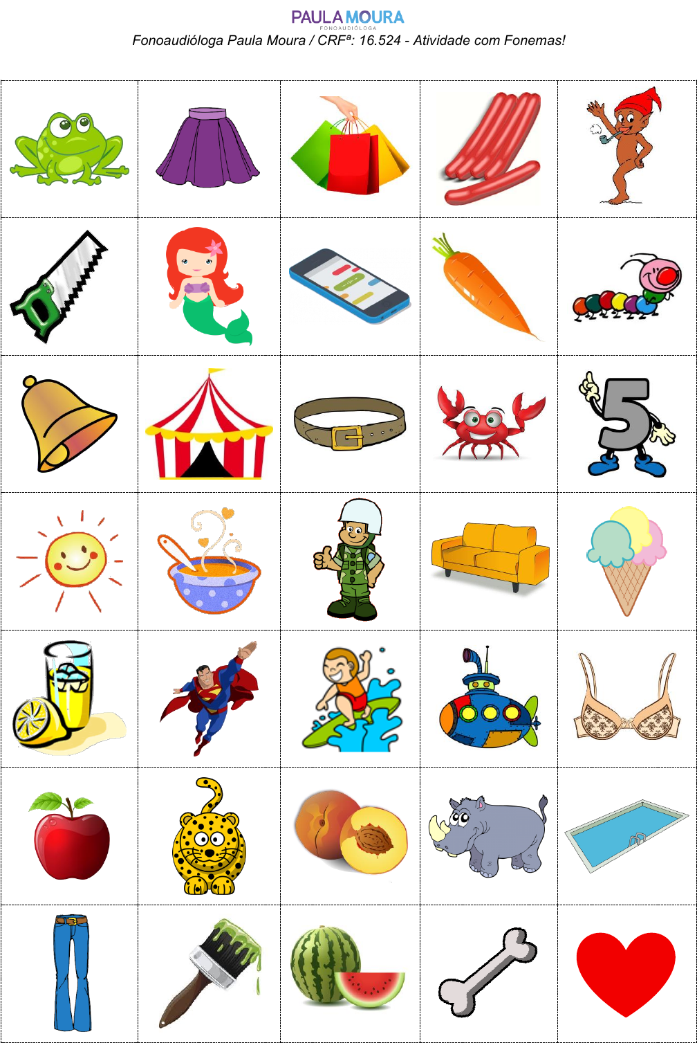 Fonoaudióloga Paula Moura / CRFª: 16.524 - Atividade com Fonemas! Figuras que contém o fonema /s/ no início, meio e final das palavras. Sapo, saia, sacola, salsicha, saci, serrote, sereia, celular, cenoura, centopeia, sino, circo, cinto, siri, cinco, sol, sopa, soldado, sofá, sorvete, suco, super-homem, surfista, submarino, sutiã, maçã, onça, pêssego, rinoceronte, piscina, calça, pincel, melancia, osso, coração.
