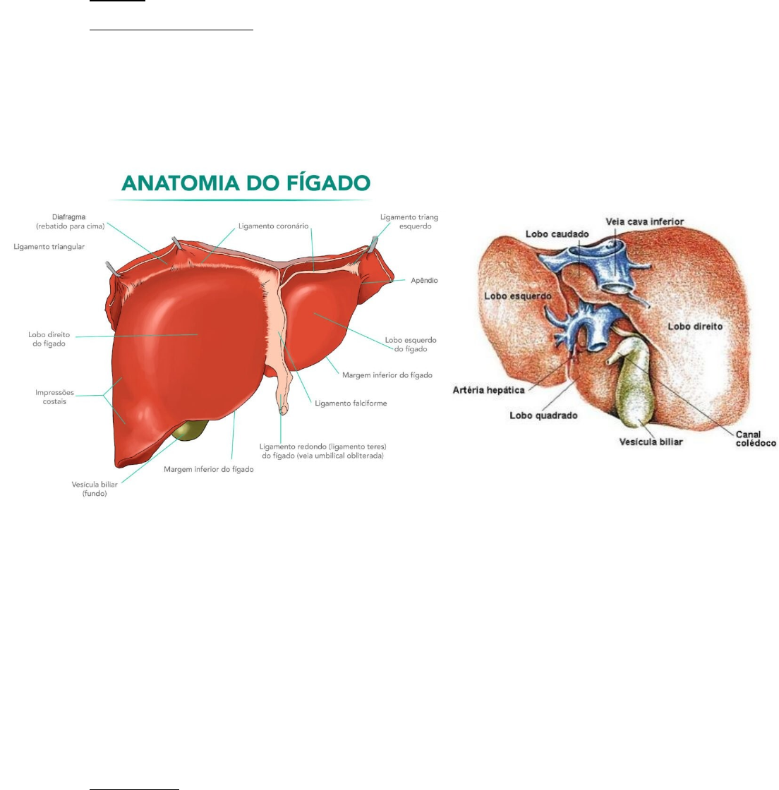 Resumo Fígado, vesícula biliar e baço Livro Moore + Aulas FASEH Iandra Gonçalves Silva Fígado Características gerais Possui 4 lobos: direito, esquerdo, quadrado e caudado; processa nutrientes e secreta bile, maior órgão interno do corpo pesando aproximadamente 1,3 kg. Posicionado abaixo do diafragma nas regiões do hipocôndrio direito e epigástrica do abdome, é muito vascularizado por isso possui coloração marrom avermelhada. Hepatócitos Células cubicas do fígado que formam lâminas hepáticas que têm a espessura de uma ou duas células e estão separadas de outras lâminas por grandes espaços contendo capilares chamados sinusóides hepáticos que são revestidos pelas fagocíticas células de Kupffer, mas os grandes espaços tornam esses sinusoides muito mais permeáveis do que outros capilares, junto com a estrutura laminar do fígado permitem que cada hepatócito entre em contato direto com o sangue. Lóbulos hepáticos · São formados por grandes quantidades de hepatócitos. São unidades funcionais de lâminas hepáticas. No meio de cada lóbulo tem uma veia central e na periferia estão os ramos da veia porta e da artéria hepática. O sangue da veia porta contendo moléculas absorvidas do TGI (trato gastrointestinal) e o sangue arterial misturam-se no interior dos sinusóides e se dirigem para a veia central, as veias centrais convergem para a veia hepática que leva o sangue do fígado para a veia cava inferios. · Os lóbulos têm funções de: síntese, armazenamento e liberação de vitaminas; síntese, armazenamento e liberação de glicogênio; síntese de proteínas do sangue; fagocitoe de células sanguíneas vermelhas velhas e de certas bactérias; remoção de substâncias tóxicas e produção de bile Bile – é armazenada na vesícula biliar e liberada no duodeno para a emulsificação (redução em partículas menores) e absorção de gorduras. É produzida pelos hepatócitos e excretada em canais minúsculos chamados canalículos biliares, eles drenam para os ductos biliares, que drenam para os ductos hepáticos que transportam a bile do fígado. Sangue e bile não se misturam. Inervação Parassimpática dos nervos vagos e simpática dos nervos toracolombares pelo gânglio celíaco. Vesícula biliar Órgão sacular fixo na parte inferior do fígado, armazena e concentra bile (de 30 a 50ml). Recebe suprimento sanguíneo pela artéria cística e veia cística sua inervação é igual à do fígado. Bile Líquido verde amarelado contendo sais biliares, bilirrubina, colesterol e outros compostos. Produzida a partir da bilirrubina obtida pelo processo de degradaçãoo dos eritrócitos no baço (chega à veia porta). É produzida constantemente e drenada pelos ductos hepáticos e colédoco para o duodeno onde cai pela ampola se o esfíncter estiver aberto (pela presença de alimento), se ele não estiver aberto a bile é deslocada para a vesícula biliar pelo ducto cístico. Baço Altamente vascularizado, se rompido causa hemorragia. Está localizado no lado esquerdo da cavidade abdominal, à esquerda do estômago ao qual está suspenso, abaixo do diafragma. Não é vital mas ajuda na produção de linfócitos, filtração do sangue e destruição de eritrócitos. É composto por: a) Polpa vermelha: destrói eritrócitos velhos b) Polpa branca: produção de linfócitos