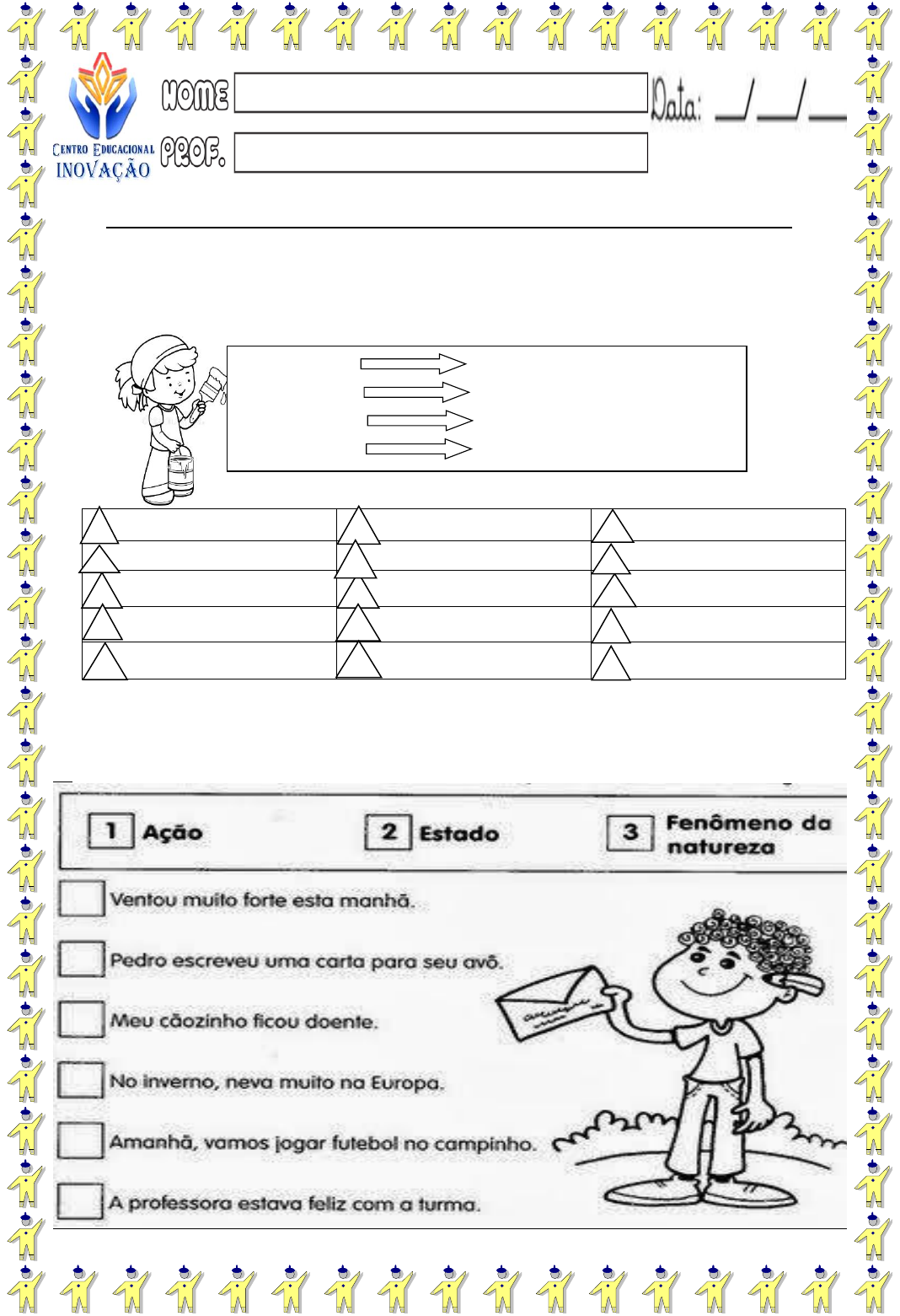 VERIFICAÇÃO DE APRENDIZAGEM DE L. PORTUGUESA 4o BIMESTRE 1- Siga a legenda e pinte os triângulos de acordo com o som do X nas palavras abaixo: Rouxinol Táxi Oxítona Durex Enxoval Texto Exímio Próximo Fuxico Experiência Exame Contexto Exótico Xalé Exérito 2- Circule os verbos nas frases abaixo e classifique-os de acordo com a legenda. aa) Vermelho som de Z Azul som de CH Verde som de CS Amarelo som de S e SS b) Relacione as palavras como, comi e comerei ao dia correspondente.Depois relacione o dia ao tempo da ação que elas indicam nas imagens. 3- Ligue as palavras às informações correspondents ao som da letra H de cada uma delas. a) 4- COMPLETE AS PALAVRAS COM A FAMÍLIA SILABICA DO LH, NH OU CH. _____ leira meda _____ abe _____ di _____ iro nava _____ bara _____ gaú _____ gafa _____to cari _____ _____ nelo baru _____ como comi comerei ontem amanhã hoje a ação vai acontecer a ação já aconteceu a ação está acontecendo Manhã Chuva Homem Palha Hortelã Letra H não apresenta som, há apenas o som da segunda letra. Letra H escrita após uma consoante, formando um novo som. 5- Preencha cada espaço com a letra que está faltando. Palavras com X Palavras com CH • Agora, pinte as imagens de acordo com a legenda. Palavras com X. Palavras com CH.