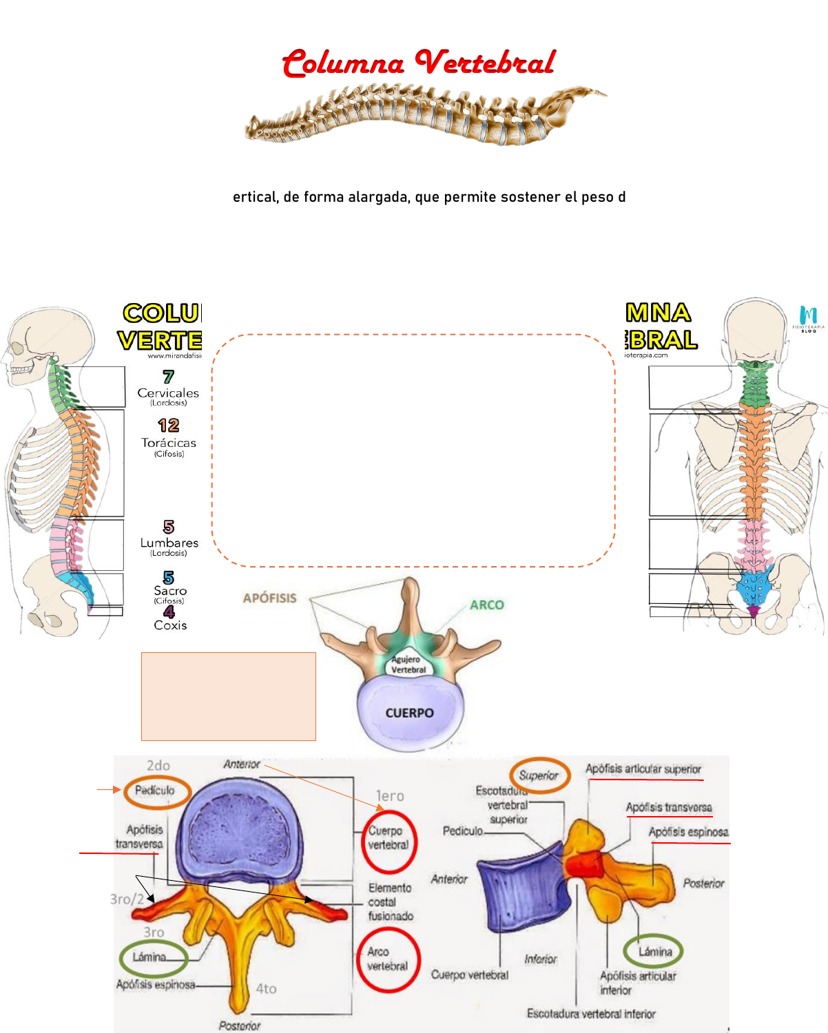 Columna Vertebral Una columna es un soporte vertical, de forma alargada, que permite sostener el peso de una estructura. Estas, están expuestas a una fuerza perpendicular al piso que se llama peso y a una fuerza contraria al peso llamada normal y esas dos suelen estar igualadas. De lo contrario, al ejercer más peso, se consigue una fuerza de compresión que originara un pandeo [es el resultado de pandear. Refiere a la curva o flexión que se produce en la mitad de un muro debido a la compresión]. La columna vertebral del humano está constituida por piezas oseas superpuestas y yuxtapuestas individuales que se llaman vertebras y son alrededor de 33 y 34. Esta columna comprende 4 porsiones: Desde el extremo superior comienza la cervical (7 vertebras) sigue la columna torácica (12 vertebras) la columna lumbar (5 vertebras) sacro y coxis (9 vertebras) Unen al cuerpo con el proceso apofisiario Están a los laterales Al las apofisis. T le sigue una estructura llamada lamina Y finaliza con una apófisis espinosa 1ero 2do 3ro 3ro/2 4to Las vértebras comparten algunas características comunes, por esto se llaman “vertebra tipo” https://definicion.de/estructura/ Las vértebras, están separadas entre sí por discos intervertebrales resistentes. Las vértebras cervicales, torácicas, lumbares y primera sacra también se unen mediante las articulaciones cigapofisarias sinoviales, que facilitan y controlan la flexibilidad de la columna. aunque esta es rígida, que protege la médula espinal a la que circunda. Las vértebras varían en su tamaño y otras características en cada región de la columna, aunque comparten una estructura básica. Una vértebra típica se compone de un cuerpo vertebral, un arco vertebral y siete procesos (apófisis). El cuerpo vertebral es la parte anterior, más grande y soporta el peso del cuerpo. El tamaño de los cuerpos vertebrales va aumentando a medida que se desciende por la columna. La mayor parte de las caras superior e inferior del cuerpo vertebral están revestidas por discos de cartílago hialino. El arco vertebral se halla por detrás del cuerpo vertebral, está formado por dos (derecho e izquierdo) pedículos y se unen con dos láminas óseas planas. El arco vertebral y la cara posterior del cuerpo vertebral forman las paredes del foramen (agujero) vertebral. La sucesión de forámenes vertebrales en la columna vertebral articulada constituye el conducto vertebral, que contiene la médula espinal. Cuatro procesos articulares: dos superiores y dos inferiores, se originan también en las uniones de los pedículos y las láminas; cada uno de ellos posee una superficie (cara) articular. Los procesos espinosos y transversos proporcionan inserción a los músculos profundos del dorso. Los procesos articulares se hallan en aposición con los procesos de las vértebras adyacentes, lo que constituye las articulaciones cigapofisarias. Dichos procesos determinan los tipos de movimientos permitidos y restringidos. Los procesos articulares también mantienen alineadas las vértebras adyacentes; impiden que una vértebra se deslice hacia delante sobre la vértebra inferior. Soportan el peso sólo temporalmente, como cuando uno se endereza desde una posición flexionada. las caras articulares están orientadas sobre los procesos articulares en una dirección característica, que determina el tipo de movimientos permitidos entre las vértebras adyacentes. Caracteristicas de Cada region vertebral Vertebras Cervicales Las vértebras cervicales forman el esqueleto del cuello. Son las más pequeñas de las 24 vértebras móviles y están localizadas entre el cráneo y las vértebras torácicas. La orientación casi horizontal de las caras articulares (de los procesos articulares) y la escasa cantidad de la masa corporal circundante permiten que la región cervical posea la gama más extensa y variada de movimientos. Los procesos transversos poseen forámenes transversos. Los procesos transversos de las vértebras cervicales finalizan en dos proyecciones: un tubérculo anterior y un tubérculo posterior. Estos tubérculos proporcionan inserción a un grupo lateral de músculos cervicales. CARA anterior de la lamina Canal medular triangular Vertebras Torácicas Su cuerpo vertebral es más redondeado y aumenta el volumen acercándose a la región lumbar. El canal medular es más diminuto y circular. La característica principal de las vértebras torácicas es la presencia de las carillas articuales (2 a CADA lado del cuerpo articular y 1 en cada proceso articular) allí es donde se van a articular las costillas. Sus procesos articulares se extienden de forma vertical. Los movimientos que predominan en esta zona son de rotación, ya que las articulaciones costales impiden que se realicen los movimientos de flexión y extensión. Vértebras Lumbares Posee un cuerpo vertebral muy voluminoso debido a que el peso que soportan va aumentando hacia el extremo inferior de la columna vertebral y tiene un canal vertebral pequeño. Tiene las aposfisis transversas mas largas que el resto y las carillas articulares se encuentran posicionadas casi paralelamente. El movimiento predominante de estas vertebras es la flexoextencion. Canal medular o foramen o Vertebras especiales: Atlas y Axis (vértebras cervicales) Atlas: C1 El atlas se articula con los cóndilos del hueso occipital (parte posterior/inferior del cráneo). No posee cuerpo vertebral, sino que se divide en arco anterior y arco superior. El arco anterior, en su parte posterior, tiene una Fosita, donde se posiciona la cara anterior del diente del AXIS (C2). Al arco anterior le continua las carillas articulares las cuales se articulan con los cóndilos del H. occipital. En los laterales se encuentras las apófisis transversas con sus forámenes y finalmente el arco posterior, el cual, en vez de una A. espinal, tiene un tubérculo y un surco vertebral. Axis C2 El axis tiene una característica distintiva y es un diente, el cual se