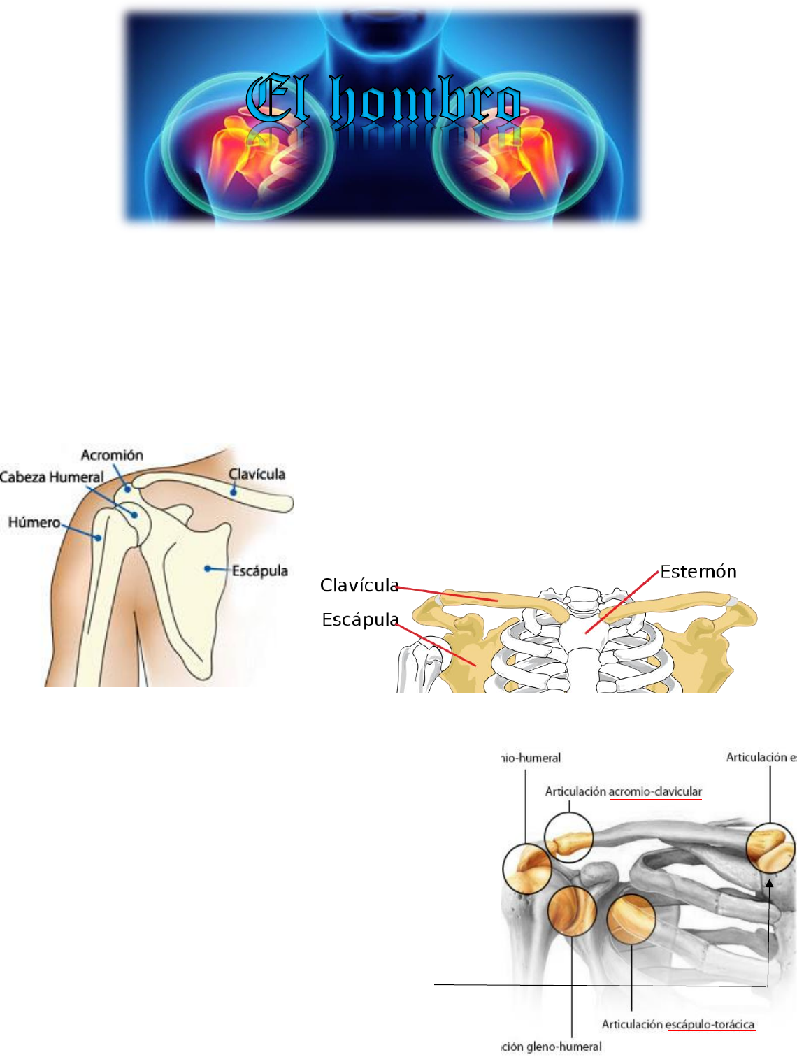 El HOMBRO asociado al codo permite posicionar la mano en el espacio. El hombro es el que une el esqueleto axial con el apendicular, es decir, une al brazo con el tronco. Cintura escapular: está formada por la clavícula y la escapula. La cintura escapular y los huesos de la porción libre del miembro superior forman el esqueleto apendicular superior Huesos del hombro: Clavicula: su parte medial se une con el esternón y la primera costilla, anclando a la cintura escapular con el esqueleto axial. Por su parte lateral se articula con el Acromion (extremo de la escapula) y la escapula se articula con el humero. Articulaciones del Hombro: Articulación glenohumeral (ENARTROSIS/esferoidea) es la unión de la cabeza del humero con la glena de la escapula. Articulación subdeltoidea (SINSARCOSIS [articulación falsa pq no hay unión de hueso y hueso]) está por debajo del Deltoide. Articulación escápulotorácica (SINSARCOSIS) es la unión del musculo subescapular con el musculo Serrato Articulación acromioclavicular (ARTRODIA) es la unión de la escapula y la clavicula. Articulación esternocostoclavicular DOBLE ENCAJE RECIPROCO (SILLA DE MONTAR). La escápula es un hueso triangular plano que se encuentra en la cara posterolateral del tórax. Tuberculo infraglenoideo se encuentra debajo de la cavidad glenoidea de la escapula. La Apof. Coracoides se inserciona con el musculo coracobraquial. Espina de la escapula: se extiende y forma al acromion. Fosa supraespinosa: aloja al musculo supraespinoso. Escapula Humero Cabeza del humero: es la superficie articular y está rodeada de cartílago hialino. En la terminación de esta cabeza comienza el cuello anatómico. Surco intertubercular: se encuentra en el medio de los tubérculos mayor y menor y aloja al tendón del bíceps braquial. Cuello quirúrgico: empieza justo donde acaban los tubérculos y suele ser el sitio de fracturas mas común. El tubérculo mayor tiene forma de surco ya que por allí pasa la arteria radial. El húmero (hueso del brazo) es el hueso más grande del miembro superior; se articula con la escápula en la articulación del hombro y con el radio y la ulna en la articulación del codo Epifisis proximal Epifisis distal Diafisis Su parte lateral se articula con el acromion y su parte medial se articula con el esternón. Por el extremo acromial se encuentra el tubérculo conoideo que alberga al ligamento conoide. Más arriba del tubérculo se encuentra la línea trapezoidea que allí se inserta el ligamento trapezoide. Articulaciones Clavicula Art. Esternoclavicular Art. Glenohumeral Es una articulación enartrocica (permite todo tipo de movimientos) Es una articulación sinovial, esto protege a las superficies articulares de las presiones y roces. El líquido este contenido dentro de una capsula articular, la cual rodea toda la articulación, entonces abarca la cavidad glenoidea y el cuello del humero. Esta capsula tiene pliegues que se desplazan hasta la parte inferior del coracoides y también recubre el tendón del bíceps raquial. El ligamento transversal del humero recubre las estructuras nombradas. Une la cintura escapular con el torax. Está compuesta por dos superficies articulares que, una se articula con el manubrio del esternón y otra con el cartílago costal. Estas están unidas por ligamentos. Los movimientos de esta articulación son: elevación, descenso, proyección hacia adelante y atrás. costillas Esta articulacion cuenta con un soporte extra, denominado Labrum Glenoideo, este tiene la función de aportar mayor superficie articular con el fin de proveerle mayor estabilidad a la articulacion. Músculos del Hombro Manguito de los rotadores Comprende 4 músculos: Músculo supraespinoso: se encuentra alojado en la fosa supraespinosa Músculo infraespinoso: se encuentra por debajo de la espina de la escapula. Músculo redondo menor: parte desde el Angulo inferior de la escapula hasta el tubérculo mayor. Músculo subescapular: está delante de la escapula. Deltoides El musculo deltoides se encuentra rodeando los músculos del manguito rotador. Tiene tres lugares de inserción Espina de la escapula (hueso que sobresale de los músculos) Estos músculos se insertan en en distintos puntos del tubérculo mayor Vascularizacion del hombro La arteria subclavia, que se encuentra por la primera costilla, a partir de esta, se convierte en la arteria axilar y termina en el extremo del musculo redondo mayor porq luego se empieza a llamar arteria braquial. Esta arteria se ramifica en varias ramas arteriales. Algunas son: Arteria subescapular: irriga el musculo Art. Cincunflejas de la escapula y el humero: entrelazan a dichos huesos. Codo – Antebrazo – Muñeca - Mano Detalles del humero La epifisis distal posee un condilo (es la cabeza o protuberancia redondeada en la extremidad de un hueso para formar una articulación) que se articula con el Radio. Troclea (tipo de articulacion) que se articula con el Cubito. Epicondilo, epitroclea, la fosa coronoidea. Radio y cubito (unla) El antebrazo esta formado por dos huesos paralelos de los cuales el radio puede pivotar alrededor del otro (la ulna), posibilita los movimientos de supinación y pronación que permiten rotar la mano. la ulna tiene dos proyecciones prominentes: 1) Olécranon (formando el punto más saliente del codo) y actúa como palanca para la extensión del codo, y el apofisis coronoides. La articulación de la ulna y el húmero permite movimientos de flexión y extensión del codo. En la cara posterior del olecranon se inserta el tendon del M triceps (musculo extensor), en la Ap coronoides se inserta el M braquial, y en la tuberosidad del radio se inserta el M biceps. El codo es una articulación sinovial que une al brazo con el ante brazo y este compuesto por 3 articulaciones: Articulación Humerorradial: comprende el cóndilo del humero y la cabeza del radio (art esferoidea). Articulación Humerocubital: Entre la tróclea del humero y la incisura troclear del 