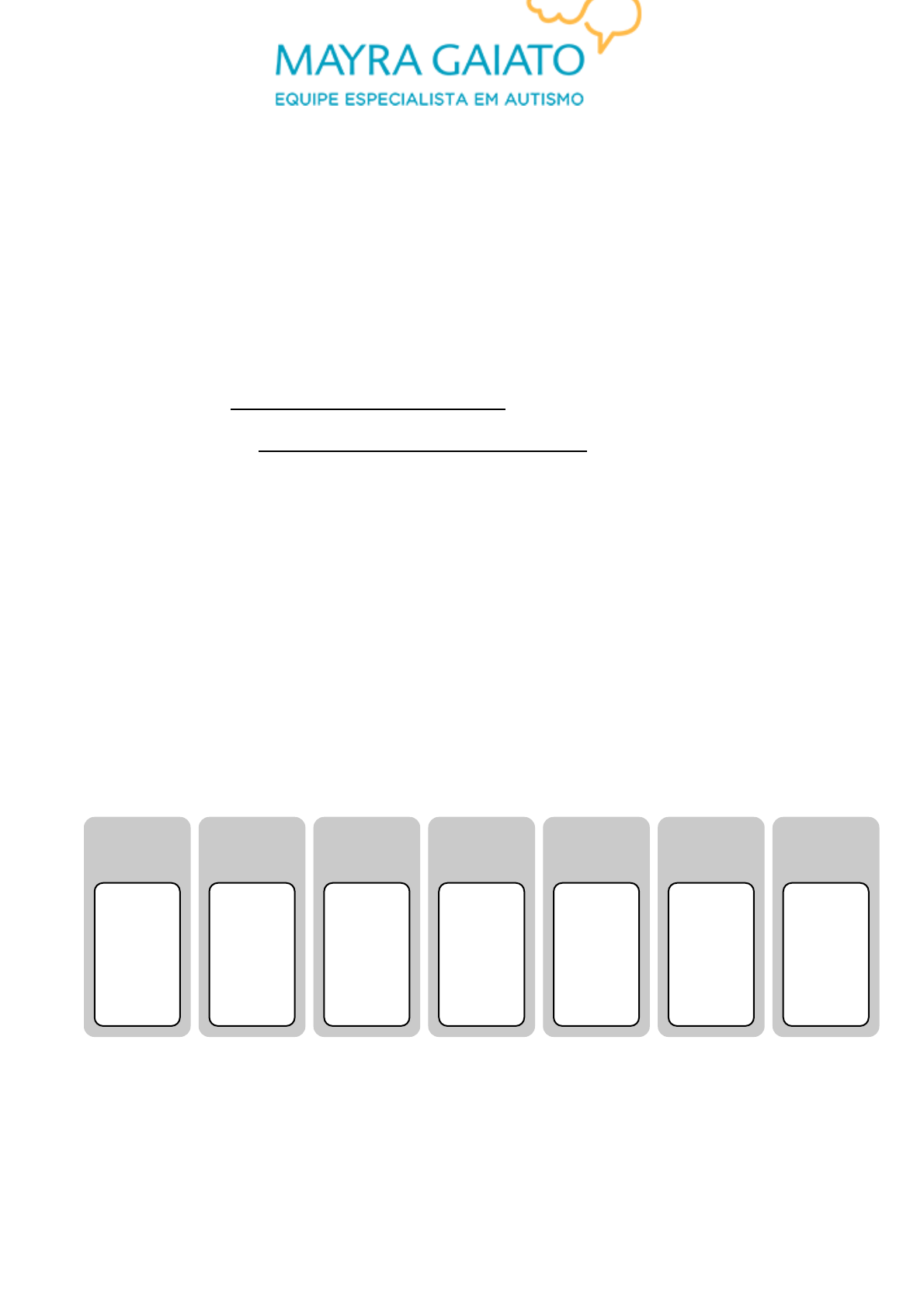 Contato visual Mayra Gaiato Keli Santos Nome do Paciente: (preencher com o nome da criança). Obje<vo do Programa: Ensinar a criança a olhar quando chamada. Por que é importante contato visual? Contato visual é um repertório base para aprender outros comportamentos, ou seja, devemos pra;car o contato visual para que possamos observar o outro e, assim, aprender a seguir comandos, imitar, discriminar objetos, entre outros. Se torna extremamente importante a criança olhar em diversas situações: quando chamada pelo nome, quando quer compar;lhar algo conosco, durante turnos nas conversas, respondendo quando lhe direcionamos uma fala de forma indireta, (Ex: “olha só o papai chegou”), entre outras situações que possam surgir no dia- a- dia. Além disso, quando a criança apresenta uma maior emissão de contato visual de forma espontânea ela aumenta as oportunidades de aprender com o ambiente e as pessoas na qual convive. Procedimento: Respostas: o Possibilidade 1: Passo 1 Preparar o reforçador que será utilizado na tarefa. Passo 2 Sentar no chão/mesa junto com a criança. Passo 3 Explicar que vamos trabalhar agora de “chamar pelo nome” Passo 4 (Antecedente) Chamar pelo nome (falar somente o nome da criança). Passo 5 (Resposta) Criança olha para o adulto Passo 6 (Consequência) Reforçar! Passo 7 Registrar Licenciado para - Sílvia Regina Andrade Gonçalves - 84972670606 - Protegido por Eduzz.com o Possibilidade 2: Lembrando: Deverão ser realizadas 10 tenta;vas, intercalando cada uma com o reforçador. Hierarquia de Ajudas: o Ajuda Osica (AF): Significa ainda uma ajuda intensa, pegando suas mãos e fazendo os movimentos para a criança. o Ajuda leve (AL): Apenas encostando na sua mão e direcionando o movimento. o Ajuda Gestual (AG): Usamos nossas mãos para apontar ou mostrar o que ele deve olhar ou fazer, fazemos gestos. o Independente (I): Quando a criança realiza a ação de forma espontânea. A criança olhar Reforçar imediatamente! Registrar. A criança não olha Dar ajuda* Reforçar Registrar Licenciado para - Sílvia Regina Andrade Gonçalves - 84972670606 - Protegido por Eduzz.com