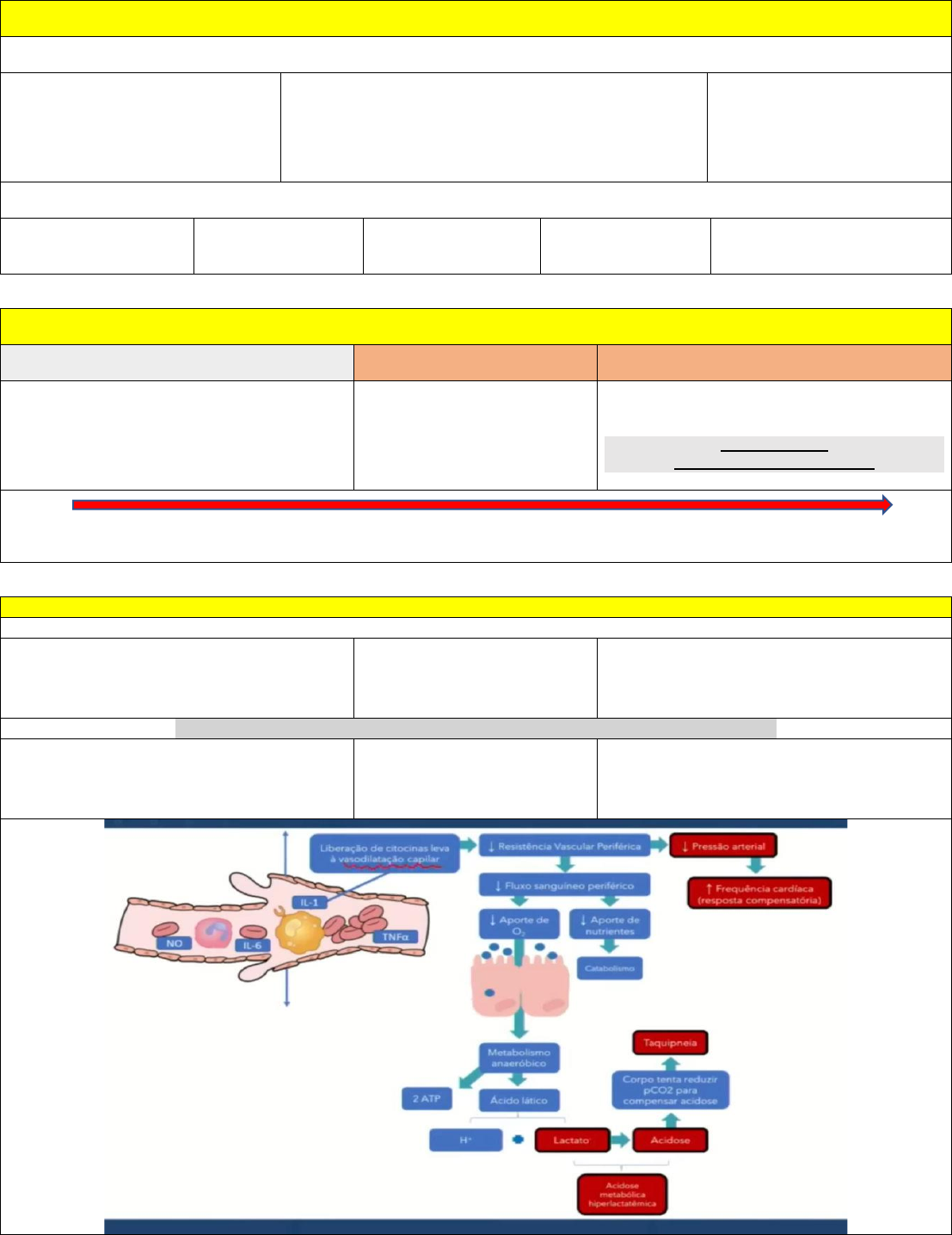 SEPSE E CHOQUE SEPTICO CONCEITO DE SEPSE: INFECÇÃO → ⬆ RESPOSTA INFLATÓRIA → DISFUNÇÃO ORGÂNICA = SEPSE. INFECÇÃO: (Vírus/ Bactérias / Fungos / Protozoários e etc.) → ⬆ RESPOSTA INFLATÓRIA: (liberar: IL – 1 / IL -6 / TNF α, são imunomediadores de citocinas pro inflamatórias gerar um vaso dilatação intensa). → DISFUNÇÃO ORGÂNICA = SEPSE. . O QUE NÃO É SEPSE: Febre + Leucocitose. Hipotensão Isolada: (Ex: Síndrome Vaso Vagal). Infecção de Corrente Sanguíneo. Infecção por MDR: MDR – Multidroga Resistente. Infecção de Múltiplos Órgão. INFECÇÃO, SEPSE E CHOQUE SÉPTICO: INFECÇÃO: SEPSE: CHOQUE SÉPTICO: - Doença causada por microrganismo SEM respostas inflamatória intensa ou difusa. (ex: infecção de garganta, apenas com febre ou leucocitose e tratou com cefalexina). - Infecção com inflamação intensa e DISFUNÇÃO ORGÂNICA. Prática: Infecção + 2 pontos no Quick SOFA. - Para ter Choque Séptico tem que ter Expansão. - Sepse com hiperfusão + RESSUSCITAÇÃO VOLÊMICA que persiste com: PAM < 65 mmHg. Lactado > 2 mmol/L ou 18 mg/dL. Baixa Letalidade. Alta Letalidade. FISIOPATOLOGIA DA SEPSE E DISFUNÇÕES: ALTERAÇÕES HEMODINÂMICAS: Citocinas Pró – Infamatórias: (IL – 1 / IL – 6 / TNF α). ➔ Intensa Vasodilatação. ➔ ↓ Resistência Vascular Periférica. Pressão Arterial = DC (FC X Volume Sistólico) X Resistencia Vascular Periférica. Pressão Arterial: - Proporcional a RVP. Débito Cardíaco: - Aquilo que sai do coração. - Inversamente proporcional a RVP. Resistência Vascular Periférica: - Proporcional a PA. ALTERAÇÕES RESPIRATÓRIAS: - Temos a produção de um ácido novo (ácido lático), logo, ela tem Ânion – gap aumentado. Acidose Metabólica. Alcalose Respiratória Compensada. Aumento da FR. Aumento da Amplitude. ⬆ Volume Corrente. Ritmo Respiratório de Kussmaul. (Inspiração pausa Expiração pausa). OUTRAS ALTERAÇÕES RESPIRATÓRIAS SDRA E DERRAME PLEURAL: - SDRA: (Síndrome do Desconforto Respiratório Agudo). (18 a 25%). - Vasodilatação Alveolar Grave: Líquido Capilar – Líquido Alveolar. - Preenchimento Alveolar. - Derrame Pleural: (80% dos casos). - Redução da relação PaO2/FiO2 (< 300). ALTERAÇÕES RENAIS: Na Fase 2º Fase: Redução TFG (Pré Renal): ⬆ Creatinina e Ureia (Oliguria). ALTERAÇÕES NEUROLÓGICAS: FASE AGUDA: FASE CRÔNICA: - Delirium. - Alterações do NC. - Agitação. - Sonolência. - Alucinações. - Disfunção Neurocognitivas. - Neurotransmissores ↓: (como Serotonina e Dopamina). ALTERAÇÕES GASTROINTESTINAIS: ⬆ Bilirrubina. ALTERAÇÕES HEMATOLÓGICAS: Sepse produz um cenário de Hipercoagulabilidade e Promove Supressão Medular. Consumo de Plaquetas / Consumo de Fibrinogênio / Consumo de fatores de coagulação = CIVD. Nem sempre o paciente com CIVD apresentará trombose visível. CIVD: (Coagulação Intravascular Disseminada). Consumo de fatores de coagulação → Múltiplas disfunções orgânicas → CIVD. ⬆ TTPA. ↓ Plaquetas. ⬆ TP. ↓ Fibrinogênio. ⬆ D – Dímero (graves). CRITÉRIOS DA TRIAGEM NA SEPSE: VELHOS CRITÉRIOS DE SIRS - (3 CLÍNICO / 1 LABORATÓRIAL). O QUICK SOFA - APENAS CLÍNICO – CPF E SIS. NA PRÁTICA: CRITÉRIO – SOFA SCORE: MORTALIDADE. - Gasometria Arterial. - Plaquetopenia ↓. - Bilirrubina Total ⬆. - Oliguria ou ⬆ Creatinina. SE CHEGAR PACIENTE COM SEPSE, O QUE FAZER: Iniciar o pacote já na identificação do paciente com sepse ou choque séptico. Objetivo – Termina -ló na primeira 1 hora do atendimento. 1º COLETA DE EXAMES LABORATORIAIS: - Gasometria e Lactato Arterial. - Hemograma completo. - Creatinina. - Bilirrubina. - Coagulograma. 2º COLETA DE 2 PARES DE HEMOCULTURAS: Sítios Distintos: (4 Balões). 2ª COLETA DE CULTURAS DE OUTROS SÍTIOS: - Urina. - Cultura Secreção Traqueal ou Escarro – IT. Respiratório. - Uroculturas – IT.Urinária. - Coprocultura (se diarreia patológica) – ITG. - Cultura de abscessos, profunda de sítio incisional – Pele, partes moles e sítios cirúrgicos. - Cultura de liquido sinovial – Artrite Séptica. - Cultura de LCR – ISNC. 3º ADMINISTRAÇÃO DE ANTIBIÓTICOS: - Endovenosos. - Amplo espectro: (baseado no foco suspeitado e colonizações do paciente, ajustado para o peso corporal). - Enquanto, se pensa em Antibióticos, também pensar em controle do foco. 4º EXPANSÃO VOLÊMICA COM CRISTALÓIDES: - Dose: Individualizada. - Se hipoperfusão ou aumento do lactato mais que 2x o valor de referência. Como avaliar a Hipoperfusão (Regra dos 3 Os): ↓ PA / Pulso Fineforme / Perfusão: TEC ⬆. 5º INICIAR DROGAS VASOATIVAS (NORADRENALINA): - Se PAM < 65 mmHg após expansão. Ação Periférica. NÃO ESQUEÇA (DECOREBA): PACOTE DE REAVALIAÇÃO DISFUNSÃO HEMODINÂMICA (3 Ps): Passos essenciais na 6º hora. 1º AVALIAR ÊXITO DA RESSUSCITAÇÃO VOLÊMICA: - Coleta de novo lactato caso o 1º seja 2x maior que o limite. - Melhora de PA, Perfusão e Pulsos. - Considerar pressão venosa central: (não é obrigatório). - Distensibilidade da veia cava. - Mensuração da SVCO². - Melhora de sinais indiretos: (diurese, nível de consciência e etc.). 2º TRANSFUNDIR SE SINAIS DE HIPOPERFUSÃO: Hemoglobina esteja < 7 mg/dL. 3º AVALIAR O DÉBITO CARDÍACO: - Caso a SVCO, se mantenha baixa com sinais de volemia adequada, ou sinais ecográficos de baixo débito, considerar o uso de Dobitamina. MANEJO SISTEMATIZADO – REDUZ A MORTALIDADE: (SE DER TEMPO FAÇA) OUTRAS CONDUTAS NÃO SISTEMATIZADAS: OS “NÃOS” INQUESTIONÁVEIS: Controle Glicêmico: (< 180 mg/dL). Uso de Bicarbonato para manejar acidose. Ventilação Protetora: (6 ml/kg) (PaO2: 70 a 90 mmHg). Terapia Renal substitutiva precoce. Evitar jejum. Dieta enteral conforme tolerância. ATUALIZAÇÃO DE OUTUBRO 2016 X 2021: