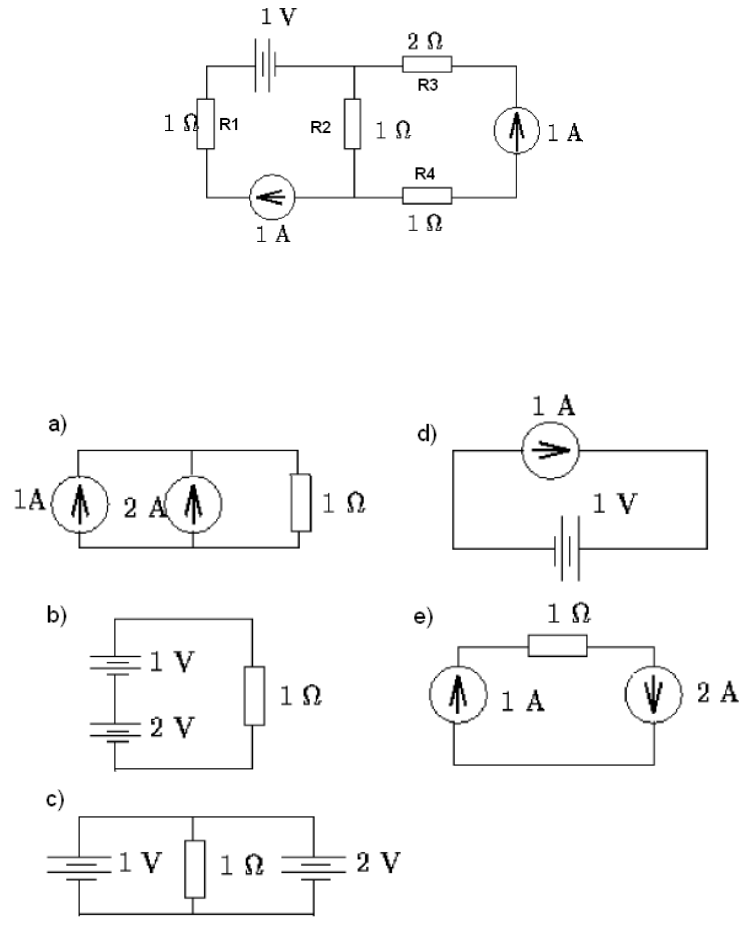 Lista de Exercícios – Circuito I – Capítulos 1 e 2. Material retirado das Listas de Exercícios COB781 (diversos livros)-Roberto Macoto Ichinose 1) Determine a potência dissipada nos resistores R1, R2, R3 e R4. rta.: P1=P4=1W, P2=4W, P3=2W 2) A seguir são apresentados 5 circuitos, diga se eles podem ocorrer na prática e em caso negativo (justifique sua resposta). Calcule a potência dissipada nos resistores nos casos em que isso for possível for possível. rta.: sim, sim, não, sim, não 3) Qual a potência e a energia consumidas de uma linha de 110V por um ferro elétrico de 22Ω em 3 horas? rta.: P=550W, E=1650WH 4) Um eletrodoméstico trabalha com uma tensão de 120V e possuí uma resistência de 18Ω. Sabendo que ele foi utilizado por um período de 10 horas e que o custo por kilowatt-hora é de R$ 3,00 , qual será o valor a ser pago para a concessionária de energia? rta.: R$24,00 5) Um dipolo apresenta a característica de corrente e tensão da figura abaixo. Mostre, caso ocorra, o(s) intervalo(s) de tempo onde o dipolo fornece energia ao sistema. rta.: p<0 6) Calcule a energia gasta pelo circuito que trabalhou 5 horas dissipando a potência indicada no gráfico abaixo. 20 10 2 5 Horas P [W] rta: 65WH 7) Calcule as potências para cada componente do circuito abaixo. Indique quando o componente fornece ou absorve energia. rta.: Potência fornecida: Fonte 2A (50W), Fonte 3A (78W), Fonte 20V (0W), Fonte 40V (400W). Potência dissipada: Fonte 50V (200W), Fonte 15V (30W), R=5 (20W), R=2 (18W), R=4 (100W), R=7,5 (30W), R=2,5 (10W), R=1 (16W), R=6 (96W), R=4 (64W). Lista de Exercícios – Circuito I – Capítulos 1 e 2. Material retirado das Listas de Exercícios de Circuitos I – UFSC – Patrick Kuo Peng (O atalho para as questões originais está na seção consulta – links úteis) [UFSC – Circuitos Elétricos I - 2006/1] A potência dissipada por um resistor de 100Ω é dada por We400)t(p t4−= (para 0t > ). Determine a expressão da carga, em µC, que atravessa este resistor no intervalo de tempo 1ms<t<2ms. Resposta: 200 µC [UFSC – Circuitos Elétricos I - 2002/2] Uma bateria de automóvel é carregada com uma corrente constante de 2A por 5 horas. A voltagem dos terminais da bateria vale t5.011)t(v += [V] para t>0, t em horas. a) Determine a energia W(t) entregue à bateria durante as 5 horas e trace o gráfico de W(t). b) Considerando o custo da energia elétrica de R$ 0.18/kWh, determine o custo de carregamento da bateria por 5 horas. Resposta: a) kWh1225.05h)W(t == b) R$ 0.022 Lista de Exercícios – Circuito I – Capítulos 1 e 2. Material retirado das Listas de Exercícios de Eletricidade A – UFRGS – John Wisbeck (O atalho para as questões originais está na seção consulta – links úteis) 1) No modelo elétrico simplificado da figura 1 a fonte de tensão representa um sistema de geração de energia de uma concessionária de energia elétrica e a fonte de corrente um sistema alternativo de geração de energia elétrica a partir da energia solar, que auxiliará no fornecimento de energia para os consumidores representados pela lâmpada. A lâmpada incandescente empregada no circuito, quando conectada a uma fonte de tensão de 120V, recebe 40W de potência. I1 1A L1 + - V1 120V Figura 1. a) Indique na figura 1 o sentido e o valor da corrente e da tensão na fonte de tensão, na lâmpada e na fonte de corrente de acordo com a convenção passiva para os sinais. b) Determine se a concessionária está fornecendo ou recebendo energia para o circuito; c) Qual a energia em kWh transferida pela ou para a concessionária durante um dia. d) Qual seria custo de se manter a lâmpada do problema 1 ligada por 10 horas quando a energia elétrica custa 30 centavos de real/(kW.hora) durante a noite (quando a fonte de energia solar não pode auxiliar, isto é, não fornece nenhuma corrente para o circuito). 2) Uma lâmpada incandescente quando conectada a uma fonte de tensão de 120V recebe 40W de potência. Indique na figura 2 o sentido e o valor da corrente na fonte de tensão seguindo a convenção passiva. L1 + - V1 120V Figura 2. 3) Calcule qual o custo de se manter a lâmpada do problema 2 ligada por 10 horas quando a energia elétrica custa 30 centavos de real/(kW.hora). 4) A moderna tecnologia produziu uma pequena bateria de níquel cádmio recarregável de 1,25V que, quando totalmente carregada, possui armazenado 196J de energia. O gráfico apresentado na figura 3 mostra a corrente drenada desta bateria diariamente em função de sua utilização para alimentar um transmissor remoto de dados. Por quantos dias a bateria poderá alimentar o transmissor com este ciclo de trabalho? (suponha que a tensão sobre a bateria não se reduz durante todo o período de utilização) tempo (hrs) 0 0,5 1,5 1,0 2,0 4 12 i(t) mA 9 18 24 20 Figura 3. 5) No caso do problema 4, se desejássemos devolver a energia retirada da bateria diariamente por meio de uma célula solar e um dispositivo eletrônico que com a energia solar coletada fornece uma corrente constante de 1ma para a carga da bateria, tal que o modelo elétrico equivalente simplificado deste carregador é a fonte de corrente constante de 1mA apresentado na figura 4. Com este aparato por quanto tempo a pilha deveria ficar carregando diariamente? Modelo Elétrico Simplificado do Carregador + 1,25V 1ma Bateria Figura 4 6) No circuito da figura 5 determine as variáveis desconhecidas (corrente, tensão e potência em cada elemento) seguindo a convenção passiva sabendo que a potência recebida pelo elemento B é de 70W e a fornecida pelo elemento D é 40W. Verifique se o circuito obedece o princípio da conservação de energia. E C DB A ib 2A 3A + -10V _ + vd _ic Figura 5 7) No circuito da figura 6 determine as variáveis desconhecidas (corrente, tensão e potência em cada elemento) seguindo a convenção passiva sabendo que a potência recebida pelo elemento E é de 70W. Verifique se o circuito obedece o princí