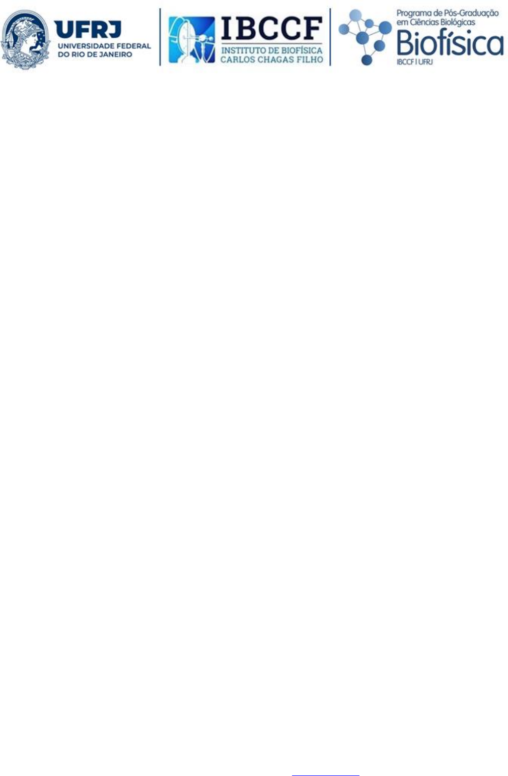 Instituto de Biofísica Carlos Chagas Filho – Centro de Ciências da Saúde/CCS Av. Carlos Chagas Filho, 373. Bloco G - Sala G1-003 - Cidade Universitária 21941-902 Rio de Janeiro RJ - Brasil Telefones: (21)3938-6516 – 3938-6517 - E-mail: pgbiofisica@biof.ufrj.br Home page: http://www.biof.ufrj.br DISCIPLINAS 2021-2 - INSCRIÇÕES HOMOLOGADAS (LISTAGEM ÚNICA – INSCRIÇÕES SIGA + GOOGLEFORM) BFB 713 - SINALIZAÇÃO NA RESPOSTA AO DANO NO DNA BIA FRANCIS RAJSFUS DANIELE CRISTINA PASSOS DA ROCHA FREDERICO LUIS LIMA ROSA GABRIELA SILVA ALMEIDA GUSTAVO DA SILVA LOUREIRO GUSTAVO GUADAGNINI PEREZ JOAO PEDRO QUEIROZ LIPORACE LANA SOARES DE SALES LUCAS MENDES MONTEIRO MICHELLE LOPES ARAÚJO CHRISTIE PRISCILA DANTAS DE SOUZA TAYNÁ MOURÃO CAMELO BFB 717 - FUNDAMENTOS BIOQUÍMICOS SOBRE A TRANSIÇÃO EPITELIAL-MESENQUIMAL NO DESENVOLVIMENTO EMBRIONÁRIO E EM DOENÇAS (Não houve inscritos) BFB 724 - DEGENERAÇÃO E REGENERAÇÃO DO SISTEMA NERVOSA BEATRIZ DE ALMEIDA WAGNER FABIÁN LOMBILLO ALFONSO GABRIELA SARDELLA DA SILVA JEAN CARLOS SOUZA SILVA RAFAEL PEREIRA FERREIRA WAGNER FARIA MESSIAS mailto:pgbiofisica@biof.ufrj.br Instituto de Biofísica Carlos Chagas Filho – Centro de Ciências da Saúde/CCS Av. Carlos Chagas Filho, 373. Bloco G - Sala G1-003 - Cidade Universitária 21941-902 Rio de Janeiro RJ - Brasil Telefones: (21)3938-6516 – 3938-6517 - E-mail: pgbiofisica@biof.ufrj.br Home page: http://www.biof.ufrj.br BFB 739 - V WORKSHOP DOS PÓS-DOUTORES DO IBCCF ALBERTO BARRETO GRIMALDI ALINE LUCAS PIMENTEL ANA CAROLINE DE SOUSA BOUZAN ANNA BEATRIZ FERREIRA ROCHA ANNA LUIZA DO VALE GUIMARÃES CLARA FIGUEIREDO REIS GOMES DANIELA MARIA DOS SANTOS LUCENA DARIO CORRÊA JUNIOR DÉBORA ALMEIDA MERIDA DE BARROS ELIEL DE SOUZA LEITE ELIEL DE SOUZA LEITE FREDERICO LUIS LIMA ROSA JARLENE ALECIA LOPES JESSICA OLIVEIRA FRAGA JULIA COSTA DE SOUSA JULIANA SOARES DE SÁ MENDONÇA PINTO LIAN FELIPE PAIVA PONTES DE CARVALHO MARCELA ANDRADE SOARES MARÍLIA DA COSTA SOARES MATHEUS AZEVEDO DE PINHO MAYCK MEDEIROS AMARAL DA SILVA OLAVO BORGES FRANCO PRISCILA DANTAS DE SOUZA REINALDO SOUZA DE OLIVEIRA JÚNIOR RICARDO MARTINS SANTOS THUANY THALINY ALVES CRISÓSTOMO BFB 742 - INOVAÇÃO E EMPREENDEDORISMO EM BIOTECNOLOGIA ANA SALLES DE CARVALHO GUSTAVO DA SILVA LOUREIRO LIAN FELIPE PAIVA PONTES DE CARVALHO BFB 746 - GRANDES DESAFIOS EM VIROLOGIA BIA FRANCIS RAJSFUS DANIELE CRISTINA PASSOS DA ROCHA GEAN CARLO PEREIRA DA SILVA JULIANA SOARES DE SÁ MENDONÇA PINTO LARISSA ESTEVES CARVALHO CONSTANT LUCAS MENDES MONTEIRO MARCELLA MOREIRA CALDEIRA mailto:pgbiofisica@biof.ufrj.br Instituto de Biofísica Carlos Chagas Filho – Centro de Ciências da Saúde/CCS Av. Carlos Chagas Filho, 373. Bloco G - Sala G1-003 - Cidade Universitária 21941-902 Rio de Janeiro RJ - Brasil Telefones: (21)3938-6516 – 3938-6517 - E-mail: pgbiofisica@biof.ufrj.br Home page: http://www.biof.ufrj.br PEDRO HENRIQUE NASCIMENTO CARNEIRO DA SILVA BFB 749 - FUNDAMENTOS DA BIOMEDICINA TRANSLACIONAL ALINE LUCAS PIMENTEL ANA CAROLINE DE SOUSA BOUZAN BEATRIZ TOJA DE MIRANDA BIANCA BRAGA FRADE DANIELE CRISTINA PASSOS DA ROCHA DARIO CORRÊA JUNIOR FELIPE GODINHO GALVÃO CESAR FREDERICO LUIS LIMA ROSA GABRIELA SILVA ALMEIDA IARA BASTOS DE ANDRADE JULIANA SOARES DE SÁ MENDONÇA PINTO MARIANA LUCY MESQUITA RAMOS RAFAEL CONCEIÇÃO DE SOUZA RAFAEL PEREIRA FERREIRA VICTOR GUEDES DE ARAUJO VINICIUS ALVES DO NASCIMENTO BFB 750 - CONTAMINANTES EMERGENTES GABRIELA MARINO RODRIGUES DE LIMA BRITO JUANA DE RAMOS SILVA YASMIN RODRIGUES DA CUNHA BFB 752 - BIOLOGIA DE INSETOS VETORES AZUIL BARRINHA DOS SANTOS JUNIOR BRUNO FONSECA DE AZEVEDO GIOVANNA NOGUEIRA PEZZELLA FERREIRA JANICE SURAIA DE CARVALHO GOMES JONATHA ANDERSON FRAGA EGIDIO LARISSA MARIA LIMA DOS SANTOS BFB 761 - DEZ LIVROS PARA LER DO PhD FÁBIO SENDIM MANOEL JARLENE ALECIA LOPES THAYS RIBEIRO RODRIGUES DE ALMEIDA YASMIN RODRIGUES DA CUNHA mailto:pgbiofisica@biof.ufrj.br Instituto de Biofísica Carlos Chagas Filho – Centro de Ciências da Saúde/CCS Av. Carlos Chagas Filho, 373. Bloco G - Sala G1-003 - Cidade Universitária 21941-902 Rio de Janeiro RJ - Brasil Telefones: (21)3938-6516 – 3938-6517 - E-mail: pgbiofisica@biof.ufrj.br Home page: http://www.biof.ufrj.br BFB 765 - ÉTICA E INTEGRIDADE EM PESQUISA CIENTÍFICA E TECNOLÓGICA ALEXIA ACHILLES AMARAL ANA CAROLINE DE SOUSA BOUZAN ANNA LUIZA DO VALE GUIMARÃES AZUIL BARRINHA DOS SANTOS JUNIOR BEATRIZ DE ALMEIDA WAGNER BEATRIZ TOJA DE MIRANDA BIANCA BRAGA FRADE DÉBORA ALMEIDA MERIDA DE BARROS FELIPE GODINHO GALVÃO CESAR GIOVANNA NOGUEIRA PEZZELLA FERREIRA GRAZIELLA SANTOS MARTINS JOAO VITOR GALO ESTEVES JULIA HELENA OLIVEIRA DE BARROS JULIANA SOARES DE SÁ MENDONÇA PINTO LANA SOARES DE SALES LARISSA MARIA LIMA DOS SANTOS MARCELA ANDRADE SOARES MATEUS FERREIRA CONZ EUGÊNIO RAFAEL PEREIRA FERREIRA RAISSA LEITE TENORIO AGUIAR TAYNÁ MOURÃO CAMELO THAYS RIBEIRO RODRIGUES DE ALMEIDA BFB 801 – TÓPICOS AVANÇADOS EM DINÂMICA MOLECULAR ARTUR DUQUE ROSSI FILIPE ANTONIO DOS SANTOS VIEGAS RIBEIRO OTAVIO AUGUSTO LEITAO DOS SANTOS REINALDO SOUZA DE OLIVEIRA JUNIOR THAMIRES ROCCO MACHADO BFB 813 – FUNDAMENTOS BIOFÍSICOS NO ESTUDO DE MACROMOLÉCULAS ARTUR DUQUE ROSSI BEATRIZ DE ALMEIDA WAGNER FERNANDO LIMOEIRO LARA DE OLIVEIRA JANICE SURAIA DE CARVALHO GOMES JOAO PEDRO QUEIROZ LIPORACE MARCELA ANDRADE SOARES RAFAELA SILVA DOS SANTOS RODRIGO ALVES DA SILVA PERES mailto:pgbiofisica@biof.ufrj.br Instituto de Biofísica Carlos Chagas Filho – Centro de Ciências da Saúde/CCS Av. Carlos Chagas Filho, 373. Bloco G - Sala G1-003 - Cidade Universitária 21941-902 Rio de Janeiro RJ - Brasil Telefones: (21)3938-6516 – 3938-6517 - E-mail: pgbiofisica@biof.ufrj.br Home page: http://www.biof.ufrj.br BFB 861 - OFICINA DA ESCRITA CRIATIVA ALBERTO BARRETO GRIMALDI ANA CAROLINE DE SOUSA BOUZAN ANNA LUIZA DO VALE GUIMARÃES AZUIL BARRINHA DOS SANTOS JUNIOR BEATRIZ TOJA DE MIRANDA CAROLINE ANTUNES ROSA DÉBORA ALMEIDA MERIDA DE BARROS FABIO BARBOSA MACHAD