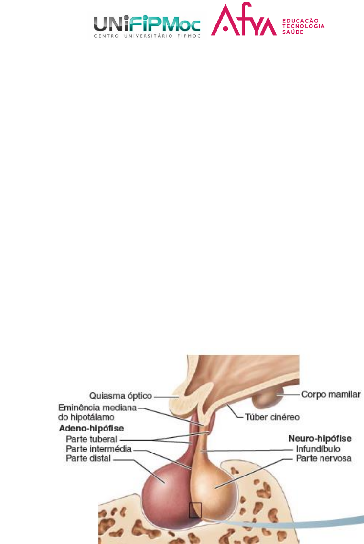 CENTRO UNIVERSITÁRIO UNIFIPMOC/AFYA - MEDICINA 2º PERÍODO TIC’S: TECNOLOGIAS DE INFORMAÇÃO E COMUNICAÇÃO MARIA FERNANDA SANTOS ANDRADE SEMANA 9: Hipófise. Quais as porções da hipófise e suas peculiaridades? Quais os hormônios de cada uma delas? E sua relação com o hipotálamo? A hipófise é um órgão endócrino importante que secreta pelo menos nove hormônios importantes e se situa imediatamente abaixo do cérebro, na fossa hipofisária, uma depressão na sela turca do osso esfenoide. A hipófise lembra bastante um taco de golfe: a própria glândula forma a cabeça do taco, e o pedículo hipofisário, chamado infundíbulo (“funil”), forma a haste do taco. O infundíbulo conecta-se superiormente a uma parte do hipotálamo chamada tuber cinéreo, situada entre o quiasma óptico, anteriormente, e os corpos mamilares, posteriormente. A hipófise apresenta duas divisões básicas: um lobo anterior, a adeno-hipófise, composto de tecido glandular, e um lobo posterior, a neuro- hipófise, formado por tecido neural e uma parte do cérebro. A adeno-hipófise possui três subdivisões. A maior e a parte distal, a mais anterior. Imediatamente posterior a parte distal está a parte intermédia, e imediatamente superior a ela está a parte tuberal, que envolve o infundíbulo como um tubo. A neuro–hipófise tem duas subdivisões: a parte nervosa, inferiormente, e o infundíbulo. 1. Adeno-hipófise A parte distal contém cinco tipos diversos de células endócrinas que produzem e secretam pelo menos sete hormônios diferentes. Quatro dos hormônios secretados pela adeno- hipófise — tireoestimulante, adrenocorticotropico, folículo-estimulante e luteinizante — regulam a secreção dos hormônios por outras glândulas endócrinas. Esses hormônios chamam-se hormônios trópicos (ou tróficos). Os três hormônios adeno-hipofisários restantes — o hormônio do crescimento, a prolactina e o hormônio melanócito- estimulante — agem diretamente nos tecidos-alvo não endócrinos. Hormônio tireoestimulante (TSH): O TSH é produzido pelas células tireotrópicas. O TSH sinaliza a glândula tireoide para secretar seu próprio hormônio, o hormônio da tireoide, e, assim, acaba controlando a taxa metabólica. Hormônio adrenocorticotrópico (ACTH): O ACTH e o hormônio melanócito- estimulante, descrito em breve, são divididos a partir de uma molécula-mãe comum, produzida pelas células corticotrópicas. O ACTH estimula o córtex da glândula suprarrenal (como seu nome sugere) a secretar hormônios que ajudam o corpo a enfrentar o estresse. Gonadotropinas: O hormônio folículo-estimulante (FSH) e o hormônio luteinizante (LH) são produzidos pelas células gonadotrópicas e, juntos, são chamados gonadotropinas, que agem nas gônadas, estimulando a maturação das células sexuais e induzindo a secreção dos hormônios sexuais. Nas mulheres, o FSH e o LH estimulam a maturação dos folículos ovarianos contendo óvulos e a secreção de androgênios, estrogênios e progesterona pelas células no ovário. Além disso, uma grande quantidade de LH e secretada no meio do ciclo menstrual para induzir a ovulação. Nos homens, o LH sinaliza a secreção de androgênios (principalmente testosterona) pelas células intersticiais nos testículos, e o FSH estimula a maturação dos espermatozoides e a produção de proteína de ligação ao androgênio pelas células nos túbulos formadores de espermatozoide. Prolactina (PRL): A PRL e produzida por células produtoras de prolactina. A PRL visa as glândulas mamarias e estimula a produção de leite. Hormônio melanócito-estimulante (MSH): O MSH e formado a partir da molécula precursora produzida pelas células corticotrópicas. Nos vertebrados mais primitivos, anfíbios e repteis, o MSH estimula os melanócitos a produzir mais melanina, o pigmento responsável pela coloração da pele. Nos seres humanos, o MSH atua no sistema nervoso central (SNC) na supressão do apetite; suas ações fora do SNC são desconhecidas. Hormônio do crescimento (GH): O GH, também chamado hormônio somatotrópico (“que altera o corpo”), e produzido nas células somatotrópicas, o tipo celular mais abundante na adeno-hipófise, e estimula o crescimento do corpo inteiro ao induzir as células a aumentar sua produção de proteínas e ao provocar o crescimento das placas epiteliais do esqueleto. Essas ações ocorrem direta e indiretamente por meio da sinalização do fígado para secretar o fator de crescimento insulina símile 1, que age junto com o GH. 2. Neuro-hipófise A neuro-hipófise, que secreta dois hormônios, faz parte do encéfalo, estruturalmente falando, e consiste em tecido nervoso contendo axônios não mielinizados e células da neuroglia chamadas pituícitos. Seus axônios formam o trato hipotálamo- hipofisário, que surge dos corpos celulares a neuro-hipofise não produz hormônios, apenas armazena e libera os hormônios produzidos no hipotálamo. Ela libera dois hormônios peptídicos: hormônio antidiurético (“inibidor da micção”) e oxitocina (“hormônio do parto”). Hormônio antidiurético: Produzido nos neurônios do núcleo supraóptico, o hormônio antidiurético (ADH), também chamado vasopressina, visa aos rins, que respondem reabsorvendo mais agua e devolvendo-a para a corrente sanguínea. Os detalhes desse processo são descritos no sistema urinário. Desse modo, o ADH ajuda o corpo a reter o máximo possível de liquido quando ocorrem a sede (desidratação) ou a perda hídrica (sangramento grave). Além disso, quando a perda hídrica diminui a pressão arterial, o ADH sinaliza as arteríolas periféricas para constringirem-se, elevando assim a pressão arterial até o nível normal (vasopressina = constritora dos vasos). Oxitocina: A oxitocina, produzida no núcleo paraventricular, induz a contração do musculo liso dos órgãos reprodutores nos homens e nas mulheres. Ainda mais importante, ela sinaliza 