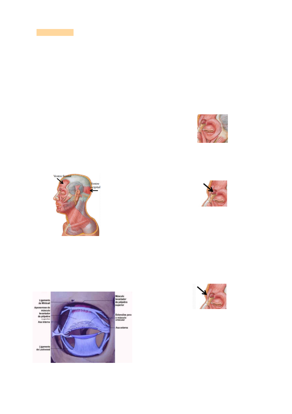 Anatomi� d� múscul� d� cabeç� ➔ Fac�/ Cabeç�: - É a superfície da cabeça, fronte (região da testa) e mento, de uma orelha a outra; - Determina a identidade do ser humano; - Determina características patológicas; - Forma-se completamente por volta dos 7 anos. - Todos os músculos da expressão facial são derivados do segundo arco faríngeo e são inervados pelo nervo facial. ● M. Occipitofrontal: Maior músculo da cabeça; - M. epicrânio ; - Aponeurose epicrânica; (entre um ventre e outro) - 2/3 da linha nucal superior do osso occipital e parte mastóidea do temporal; ⇩ - Pele do supercílio e da fronte; (O ventre frontal, e quando contraímos o ventre frontal que é o que possui maior atividade, apresenta como ação:) - Levanta as sobrancelhas enrugando a testa como em surpresa; ● M. Levantador da pálpebra superior: - Osso esfenóide; (+ profundo, passa por cima do globo ocular) ⇩ - Se insere na aponeurose do septo orbital, tarso superior; (que fica em cima da pálpebra) - Abertura dos olhos; ● M. Orbicular do olho: Porções: - Palpebral; (Quando contraído tem uma ação de fechamento suave) - Orbital; (contraído tem uma ação de fechamento com força) - Lacrimal; (quando contraído tem uma ação de expulsão de lágrimas) - Osso frontal; maxila (se origina) ⇩ - Rafe palpebral lateral; (se insere nessa pequena faixa tendinosa que encontra-se na lateral do olho) - Fechamento do olho suavemente ou com força. ● M. Corrugador do supercílio: - Osso frontal; (se origina) - Pele profunda do supercílio; (se insere) ⇩ - Franzimento das sobrancelhas; (expressão de dúvida) ● Músculos do nariz: ● M. prócero: Tanto superior, quanto medial ao ventre frontal do músculo hipocôndrio; - Face aponeurótica que cobre o osso nasal e cartilagem nasal; (origem) ⇩ - Pele sobre a parte mais inferior da fronte entre os supercílios; (inserção) - Pregueamento da ponte do nariz, traciona a pele para cima; (expressão de nojo) ● M. Nasal: Partes: Posicionado praticamente em cima dos ossos nasais; - Transversal; (estreita a abertura das narinas) - Alar; (alargar a abertura das narinas) - Maxila (se origina - as duas partes) ⇩ - Aponeurose sobre a ponte do nariz; pele da ponta do nariz; (se insere) - Estreitar as narinas/ Alargar as aberturas das narinas; ● M. Depressor do septo nasal: - Maxila; (se origina) ⇩ - Septo nasal: cartilagem alar; (se insere) - Estreitar as narinas; ● Músculos da boca : ● M. orbicular da boca: Principais músculos da boca, com fibras circulares; - Maxila e mandíbula mediais; pele perioral; ângulo da boca; (Origens) ⇩ - Mucosa dos lábios; (inserção) - Fechamento dos lábios; protrusão dos lábios; movimentos de beijar, assobiar, sugar, beber e falar. ● M. Levantador do lábio superior: - Órbita; maxila; osso zigomático; (se origina) ⇩ - Lábio superior; (insere-se) - Protrai o lábio superior, como para mostrar a gengiva superior; ● M. Levantador do ângulo da boca: Mais profundo à vista do M. superior da boca; - Maxila (fossa canina); (origem) ⇩ - Pele do ângulo da boca; (inserção) - Eleva o ângulo da boca (sorriso); ● M. Zigomático maior: + lateral de quer o osso zigomático menor; - Osso zigomático; (origina) ⇩ - Orifício da boca; (insere) - Traciona o ângulo da boca para cima e lateralmente (gargalhada); ● M. Zigomático menor: + medial - Osso zigomático; (origina) ⇩ - Orbicular da boca do lábio superior; (insere-se na altura do lado superior da boca) - Traciona o ângulo da boca para cima e para fora; ● M. Abaixador do lábio inferior: - Platisma (região que recobre superficialmente a região da mandíbula e pescoço) e parte ântero lateral do corpo da mandíbula; (origina) ⇩ - Pele do lábio inferior; (insere) - Traciona o lábio inferior e ângulo da boca para baixo e para fora. ● M. bucinador: - Envolvido no processo digestório; - Processos alveolares da maxila e da mandíbula; (origina) ⇩ - Ângulo da boca; orbicular da boca; (insere) @Destrinchando.a.odontologia - Compressão das bochechas; ● M. risório: risadinha de boca fechada - Fáscia sobre o m. masseter; (origina) ⇩ - Pele do ângulo da boca; (insere) - Traciona o ângulo da boca para trás, fazendo um sorriso de boca fechada; ● M. mentual: Queixo - Mandíbula ( na altura da fossa incisiva); (origina) ⇩ - Pele do queixo; (insere) - Protrusão do lábio inferior, expressão de zangado; ● M. Abaixador do ângulo da boca: - Mandíbula (linha oblíqua - mais lateral); (origina) ⇩ - Ângulo da boca; (insere) - Traciona para baixo o ângulo da boca, expressão de triste; ● Músculos da mastigação: São os músculos que vão movimentar a mandíbula, no sentido de tracionar a mandíbula de cima para baixo para que os dentes possam triturar o alimento para ser ingerido; ● Masseter: Porções: - Superficial; - Intermediária; (+ difícil de visualizar) - Profunda; - Maxila; arco zigomático; (origem) ⇩ - Ramo da mandíbula; (inserção) - Eleva a mandíbula, fechando a boca. ● M. temporal: - Fossa temporal e superfície profunda da fáscia temporal; (origem) ⇩ - Processo coronóide e ramo da mandíbula; (inserção) - Elevação da mandíbula; contribui na retração da mandíbula; ● M. Pterigóideo lateral: + lateralizado Partes: - Ventre superior; - Ventre inferior; - Osso esfenóide (asa maior); maxila; (origem) ⇩ - Colo da mandíbula e ATM; (inserção) - Protrusão e abaixamento da mandíbula ou lateralização (unilateral). @Destrinchando.a.odontologia ● M. Pterigóideo medial: (+profundo, +interno em relação a topografia craniana) - Ossos esfenóide e palatino; maxila; (origem) ⇩ - Ramo da mandíbula; (inserção) - Ao se contrair em um conjunto (pterigóideo esquerdo e direito) promove a elevação e protrusão da mandíbula; lateralização - movimento oposto do pterigóideo lateral(unilateral). *A maxila e o arco zigomático foram quebrados para que possamos observ