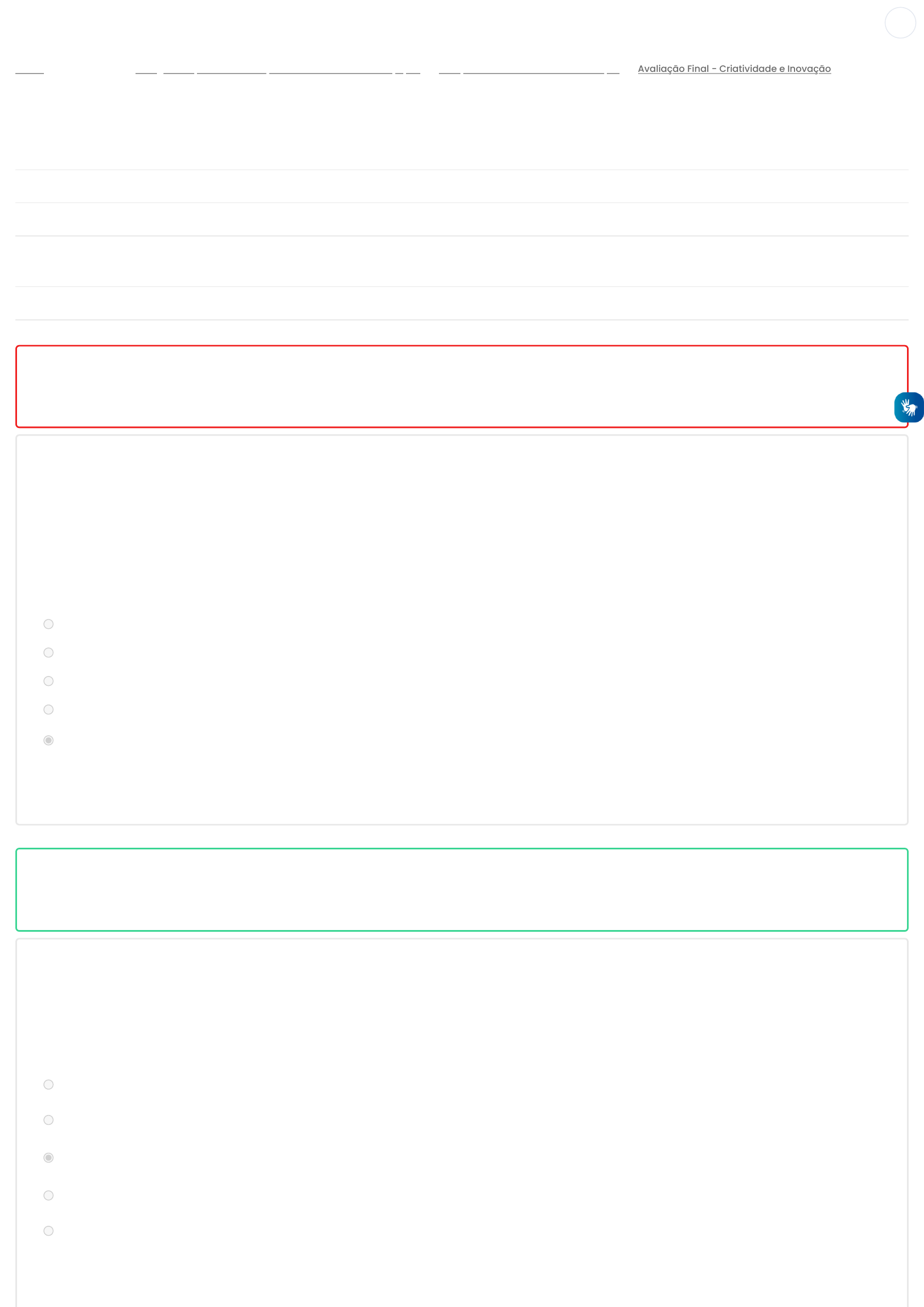 - Meus cursos - - - Painel Pós-graduação em Liderança e Desenvolvimento de Equipes Disciplina 07 - Criatividade e Inovação Avaliação Final - Criatividade e Inovação Iniciado em Friday, 16 Dec 2022, 11:47 Estado Finalizada Concluída em Friday, 16 Dec 2022, 12:04 Tempo empregado 17 minutos 8 segundos Avaliar 7,0 de um máximo de 10,0(70%) Questão 1 Incorreto Atingiu 0,0 de 1,0 A inovação é o motor do desenvolvimento no século XXI. Se, antes, a redução de custos era vista como uma maneira de obter vantagem competitiva, hoje, é a inovação a maior promotora da competitividade entre as organizações. Ela deve ser encarada como um processo gerenciável, que passa pelas etapas de geração de ideias, seleção das melhores, prototipagem e comercialização. Neste sentido, a inovação é um conceito econômico, pois só se realiza quando_______________________. Assinale a resposta que preenche corretamente a lacuna: a. Capitalizada. b. Comercializada. c. Administrada. d. Identificada. e. Mensurada. A resposta correta é: Comercializada. Questão 2 Correto Atingiu 1,0 de 1,0 Inovação e criatividade são dois conceitos que, apesar de próximos, são diferentes em seus significados. Diferentemente das máquinas e de boa parte dos seres vivos, somos dotados de uma inteligência criativa que é capaz de fazer escolhas a partir da observação da realidade. Assim, dentre as alternativas, indique o significado de criatividade. a. São as ideias que precisam de um certo tempo de maturação, sendo importante compartilhá-las com pessoas que refletem e estudam partes complementares àquilo que queremos realizar. b. Compreendem as ideias mais importantes, aquelas que passam um bom tempo dormentes, hibernadas. c. A criatividade é um estado mental com potencial de gerar alguma inovação. A criatividade engloba o potencial que temos de gerar novas ideias, que podem se apresentar de diversas maneiras. d. É outra ideia que também estava amadurecendo na mente de outra pessoa. e. Pode ser entendida como a primeira percepção humana sobre algum fenômeno que naturalmente se desenvolveria em condições ideais, mesmo sem nossa intervenção. A resposta correta é: A criatividade é um estado mental com potencial de gerar alguma inovação. https://ava.cenes.com.br/my/ https://ava.cenes.com.br/course/view.php?id=7 https://ava.cenes.com.br/course/view.php?id=7§ion=9 https://ava.cenes.com.br/mod/quiz/view.php?id=1763 Questão 3 Correto Atingiu 1,0 de 1,0 A inovação pode estar direcionada a pesquisa e ao desenvolvimento de produtos ou serviços, o que permite que existem inúmeros modelos de gestão da inovação, que são adaptados a cada modelo de organização, porém o processo de gestão da inovação passa basicamente por quatro fases, sendo elas: a. Desenvolvimento, Teste, Implantação e Planejamento. b. Geração de ideias, Desenvolvimento, Implantação e Avaliação. c. Geração de ideias, Teste, Desenvolvimento e Avaliação. d. Geração de ideias, Desenvolvimento, Implementação e Difusão. Independente a estrutura e do modelo de empresa, o processo de gestão da inovação passa por quatro fases, iniciando pela geração de ideias, que serão desenvolvidas pra tornarem-se uma inovação, sendo então implantadas e posteriormente difundidas. e. Desenvolvimento, Teste, Implantação e Difusão. A resposta correta é: Geração de ideias, Desenvolvimento, Implementação e Difusão. Questão 4 Correto Atingiu 1,0 de 1,0 Alguns fatores se relacionam aos objetivos e efeitos de cada tipo de inovação. Assim, desenvolver produtos não agressivos ao meio ambiente seria uma proposição relevante para: a. Inovação organizacional. b. Inovação de produto. Alguns fatores podem até representar uma tipologia conjunta de inovação, a exemplo de aumentar a parcela de mercado ou a entrada em novos mercados. Esses fatores combinados podem ser relevantes para inovações de produto e de marketing. No entanto, desenvolver produtos não agressivos ao meio ambiente é relevante para uma inovação de produto apenas, apesar de alguns considerarem a sustentabilidade e a responsabilidade social uma política de marketing. c. Inovação de marketing. d. Não é considerado processo de inovação. e. Inovação de processo. A resposta correta é: Inovação de produto. Questão 5 Correto Atingiu 1,0 de 1,0 Em 14 de dezembro de 2017, por meio da Resolução n. 2.178, o Conselho Federal de Medicina considerou éticas as plataformas de assistência médica domiciliar cuja prestação de serviços seja contratada por aplicativos móveis ou similares. Sob a perspectiva das prestadoras de serviço, podemos considerar esse tipo de inovação como: a. Inovação de comunicação. b. Inovação de pessoas. c. Inovação de produto. Trata-se de uma inovação de serviços, por considerar um serviço novo no mercado; portanto, é uma inovação de produto (bens ou serviços). Devemos lembrar que inovação também pode ser uma melhoria em um produto ou serviço. d. Inovação de estruturas. d. Inovação de estruturas. e. Inovação de marketing. A resposta correta é: Inovação de produto. Questão 6 Incorreto Atingiu 0,0 de 1,0 A inovação, a criatividade e o desenvolvimento econômico relacionam-se. Dentre as alternativas, uma delas apresenta essa relação. Indique qual a proposição correta. a. Uma inovação implica impactos econômicos justamente por trazer elementos novos que geram riqueza, que, por sua vez, geram mais oportunidades. b. Quando há novidade ou melhoria na embalagem, no posicionamento de mercado, na forma como o produto é comercializado e nas estratégias de venda de determinado produto ou serviço. c. Ocorre quando as empresas ou os inventores disponibilizam para a sociedade, como o próprio nome diz, produtos ou serviços novos ou já conhecidos, mas com melhorias inéditas. d. Representam uma mudança drástica, ou seja, um total rompimento com a maneira de consumir um d