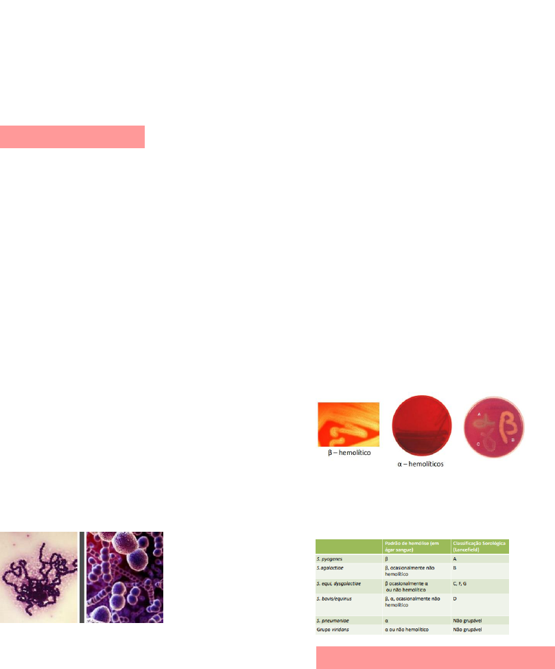 STREPTOCOCCUS FISIOLOGIA E ESTRUTURA Os Streptococcus é um grupo diverso de cocos Gram-positivos tipicamente dispostos aos pares ou em cadeias.. A maioria das espécies é anaeróbia facultativa, imóveis, não espurulentas e com maior exigência nutricional, cujo crescimento depende da faixa de 37°c Fermentam os carboidratos, o que resulta na produção de ácido lático e, ao contrário das espécies de Staphylococcus, os estreptococos são catalase-negativos CLASSIFICAÇÃO A classificação das mais de 100 espécies dentro do gênero Streptococcus é complicada, sendo utilizados três diferentes esquemas que se complementam: I: Propriedades sorológicas Separação nos grupos de Lancefield (originalmente de A a W); É realizada a classificação dos estreptococos beta hemolíticos, baseado em antígenos específicos (carboidratos da parede celular) II: Padrões hemolíticos Hemólise completa (beta [β]), hemólise incompleta (alfa [α]), e sem hemólise (gama [γ]); III: Propriedades bioquímicas (fisiológicas). STREPTOCOCCUS PYOGENES S. pyogenes causa uma variedade de doenças supurativas e não supurativas. Embora esse micro-organismo seja a causa mais comum de faringite bacteriana, a notoriedade de S. pyogenes, popularmente chamado de “bactéria carnívora”, é resultado de sua associação como a causa de mionecroses fatais COCOS GRAM POSITIVOS DE INTERESSE CLÍNICO E ESTREPTOCOCOS FISIOLOGIA E ESTRUTURA O esqueleto estrutural básico da parede celular é a camada de peptidoglicano, que tem composição semelhante à encontrada em outras bactérias Gram-positivas A proteína M é o principal antígeno tipo-específico associado a cepas virulentas e consiste em duas cadeias polipeptídicas complexadas em uma alfa-hélice Outros componentes importantes na parede celular de S. pyogenes incluem proteínas de superfície semelhantes à proteína M, ácido lipoteicoico e proteína F. Algumas cepas de S. pyogenes apresentam uma cápsula externa de ácido hialurônico que é antigenicamente indistinguível do ácido hialurônico do tecido conjuntivo dos mamíferos. As cepas encapsuladas têm maior probabilidade de causar infecções sistêmicas graves, pois a cápsula protege a bactéria da eliminação por fagocitose. PATOGÊNESE E IMUNIDADE A virulência dos estreptococos do grupo A é determinada pela capacidade do micro-organismo de evitar a opsonização e a fagocitose, de aderir e invadir as células hospedeiras e de produzir uma variedade de toxinas e enzimas. EPIDEMIOLOGIA Os estreptococos do grupo A podem colonizar a orofaringe de crianças sadias e de adultos jovens, na ausência de doença clínica Em geral, a doença por S. pyogenes é causada por cepas recém-adquiridas, que podem estabelecer uma infecção de faringe ou de pele antes que anticorpos específicos sejam produzidos ou que micro-organismos competidores sejam capazes de se proliferar. A faringite causada por S. pyogenes é primariamente uma doença que acomete crianças entre 5 e 15 anos, mas crianças em outras faixas etárias e adultos também são suscetíveis. O patógeno é disseminado de pessoa a pessoa através de perdigotos. Aglomerações, tais como em salas de aula e creches, aumentam a oportunidade de disseminação do micro-organismo, particularmente durante os meses de inverno. As infecções de tecidos moles (p.ex., piodermia, erisipela, celulite, fascite) são tipicamente precedidas da colonização inicial da pele com estreptococos do grupo A, sendo os micro-organismos posteriormente introduzidos em tecidos superficiais ou profundos através de uma descontinuidade da pele. DOENÇAS CLÍNICAS FARINGITE A faringite geralmente se desenvolve 2 a 4 dias após a exposição ao patógeno, com um início abrupto de dor de garganta, febre, mal-estar e cefaleia. A faringe posterior pode se apresentar eritematosa, com um exsudato, e com proeminente linfadenopatia cervical Em 1 a 2 dias após os sintomas clínicos iniciais de faringite se desenvolverem, surge uma erupção eritematosa difusa na região superior do tórax, que se espalha para as extremidades. A área ao redor da boca é geralmente poupada (palidez perioral), bem como a palma das mãos e a sola dos pés. Inicialmente, uma camada branco-amarelada recobre a língua, que mais tarde, com o desenvolvimento da escarlatina, se desprende, revelando abaixo uma superfície vermelha e inflamada (“língua de morango”). A erupção, que clareia quando pressionada, é mais bem visualizada no abdome e nas dobras da pele (linhas de Pastia). A erupção desaparece após 5 a 7 dias e é seguida de descamação da camada superior da pele PIODERMIA OU IMPETIGO Piodermia (impetigo) é uma infecção de pele (“derme”) confinada, purulenta (“pio”) que afeta principalmente áreas expostas (p.ex., face, braços, pernas). A infecção se inicia quando a pele é colonizada com S. pyogenes, após o contato direto com pessoas infectadas ou fômites contaminados. O micro-organismo é introduzido no tecido subcutâneo através de uma descontinuidade da pele (p.ex., arranhão, picada de inseto). As pápulas se desenvolvem, progridem para pústulas (vesículas cheias de pus) e então se rompem e formam uma crosta na superfície. ERISIPELA Erisipela (erythros, “vermelho”; pella, “pele”) é uma infecção aguda da pele. Os pacientes apresentam dor localizada, inflamação (eritema, calor), aumento dos linfonodos e sinais sistêmicos (calafrios, febre, leucocitose). A área da pele envolvida fica tipicamente elevada, diferenciando-se das regiões não afetadas É precedida de infecções do trato respiratório ou da pele, em camada mais profunda (derme), com S. pyogenes CELULITE Ao contrário da erisipela, a celulite envolve tipicamente tanto a pele quanto os tecidos subcutâneos mais profundos, e a distinção entre a região infectada da não infectada não é clara. Como na erisipela, são observados sinais de inflamação local e sistêmica. Pode s