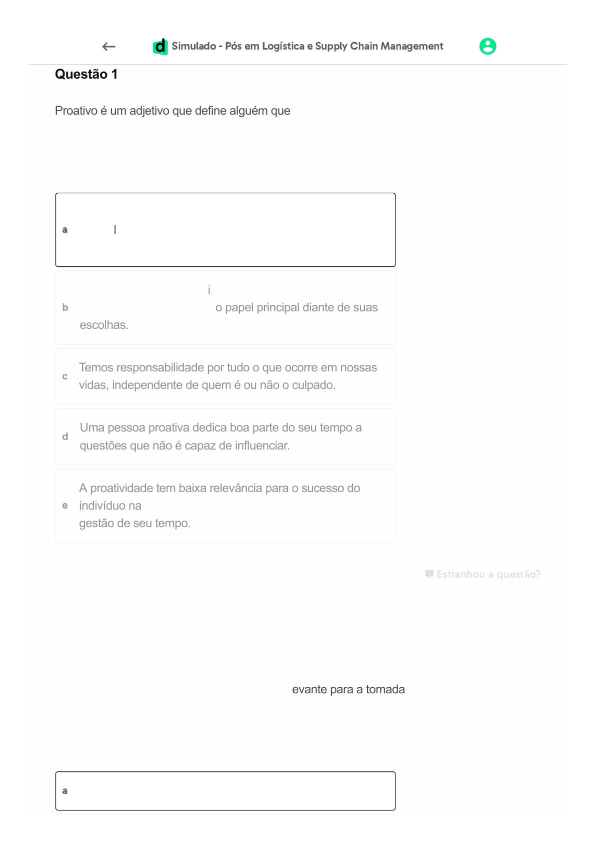 09/07/2021 Faça grátis o Simulado Enem 2020 com TRI | Descomplica https://simulado.descomplica.com.br/enem/simulado-pos-em-logistica-e-supply-chain-management-343ae8/simulado-pos-em-logistica-e-supply-… 1/35 Simulado - Pós em Logística e Supply Chain Management Questão 1 Proativo é um adjetivo que define alguém que age antecipadamente, evitando ou resolvendo situações e problemas futuros. A proatividade, o ato da pessoa proativa, é uma das grandes qualidades que várias empresas e instituições buscam na personalidade de um indivíduo. Dentre todos os aspectos que permeiam o conceito de proatividade, é correto afirmar que: a O comportamento proativo nos leva a responder a estímulos negativos de acordo com nossas emoções e sentimentos, sem levar em consideração nossos princípios. Estranhou a questão? Questão 2 A definição de metas é fator extremamente relevante para a tomada diária de decisões. De acordo com o tempo necessário para que um objetivo seja atingido, as metas podem se dividir entre curto, médio e longo prazos. Assinale a alternativa que melhor apresenta a relação entre TEMPO, ATIVIDADE e AÇÃO no que diz respeito a METAS. a Curto prazo: Ano / Organização de rotinas / Executar b O meio externo é determinante na tomada de decisões, não cabendo ao indivíduo o papel principal diante de suas escolhas. c Temos responsabilidade por tudo o que ocorre em nossas vidas, independente de quem é ou não o culpado. d Uma pessoa proativa dedica boa parte do seu tempo a questões que não é capaz de influenciar. e A proatividade tem baixa relevância para o sucesso do indivíduo na gestão de seu tempo. https://simulado.descomplica.com.br/provas/simulado-pos-em-logistica-e-supply-chain-management-343ae8 https://descomplica.com.br/configuracoes 09/07/2021 Faça grátis o Simulado Enem 2020 com TRI | Descomplica https://simulado.descomplica.com.br/enem/simulado-pos-em-logistica-e-supply-chain-management-343ae8/simulado-pos-em-logistica-e-supply-… 2/35 Estranhou a questão? Questão 3 O excesso de reuniões torna cada vez menos produtiva a rotina de trabalho das empresas. Qual das atividades abaixo NÃO apresenta uma atividade que melhora a eficácia das reuniões? b Utilize ao máximo o tempo da reunião para debates colaborativos. Delegação de tarefas podem ser comunicadas de forma individual. b Curto prazo: Semanas / Verificação e priorização / Sonhar c Médio prazo: Ano / Verificação e priorização / Construção de um propósito d Médio prazo: Vida / Organização de rotinas / Executar e Longo prazo: Vida / Construção de legado / Sonhar a Jamais convoque uma reunião sem pauta definida. 09/07/2021 Faça grátis o Simulado Enem 2020 com TRI | Descomplica https://simulado.descomplica.com.br/enem/simulado-pos-em-logistica-e-supply-chain-management-343ae8/simulado-pos-em-logistica-e-supply-… 3/35 Estranhou a questão? Questão 4 A semana é a melhor unidade de tempo para se fazer um planejamento de rotina. Com isso, adquirir o hábito de realizar um PLANEJAMENTO SEMANAL é de fundamental importância na gestão eficaz do tempo. Qual das alternativas abaixo está alinhada a atividade de planejar sua semana antes dela começar? b Dimensione tarefas e compromissos, evitando planejar 100% de seu tempo. Estranhou a questão? c Não estabeleça um horário de término para que o máximo possa ser debatido. d Eleja um mediador para definir quem fala e o tempo necessário para cada tema. e não convoque o maior número de pessoas possível para as reuniões. a Planejamento semanal é cansativo e tem um tempo de realização muito elevado. c As tarefas delegadas não precisam de acompanhamento. Uma vez destinada a um terceiro, cabe a ele 100% da responsabilidade sobre a mesma. d Não é necessário analisar a semana anterior no momento de planejar a semana atual. e O planejamento semanal pode ser realizado a qualquer momento da semana, tendo a mesma eficácia. 09/07/2021 Faça grátis o Simulado Enem 2020 com TRI | Descomplica https://simulado.descomplica.com.br/enem/simulado-pos-em-logistica-e-supply-chain-management-343ae8/simulado-pos-em-logistica-e-supply-… 4/35 Questão 5 É possível separar os tipos de planejamento de acordo com o prazo. Com isso, define-se: CURTÍSSIMO PRAZO: acompanhamento diário. CURTO PRAZO: planejamento semanal. MÉDIO PRAZO: menos de um ano para realizar. LONGO PRAZO: mais de um ano para realizar. A qual dos planejamentos acima está relacionada a construção de um legado, de uma história de vida como referência para os demais? d Longo prazo Estranhou a questão? Questão 6 Assinale a alternativa falsa sobre o que uma empresa pode ganhar ao desenvolver um bom clima e ambiente numa organização empresarial: a Curtíssimo prazo b Curto prazo c Médio prazo e Não há relação alguma entre construção de legado e planejamento de tempo a Maior e melhores resultados empresariais b Maior atratividade de profissionais c Clientes mais satisfeitos d Maior retenção dos talentos 09/07/2021 Faça grátis o Simulado Enem 2020 com TRI | Descomplica https://simulado.descomplica.com.br/enem/simulado-pos-em-logistica-e-supply-chain-management-343ae8/simulado-pos-em-logistica-e-supply-… 5/35 e Ser menos inovadora Estranhou a questão? Questão 7 Assinale com um X a alternativa correta sobre a definição de cultura organizacional c É o conjunto de hábitos e crenças estabelecidos através de normas, valores, atitudes e expectativas somente praticados pelos líderes da organização. Estranhou a questão? Questão 8 Entre as afirmativas abaixo assinale a alternativa que não está associada a definições de PODER: a É o conjunto de hábitos e crenças estabelecidos através de normas, valores, atitudes e expectativas compartilhados por todos os membros da organização. b É o conjunto de hábitos e crenças estabelecidos através de regras rígidas e autoritárias criadas pelo seu fundador. d É o conjunto de vícios pra