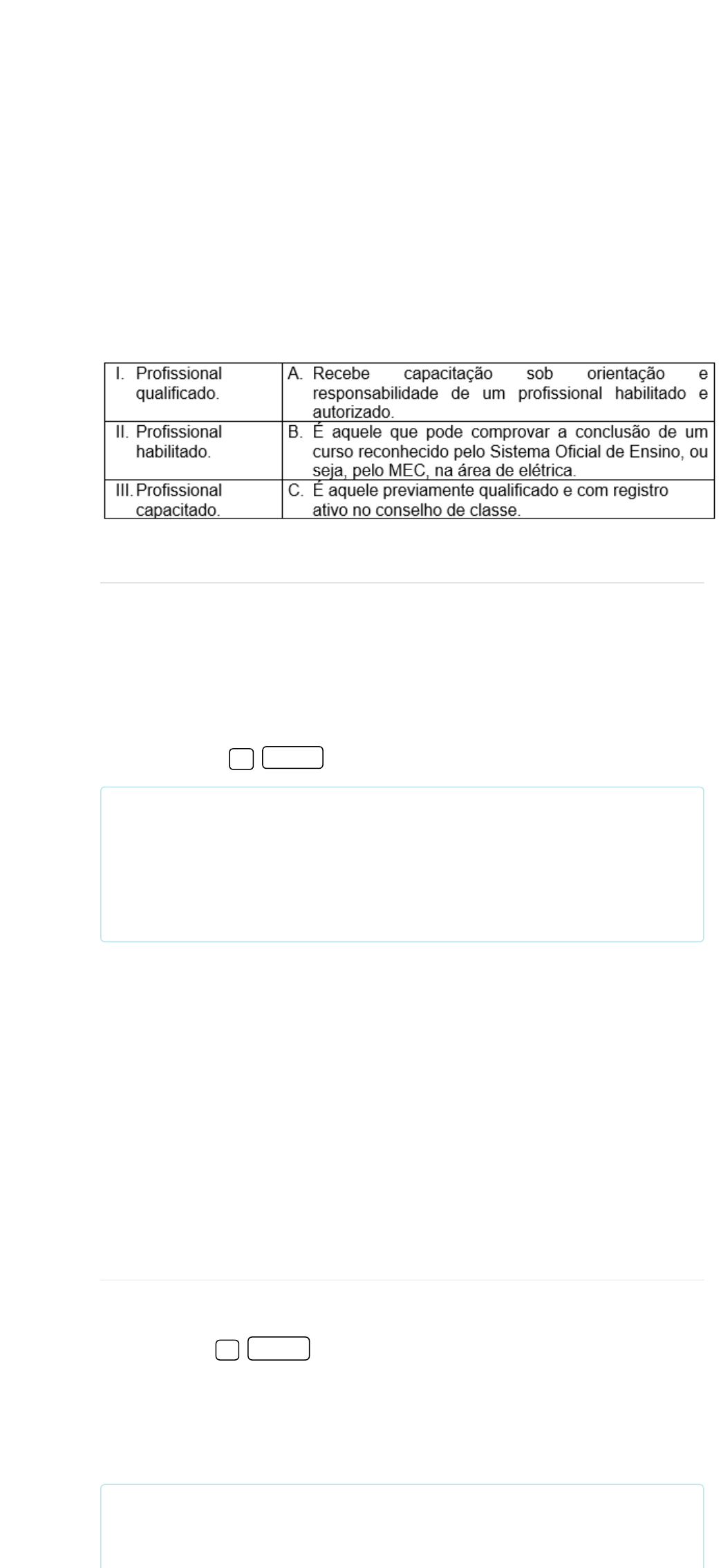 16/01/2023 10:59 Cosmos · Cosmos https://kroton.platosedu.io/lms/m/aluno/disciplina/index/2693637/5059093 1/5 Prevenção e controle de riscos em máquinas, equipamentos e instalações II Professor(a): Joubert Rodrigues dos Santos Júnior (Mestrado acadêmico) 1) 2) Prepare-se! Chegou a hora de você testar o conhecimento adquirido nesta disciplina. A Avaliação Virtual (AV) é composta por questões objetivas e corresponde a 100% da média final. Você tem até cinco tentativas para “Enviar” as questões, que são automaticamente corrigidas. Você pode responder as questões consultando o material de estudos, mas lembre-se de cumprir o prazo estabelecido. Boa prova! No Brasil, as atividades relacionadas com eletricidade somente podem ser executadas por profissionais que comprovarem sua capacitação, qualificação ou habilitação na área de elétrica. Referente a estes profissionais, associe as duas colunas. Assinale a alternativa que traz a associação correta entre as duas colunas: Alternativas: I – A; II – B; III – C. I – C; II – B; III – A. I – A; II – C; III – B. I – B; II – A; III – C. I – B; II – C; III – A. CORRETO Código da questão: 66136 O choque elétrico é uma das principais causas de morte no Brasil relacionadas a atividades com eletricidade. Sobre o choque elétrico, assinale as afirmações a seguir com V (verdadeiro) ou F (falso): ( ) A gravidade do choque elétrico pode variar de pessoa para pessoa. ( ) Queimadura é um tipo de lesão ocasionada pelo choque elétrico. ( ) A contração muscular somente é possível se a corrente elétrica passar pelo coração. ( ) Toda vez que uma corrente elétrica circula por uma pessoa é caracterizado o choque elétrico. ( ) O choque elétrico acontece apenas quando o profissional está exposto à umidade. Assinale a alternativa que contenha a sequência correta de V e F: Alternativas: V – V – F – V – F CORRETO F – V – F – V – F. V – F – F – F – V. F – F – V – F – V. V – F – V – F – V. Resolução comentada: Profissional qualificado é aquele que pode comprovar a conclusão de um curso reconhecido pelo sistema oficial de ensino na área de elétrica. O profissional habilitado é aquele previamente qualificado e com registro ativo no conselho de classe. Profissional capacitado é aquele capacitado por um profissional habilitado. Resolução comentada: 16/01/2023 10:59 Cosmos · Cosmos https://kroton.platosedu.io/lms/m/aluno/disciplina/index/2693637/5059093 2/5 3) 4) 5) Código da questão: 66135 Manter a distância de segurança é uma recomendação de segurança prevista pela NR- 10. Supondo que uma equipe de manutenção realizará uma atividade em um painel alimentado com uma tensão de 380 V e que exista a necessidade de isolar a área, qual a distância mínima recomendada entre a zona controlada e a zona livre para garantir a livre circulação? Fonte: BRASIL. Ministério do Trabalho e Emprego. NR-10 – Segurança em instalações e serviços em eletricidade. Brasília: MTE, 2004. Alternativas: 0,15 m. 1,48 m. 0,85 m. 0,70 m. CORRETO 1,20 m. Código da questão: 66139 A escolha do método adequado para a elaboração de uma análise de risco é importante para garantir a confiabilidade dos dados. Para as atividades relacionados à elétrica, o método ERA foi desenvolvido com base em qual metodologia? Alternativas: Árvore de risco. Análise preliminar de risco (APR). Matriz de risco. Harzop. Hazard Rating Number (HRN). CORRETO Código da questão: 66154 Sabe-se que a _______ é a principal ferramenta para os profissionais da área de segurança do trabalho, e é através dela que _________ são elaborados visando à prevenção de acidentes e doenças ocupacionais. Nas atividades relacionadas à eletricidade, ela é uma grande aliada na composição de um parecer técnico referente ao direito ou não do adicional de ________ por parte dos profissionais que interagem com eletricidade. Assinale a alternativa que completa adequadamente as lacunas. Alternativas: A primeira, a segunda e a quarta afirmativas são verdadeiras. Terceira – A contração muscular acontece sempre que a corrente elétrica circula pelo corpo humano, independentemente da localização. Quinta – O choque elétrico pode ocorrer em qualquer situação, desde que exista contato com um circuito energizado. Resolução comentada: A tensão nominal do sistema é de 380 V, portanto a NR-10 recomenda uma distância entre a zona controlada e zona livre de 0,70 m. Resolução comentada: O método ERA é baseado na metodologia HRN, na qual os índices de frequência de exposição, o grau de lesão e a probabilidade de ocorrência foram adaptados para os trabalhados relacionados com eletricidade. 16/01/2023 10:59 Cosmos · Cosmos https://kroton.platosedu.io/lms/m/aluno/disciplina/index/2693637/5059093 3/5 6) 7) Apreciação de risco; cronogramas; periculosidade. Análise de risco; planos de ação; periculosidade. CORRETO Análise de risco; planos de ação; insalubridade. Análise de risco; cronogramas; insalubridade. Percepção; planos de ação; periculosidade. Código da questão: 66155 O Brasil é o país com maior incidência de raios no mundo. De acordo com a Abracopel, em 2020, as descargas atmosféricas foram responsáveis por 47 mortes no Brasil (ABRACOPEL, 2021). O Sistema de SPDA reduz o risco de acidentes. Fonte: ABRACOPEL. Associação Brasileira de Conscientização para Perigos com Eletricidade. Anuário Estatístico: Acidentes de origem elétrica ano base 2020. São Paulo: ABRACOPEL, 2021. Leia e associe as duas colunas referentes aos subsistemas de um SPDA: Assinale a alternativa que traz a associação correta entre as duas colunas: Alternativas: I – B; II – A; III – C. I – C; II – A; III – B. CORRETO I – C; II – B; III – A. I – A; II – C; III – B. I – A; II – B; III – C. Código da questão: 66143 A NR-10 exige que haja um profis
