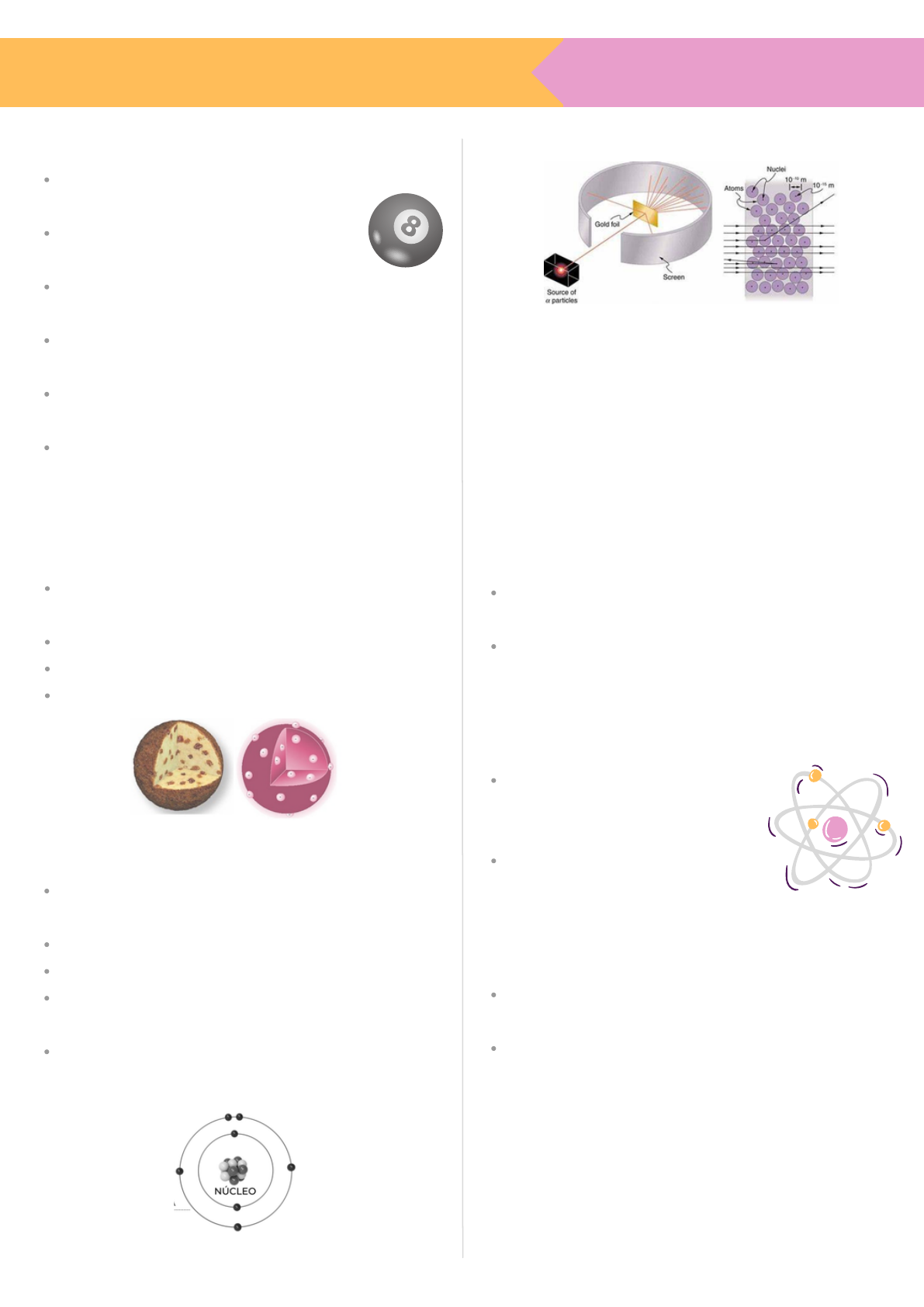 Apresenta os elétrons distribuídos em camadas ao redor de um núcleo As órbitas possuem energias definidas ''órbita planetária" descoberta do núcleo através do experimento da folha de ouro não explica como os elétrons não perdem energia ao girarem em torno do núcleo Resolve as falhas do modelo de Rutherford quanto a estabilidade dos elétrorns Os elétrons ocupam camadas eletrônicas com valores pré-definidos de energia, de maneira que a energia do elétron em uma camada se mantém constante ao longo de sua movimentação As camadas eletrônicas são mais energéticas conforme mais distantes do núcleo Os elétrons podem transitar entre as camadas apenas por meio da absorção ou liberação da diferença de energia existente entre duas camadas Esse salto quando libera energia a faz em forma de luz (fogos de artifício) Os elétrons apenas transitam para uma camada de maior energia ao absorver energia de uma fonte externa, situação em que ficam instáveis. Para retomar a estabilidade, os elétrons retornam ao seu nível inicial Descreve o átomo como uma bola maciça e indivisível, a "bola de bilhar" um elemento químico tem átomos idênticos. elementos químicos diferentes possuem átomos com propriedades distintas. Um elemento é definido pelo peso do seu átomo. Ao formar substâncias, os átomos não se alteram. "Uma reação química ocorre mediante a simples reorganização dos átomos, os quais mantêm a sua identidade." @MILENACORTEZ dalton: modelos otomicos o experimento constatou que a maioria dos feixes de partículas alfa (α) que foram bonbardeados na folha de ouro não eram desviados. Porém, alguns desviavam bruscamente quando "esbarravam" no núcleo. Constatou-se, portanto, que a maior parte do átomo é "vazio", que o núcleo é muito pequeno e que ele contém praticamente todo o peso do átomo ^ THOMSON: Descobre os raios catódicos (elétrons - carga negativa) massa positiva com particulas negativas "pudim de passas" aqui a ideia de divisibilidade é apresentada rutherford: bohr: