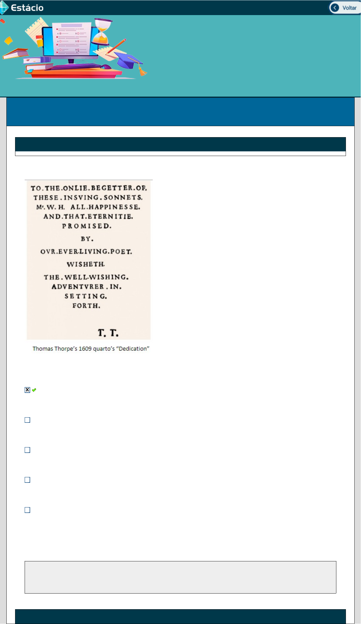 Meus Simulados Teste seu conhecimento acumulado Disc.: LITERATURA INGLESA Aluno(a): JULIA HREISEMNOU MALICHWSKI 202104598769 Acertos: 10,0 de 10,0 21/01/2023 1a Questão Acerto: 1,0 / 1,0 Read the inscription on the Dedication page to Thomas Thorpe's edition of Shakespeare's sonnets. Considering the Dedication page of Thomas Thorpe's 1609 edition of Shakespeare's Sonnets, mark the option which correctly present the mysterious suggestions found there. Since Shakespeare was not directly involved with Thorpe's edition, it is possible that Thorpe himself placed the ''Dedication'' there to obscurely profess his or Shakespeare's love for Mr. W. H., a possible patronage. Since Shakespeare was not directly involved with Thorpe's edition, it is more likely that this was a pirate edition of sonnets which we cannot be certain that were written by Shakespeare himself. Since Shakespeare was not directly involved with Thorpe's edition, there is no supposition whatsoever that can be made out of the Dedication page. Since Shakespeare was directly involved with Thorpe's edition, the Dedication page is a confession of the autobiographical tone of the sonnets. Since Shakespeare was directly involved with Thorpe's edition, the ''only begetter'' of the sonnets is certainly Shakespeare's lover. Respondido em 21/01/2023 00:53:32 Explicação: A resposta certa é: Since Shakespeare was not directly involved with Thorpe's edition, it is possible that Thorpe himself placed the ''Dedication'' there to obscurely profess his or Shakespeare's love for Mr. W. H., a possible patronage. 2a Questão Acerto: 1,0 / 1,0 Sodomy was a capital crime, and fulminations against the act were a staple of polemical literature of all kinds. Antitheatrical tracts assumed that boys who played the women's roles on stage played them in life as well; anti-Catholic invective declared ecclesiastical celibacy to be a cover for institutionalized buggery; judicial indictments for political or religious crimes often included additional charges of sodomy - indeed, sodomy tended to serve as a gloss on whatever the culture considered worst or most threatening: those accused of atheism or sedition were almost invariably declared also to be sodomites. The corollary, however, is that the charge is almost never found in isolation; and, in fact, the legal definition of sodomy was exceedingly narrow. Source: ORGEL, Stephen. ''Introduction''. In: SHAKESPEARE, William. The Sonnets. EVANS, G. Blakemore (ed.). Cambridge: Cambridge University Press, 2006. Mark the alternative which correctly points out why Shakespeare's overtly homoerotical sonnets could be part of this cultural scene. Because Shakespeare was not directly involved with the publication of the 1609 edition, it is possible that he did not want these sonnets to come out in the public. Sodomy was not equivalent to homoeroticism; actually, in Elizabethan England friendship and love between men was a common part of the patronage system. Since sodomy was a capital crime in England during the Elizabethan age, the sonnets participation on this cultural scene can be understood as a moral practice. The court¿s homosexual practices in Elizabeth England surpassed the law against sodomy. Sodomy in poetry was a common trope since it goes back to Greek democracy in which men¿s love for men was part of society. Respondido em 21/01/2023 00:53:54 Explicação: A resposta certa é: Sodomy was not equivalent to homoeroticism; actually, in Elizabethan England friendship and love between men was a common part of the patronage system. 3a Questão Acerto: 1,0 / 1,0 So suggestive, in fact, are the circumstances described here (and elsewhere) [about the Sonnets] that readers will be forever tempted to posit a 'story' for the Sonnets. But if there is a larger story, it is of interest because it is realized in the particular, which is not to say that the Sonnets altogether lack an element of narrative, but that narrative is embedded in the recognition of newly intense emotional exchanges and changes in the imagined relationship. Source: POST, Jonathan F. Shakespeare's Sonnets and Poems: a very short introduction. Oxford: Oxford University Press, 2017. After reading the contextualization above, read the affirmative below. I. Together, the sonnets in Shakespeare's sequence sketch a storyline about the sonneteer. II. Alone, each sonnet reveals a state of mind (and heart) sprung out from the suggested series of events. III. Reading in between sonnets is helpful to establish new connections among the sequence. I, II and III. II a III, only. I, only. II, only. I and III, only. Respondido em 21/01/2023 00:54:26 Explicação: A resposta certa é: I, II and III. 4a Questão Acerto: 1,0 / 1,0 Complete the gaps in the following statements, so that they become true. Shakespeare alluded to a variety of previous works of art and references in his plots, some of which originated in medieval periods. For instance, some characters' villainy mingled with humorous asides originated from (1) _____________. Similarly, the lascivious (2) _____________ in between acts have their roots in the folkloric morris dance. When it comes to Antique literature references, a pervasive archetype is the one of (3) _____________, who encumbers the lovers' relationships. (1) jigs/ (2) Vices/ (3) the blocking father (1) the blocking father/ (2) jigs/ (3) the Vice (1) jigs/ (2) Everyman/ (3) the blocking father (1) Everyman/ (2) Vices/ (3) the blocking father (1) the Vice/ (2) jigs/ (3) the blocking father Respondido em 21/01/2023 00:55:00 Explicação: A resposta certa é: (1) the Vice/ (2) jigs/ (3) the blocking father 5a Questão Acerto: 1,0 / 1,0 Reread part of Othello's speech in court to try to convince the Senate that his love for Desdemona is reciprious. Then, choose the most appropriate option. ''It was my hint to speak-such was my process-/ And of the cannibals that each other eat,/ The Anthropophagi, and men whose heads/ Do grow beneath their shou