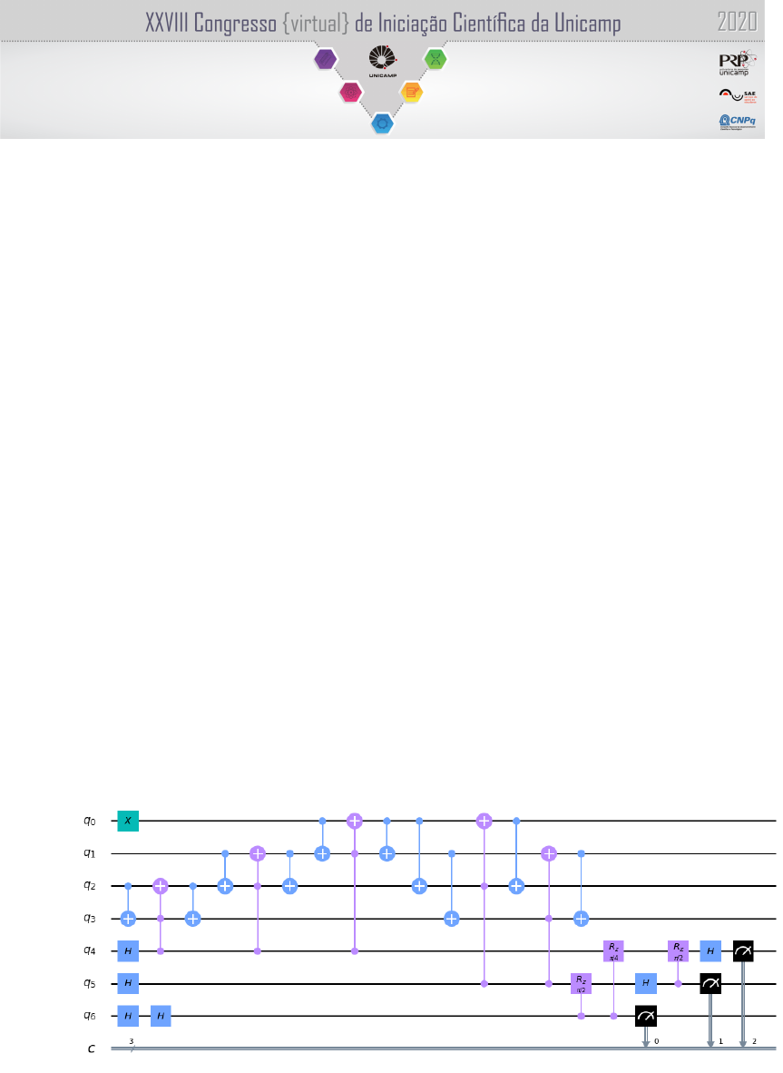 Projeto Principal: “Algoritmo quântico de busca de Grover e de fatoração de Shor: implementação da simulação em computadores clássicos e quânticos” Grande Área de conhecimento: Ciências Exatas e da Terra Área de Conhecimento: Física Subárea de Conhecimento: Física da Matéria Condensada Aluno(a): Daniel Benvenutti (169448) - danielgb23@gmail.com Orientador: Francisco Rouxinol - rouxinol@ifi.unicamp.br Instituição: Instituto de Física Gleb Wataghin, UNICAMP Palavras chaves: Eletrodinâmica Quântica, Computação Quântica e Informação Referente: Relatório XXVIII Congresso de Iniciação Científica da UNICAMP Resumo Resumo do projeto original: Nós apresentamos um projeto de pesquisa fo- cado no desenvolvimento pelo aluno de um conjunto de ferramentas para simular algoritmos quânticos em computadores clássicos e quânticos. Serão tratados e discutidos os conceitos básicos de computação quântica e mecânica quântica, como também a implementação de portas quânticas e o algoritmo de busca de Groover e de Shor. Com a implementação deste projeto é esperado que impor- tantes conceitos de quântica, como medida, funções de onda de muitos corpos, e momento angular, sejam aprofundados como também o estudo de importantes tópicos avançados em física e engenharia. Resumo Ilustrado Computação quântica combina ciência da computação com mecânica quântica, possibilitando a realização de certos cálculos exponencialmente mais rápido do que as contrapartes clássicas, fazendo uso da superposição quântica e emaranha- mento de estados quânticos Neste circuito apresentamos o Algoritmo de Shor para fatorar C=15 com a=2 que foi executado no computador quântico da IBM ibmq 16 melbourne. Neles temos 3 Hadamards de superposição nos qubits do expoente, um circuito de CNOTs e Toffollis para multiplicar a base e o circuito de transformada de Fourier quântica inversa nos qubits do expoente também danielgb23@gmail.com rouxinol@ifi.unicamp.br 1 Atividades Principais Inicialmente desenvolvemos os registradores de N-qubits. Cada registrador guardava a informação do estado composto por 3 sistemas de dois níveis (qubits), descrito por um único estado quântico conjunto |ψ〉. Utilizando estes vetores, pre- paramos algorítimos para preparar o sistema de interesse no estado de interesse. Na segunda etapa, desenvolvemos funções que simulam uma porta quântica (análogo a uma porta lógica), necessárias para operar os qubits. Utilizando os elementos dos vetores de estado e a portas lógicas, a probabilidade de medir um determinado valor pode ser determinado, simulando-se uma medida no sistema quântico. Com estas funções e algorítimos programados, foram preparados os algorítimos de Grover de busca e Shor de fatoração de números inteiros. Ambos funcionaram como esperado. Na última implementamos os algorítimos Groover de busca e Shor de fato- ração de números inteiros no computador quântico da IBM e comparamos com os resultados obtidos em nosso programa. Fornecemos o código utilizando nesta etapa na plataforma GitHub no endereço: https://github.com/Danielgb23/ic_comp_quantica 1.1 Registrador Quântico A primeira parte do projeto e construir o simulador. Para simular o estado de N qubits precisamos de um vetor de 2N elementos. Cada estado nesse vetor representa uma combinação das medidas possíveis dos qubits e superposições das mesmas. A probabilidade de cada medida é representada pelo quadrado do módulo(complexo) de cada elemento do vetor. 1.2 Portas quânticas Uma das portas quânticas mais importantes é a Porta de Hadamard, H. Ela é extremamente interessante, pois coloca um qubit em uma superposição de dois estados. Outra importante porta é a Porta de Fase, S. Ela muda a fase complexa do elemento |1〉 do vetor que descreve o qubit. Portões CNOT são portas quânticas NOT (ou NÃO) controladas e funcionam da seguinte maneira: Há um qubit controlador e um qubit que sofre a operação NOT. Se e somente se o qubit controlador é |1〉 que o outro qubit é invertido . Se o controlador for |0〉 o controlado mantém o seu estado. O qubit controlador não é alterado. Com essa porta podemos fazer o estado de emaranhamento quântico. 1.3 Algoritmo de Groover O algoritmo de Groover é um algoritmo de busca. Dado um vetor de possíveis respostas, procuramos neste vetor, um valor específico, que indica qual é a resposta correta. Com uma algoritmo normal de varredura em um computador clássico no pior caso temos que verificar todos os n elementos. Já no algoritmo de Groover precisamos de apenas √ n buscas. O algoritmo de Groover funciona usando uma técnica chamada amplificação de amplitude. Que tem esse nome pois o algoritmo amplifica a amplitude da resposta no vetor de estados. O construção dele é baseado em dois estágios. Primeiro colocamos todos os qubits em superposição (todas as medidas com mesma probabilidade). Depois 2 https://github.com/Danielgb23/ic_comp_quantica vem o oráculo e o bloco de difusão de Grover. Que temos que repetir juntos π42 Nqubits vezes (arredondado). O oráculo inverte a amplitude quântica da resposta e o bloco de difusão amplifica o que estiver invertido. Em seguida avaliamos o desempenho da simulação do algoritmo de Groover no meu computador. Abaixo os resultados: Qubits tempo 1 1.20s 2 1.15s 3 1.36s 4 3.51s 5 29.33s 6 353.69s Tabela 1: Tempos de simulação de Grover para diferentes números de qubits Depois o algoritmo de Groover foi executado utilizando-se matrizes esparsas. Que são muito úteis nessas simulações, já que as matrizes dos operadores têm muitos zeros. Qubits tempo 1 0.86s 2 0.92s 3 0.91s 4 0.97s 5 1.04s 6 1.16s Tabela 2: Tempos de simulação de Grover para diferentes números de qubits utilizando matrizes esparsas Nota-se a grande melhoria no desempenho e como é possível utilizar um número muito maior de qubits com o mesmo computador. 1.4 Algoritmo de Shor O a