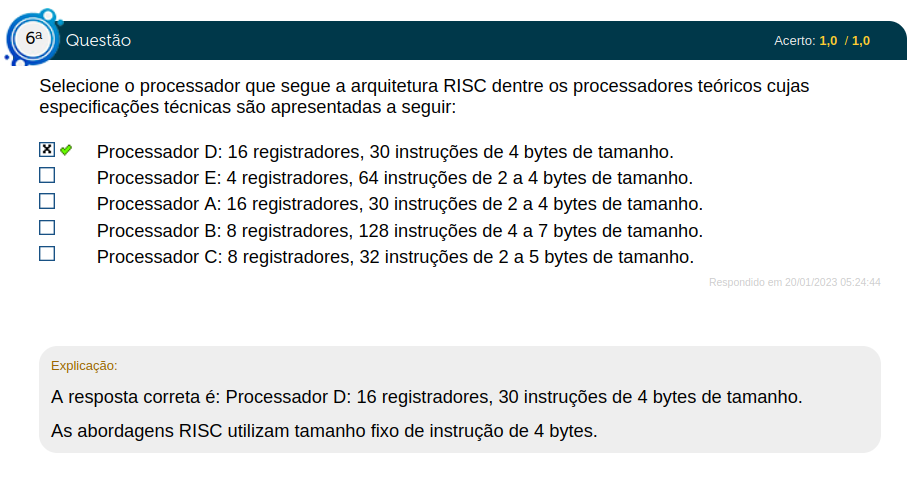 Selecione o processador que segue a arquitetura RISC dentre os processadores teóricos cujas especificações técnicas são apresentadas a seguir: Processador D: 16 registradores, 30 instruções de 4 bytes de tamanho. Processador E: 4 registradores, 64 instruções de 2 a 4 bytes de tamanho. Processador A: 16 registradores, 30 instruções de 2 a 4 bytes de tamanho. Processador B: 8 registradores, 128 instruções de 4 a 7 bytes de tamanho. Processador C: 8 registradores, 32 instruções de 2 a 5 bytes de tamanho. Processador D Processador E Processador A Processador B Processador C