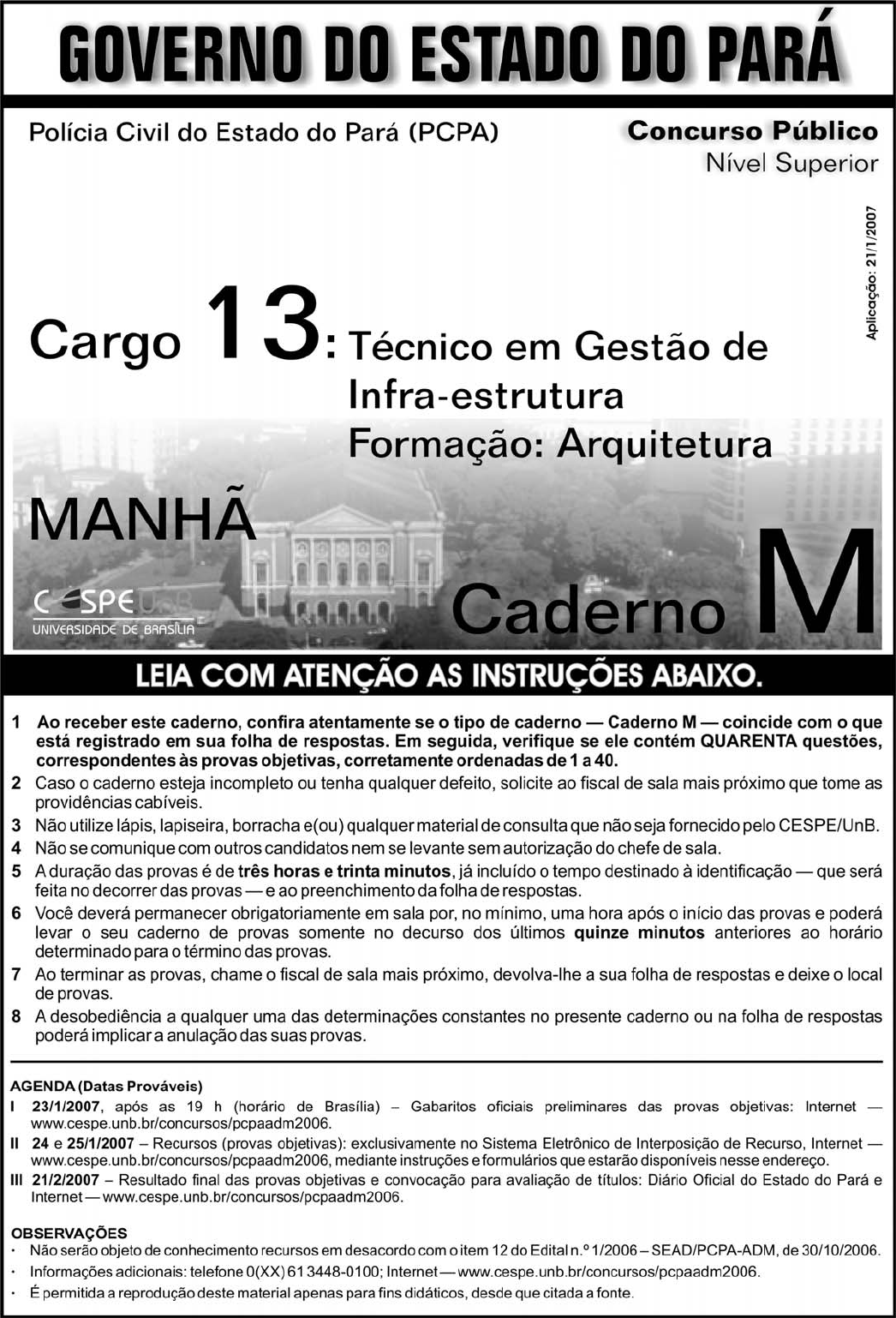 UnB/CESPE – SEAD/PCPA Caderno M Cargo 13: Técnico em Gestão de Infra-estrutura – Formação: Arquitetura – 1 – • Nas questões de 1 a 40, marque, em cada uma, a única opção correta, de acordo com o respectivo comando. Para as devidas marcações, use a folha de respostas, único documento válido para a correção das suas provas. • Nos itens que avaliam Noções de Informática, a menos que seja explicitamente informado o contrário, considere que todos os programas mencionados estão em configuração-padrão, em português, que o mouse está configurado para pessoas destras e que expressões como clicar, clique simples e clique duplo referem-se a cliques com o botão esquerdo do mouse. Considere também que não há restrições de proteção, de funcionamento e de uso em relação aos programas, arquivos, diretórios e equipamentos mencionados. CONHECIMENTOS BÁSICOS QUESTÃO 1 O escritor Mário Palmério morreu fascinado pela1 Amazônia. Durante muitos anos viveu sobre os rios Negro e Solimões, atraído pela vida dos caboclos, e realizou pesquisas sobre a flora e a fauna da região. Dizia que, na confluência do4 espírito europeu com o espírito dos índios da floresta, ocorria o que ocorre no encontro das águas do Negro com as do Solimões: os dois cursos seguem paralelos e vão, pouco a7 pouco, se juntando, para a espetacular explosão da pororoca quando chegam ao Atlântico. Escritores do talento de Palmério fazem da mente seu caleidoscópio: as idéias se10 refletem umas sobre as outras, desenhando, nas figuras geométricas, hipóteses surpreendentes. Mário disse que um dia o Brasil seria como o Amazonas em sua foz: de uma13 só cor. “Nesse dia” — disse, com a profecia no sorriso — “o Brasil fecundará o mundo como o Amazonas fecunda o Atlântico: com os estrondos do choque”.16 Mauro Santayana. In: Jornal do Brasil, 26/11/2006, p. A2 (com adaptações). Em relação ao texto acima, julgue os itens seguintes. I O texto é uma narrativa em primeira pessoa, na qual o autor interfere subjetivamente. II É possível inferir da expressão “viveu sobre os rios” (R.2) que o escritor vivia em um barco. III Na expressão “com as do Solimões” (R.6-7), utiliza-se o recurso coesivo denominado elipse, ficando subentendida a palavra águas. IV O termo “como”, tanto na linha 13 quanto na linha 15, tem a função de estabelecer, nos períodos, relação de comparação. A quantidade de itens certos é igual a A 1. B 2. C 3. D 4. QUESTÃO 2 Cientistas brasileiros e indianos contestaram a tese de que as florestas tropicais seriam o “pulmão do mundo”, exibindo pesquisas nas quais se mostra que um hectare de gramínea absorve mais carbono do que vários hectares das grandes latifoliáceas, e que cabe aos plânctons da superfície marinha a liberação de quase todo o oxigênio que o mundo consome. O efeito estufa nada tem a ver com a cobertura vegetal do solo. É claro que o solo deve estar coberto, mas são as queimadas e o uso de combustíveis fósseis que estão mudando o clima do mundo. Devemos nos preocupar muito mais com os oceanos do que com as florestas. Idem, ibidem. Quanto às idéias do texto acima, assinale a opção correta. A A tese de que as florestas tropicais seriam o “pulmão do mundo” é defendida por cientistas brasileiros e indianos. B Subentende-se das informações do texto que as florestas ainda são o elemento que mais absorve carbono e libera oxigênio. C É correto inferir das informações do texto a idéia de que a substituição das florestas por plantações é que provoca o efeito estufa. D De acordo com o texto, os oceanos devem concentrar nossa atenção porque os plânctons da superfície marinha liberam oxigênio. QUESTÃO 3 Só algumas crianças (as que não vasculham os sítios da1 Internet) acreditam que os países ricos, que nos enviam suas ONGs e seus técnicos, estão preocupados com o nosso bem- estar. Estão preocupados, sim, em preservar áreas virgens4 para seu benefício futuro. Contam com elas, se lhes for cortado o suprimento de óleo e gás do Oriente Médio. Hoje, lhes interessa proclamar que as grandes árvores amazônicas7 são os alvéolos pulmonares do planeta. Amanhã, quando lhes convier, seus cientistas concluirão que o caule e as folhas da cana-de-açúcar são muito mais eficientes para a10 transformação do carbono em oxigênio e energia. Enquanto isso, sem que ajamos em defesa de nosso território, eles vão comprando, a preço de qualquer coisa, vastas áreas da Hiléia.13 Por tudo isso, convém-nos, sem manifestações histéricas de xenofobia, exercer autoridade soberana sobre nosso espaço geográfico.16 Idem, ibidem (com adaptações). Com referência ao texto acima, assinale a opção incorreta. A O emprego de primeira pessoa do plural em “nos” (R.2) “nosso” (R.3), “ajamos” (R.12) e “convém-nos” (R.14) indica que o autor inclui o leitor nas afirmações do texto. B A expressão “seu benefício” (R.5) refere-se a “ONGs e seus técnicos” (R.3). C A substituição de “lhes interessa” (R.7) pela expressão interessa a eles mantém a correção gramatical e as informações originais do período. D A palavra “xenofobia” (R.15) está sendo empregada com o sentido de aversão ao estrangeiro. QUESTÃO 4 Na hora da Abolição, o Império do Brasil disfarçou a1 sua derrota atribuindo o fim da escravidão ao gesto magnânimo da princesa. Mas os historiadores reconstituíram a narrativa que se queria ocultar, lançando luz sobre a4 primeira grande luta social de caráter nacional no Brasil. Nessa luta, líderes de todas as cores mobilizaram o povo em torno da exigência de igualdade perante a lei. Os clubes7 abolicionistas, as fugas de escravos, com auxílio dos ferroviários, a greve seletiva dos tipógrafos, que não imprimiam os manifestos escravistas, a recusa dos jangadeiros10 cearenses de transportar cativos derrotaram a escravidão e destruíram o