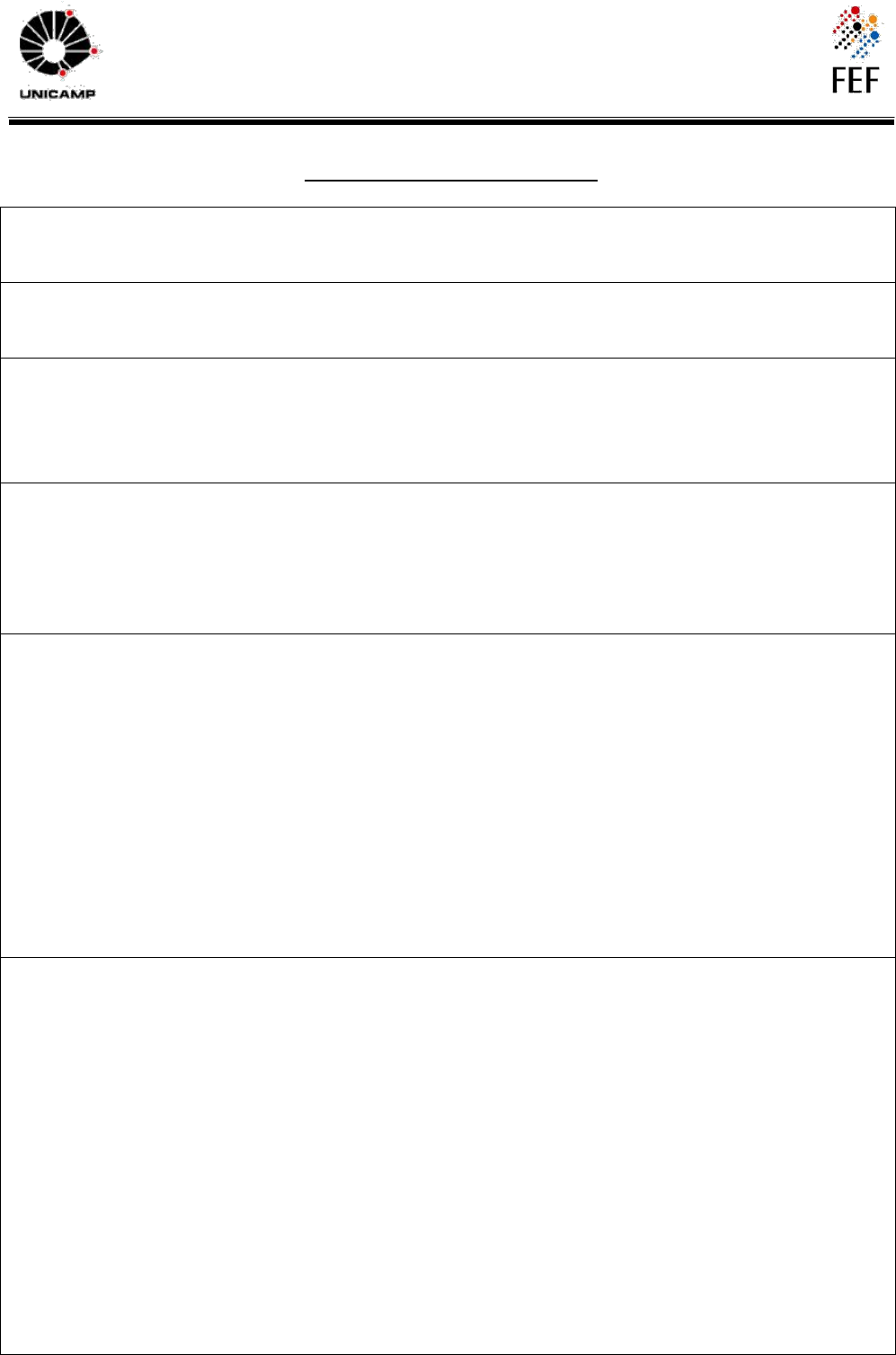 UNIVERSIDADE ESTADUAL DE CAMPINAS Faculdade de Educação Física - Coordenação de Graduação Cidade Universitária, Barão Geraldo, Campinas/SP CEP 13083-851 Telefones: (19) 3521-6606 – (19) 352-16758 - FAX: (19) 3521-6751 1 PROGRAMA DE DISCIPLINA DISCIPLINA: EF320 CRESCIMENTO E DESENVOLVIMENTO MOTOR PROFESSOR RESPONSÁVEL: EMENTA: Estudo dos processos que envolvem o crescimento físico, desenvolvimento motor e os processos maturacionais na infância e adolescência, assim como a influência e importância da atividade física e esporte em cada uma destas fases. OBJETIVOS: Compreender os processos biológicos de crescimento, maturação e desenvolvimento motor de crianças e adolescentes em diferentes contextos (escolar e esportivo) da prática da atividade física, incluindo avaliação e interpretação das diferentes fases do desenvolvimento humano. PROGRAMA: 1. Introdução aos conceitos de crescimento, maturação e desenvolvimento; 2. Crescimento físico com abordagens em medidas antropométricas e identificação de composição corporal; 3. Maturação biológica, identificação dos indicadores maturacionais: sexual, morfológico, ósseo e somático; 4. Desenvolvimento físico e motor: identificados através de testes motores com ênfase na aptidão física e rendimento motor; 5. Testes e avaliações para análise do crescimento, maturação e desenvolvimento físico e motor; 6. Interpretação dos resultados dos testes e avaliações sobre o crescimento. Maturação e desenvolvimento físico e motor. BIBLIOGRAFIA BÁSICA: GALLAHUE, D. L., OZMUN, J.C., Compreendendo o Desenvolvimento Motor: Bebes, Crianças, adolescentes e adultos. 3ª. Ed. São Paulo: Phorte editora, 2005. GUEDES, D.P. GUEDES, J.E. Crescimento, Composição Corporal e Desempenho Motor de Crianças e Adolescentes. SP: CLR Balieiro, 1997. MALINA, R.M.; BOUCHARD, C. Atividade Física do Atleta Jovem: do Crescimento à Maturação. SP: Roca, 2002. BIBLIOGRÁFICAS COMPLEMENTARES: PEREIRA, B.P.; SOUZA JR., T. Metabolismo Celular e Educação Física: Aspectos Bioquímicos e Nutricionais. SP: Phorte, 2004. COSTA, L.T.; DUARTE, E; GORLA, J.I. Síndrome de Down: crescimento, maturação e atividade física. SP: Phorte, 2017. GORLA J. H., DUARTE E., COSTA. L. T., Freire F. Crescimento de crianças e adolescentes com Síndrome de Down – Uma breve revisão de literatura. Rev Bras Cineantropom Desempenho Hum 2011, 13(3):230-237. UNIVERSIDADE ESTADUAL DE CAMPINAS Faculdade de Educação Física - Coordenação de Graduação Cidade Universitária, Barão Geraldo, Campinas/SP CEP 13083-851 Telefones: (19) 3521-6606 – (19) 352-16758 - FAX: (19) 3521-6751 2 SILVERTOHOM, D.U. Fisiologia Humana: Uma Abordagem Integrada. S.P: Manole, 2003. VITÓRIA, R.V.; BOLAÑOS, M.A.; MANDIOLA, P.G.; ARRUDA, M. Crecimiento Físico, Indicadores Y Técnicas Antropométricas. Talca, Gutenberg – Chile, 2012. CRITÉRIOS DE AVALIAÇÃO: