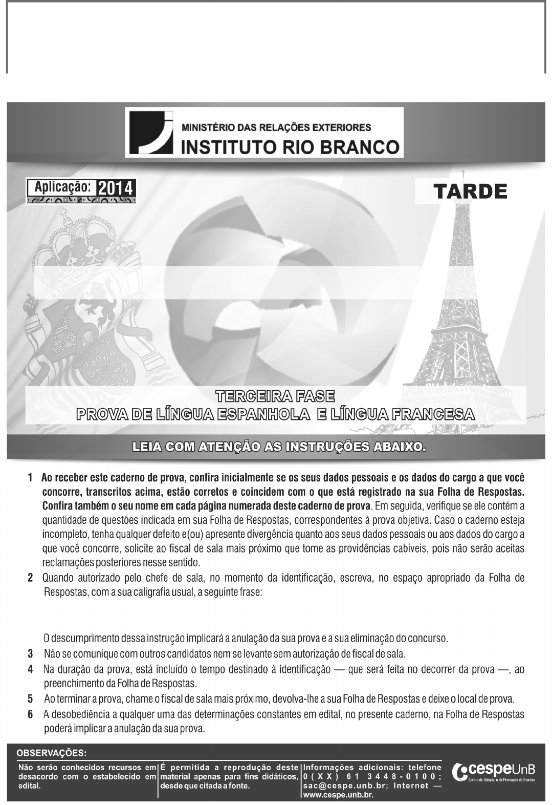 ||095IRBr14ESFR_003_03N300848|| CESPE/UnB – IRBr – Aplicação: 2014 Cada uma das questões a seguir é constituída de quatro itens a serem julgados. De acordo com o comando da questão a que cada um dos itens se refira, marque, na folha de respostas, para cada item: o campo designado com o código C, caso julgue o item CERTO; ou o campo designado com o código E, caso julgue o item ERRADO. Para as devidas marcações, use a folha de respostas, único documento válido para a correção da sua prova. TERCEIRA FASE – PROVA DE LÍNGUA ESPANHOLA E LÍNGUA FRANCESA LÍNGUA ESPANHOLA Texto para las cuestiones de 1 a 5 Vine a Comala porque me dijeron que acá vivía mi1 padre, un tal Pedro Páramo. Mi madre me lo dijo. Y yo le prometí que vendría a verlo en cuanto ella muriera. Le apreté sus manos en señal de que lo haría, pues ella estaba por morirse y yo4 en un plan de prometerlo todo. “No dejes de ir a visitarlo—me recomendó—. Se llama de este modo y de este otro. Estoy segura de que le dará gusto conocerte.”Entonces no pude hacer7 otra cosa sino decirle que así lo haría, y de tanto decírselo se lo seguí diciendo aun después que a mis manos les costó trabajo zafarse de sus manos muertas.10 Todavía antes me había dicho:—No vayas a pedirle nada. Exígele lo nuestro. Lo que estuvo obligado a darme y nunca me dio... El olvido en que nos tuvo, mi hijo, cóbraselo13 caro. —Así lo haré, madre. Pero no pensé cumplir mi promesa. Hasta que ahora16 pronto comencé a llenarme de sueños, a darle vuelo a las ilusiones. Y de este modo se me fue formando un mundo alrededor de la esperanza que era aquel señor llamado Pedro19 Páramo, el marido de mi madre. Por eso vine a Comala. Era ese tipo de canícula, cuando el aire de agosto sopla caliente, envenenado por el olor podrido, de las saponarias.22 El camino subía y bajaba; “sube o baja según se va o se viene. Para el que va, sube; para el que viene, baja.” —¿Cómo dice usted que se llama el pueblo que se ve25 allá abajo? —Comala, señor. —¿Está seguro de que ya es Comala?28 —Seguro, señor. —¿Y por qué se ve esto tan triste? —Son los tiempos, señor.31 Yo imaginaba ver aquello a través de los recuerdos de mi madre; de su nostalgia entre retazos de suspiros. Siempre vivió ella suspirando por Comala, por el retorno; pero jamás34 volvió. Ahora yo vengo en su lugar. Traigo los ojos con que ella miró estas cosas, porque me dio sus ojos para ver: “Hay allí, pasando el puerto de los Colimotes, la vista37 muy hermosa de una llanura verde, algo amarilla por el maíz maduro; desde ese lugar se ve Comala, blanqueando por la tierra, iluminándola durante la noche.” Y su voz era secreta, casi40 apagada, como si hablara consigo misma... Mi madre. —¿Y a qué va usted a Comala, si se puede saber?—oí que me preguntaban.43 —Voy a ver a mi padre—contesté. —¡Ah!—dijo él. Y volvimos al silencio.46 Caminábamos cuesta abajo, oyendo el trote rebotado de los burros. Los ojos reventados por el sopor del sueño, en la canícula de agosto.49 —Bonita fiesta le va a armar—volví a oír la voz del que iba allí a mi lado—. Se pondrá contento de ver a alguien después de tantos años que nadie viene por aquí.52 Luego añadió: —Sea usted quien sea, se alegrará de verlo. En la reverberación del sol, la llanura parecía una55 laguna transparente, deshecha en vapores por donde se traslucía un horizonte gris. Y más allá, una línea de montañas. Y todavía más allá, la más remota lejanía.58 —¿Y qué trazas tiene su padre, si se puede saber? —No lo conozco—le dije—. Sólo sé que se llama Pedro Páramo.61 —¡Ah!, vaya. —Sí, así me dijeron que se llamaba. Oí otra vez el “¡ah!” del arriero.64 Juan Rulfo. Pedro Páramo. Cátedra. Madrid, 2005 (con adaptaciones). QUESTÃO 1 El vástago que buscaba a Pedro Páramo 1 agarró las manos de la madre con serenidad. 2 acarició con ternura las muñecas de la madre. 3 cumplió la promesa que hizo a la madre moribunda. 4 soltó con tranquilidad la mano de la madre. QUESTÃO 2 En las líneas 13 y 15, el vocablo “lo” 1 hace relación al contacto inexistente entre la madre y el padre. 2 se refiere a cosas diferentes. 3 no sustituye nada. 4 se utiliza para hablar de la vida de diálogo que había entre la madre, el padre y el hijo. QUESTÃO 3 En la expresión “de tanto decírselo se lo seguí diciendo” (R.8 y 9), el vocablo 1 “lo” sustituye al nombre del padre. 2 “se” no suple a nadie. 3 “lo” representa la alegría que tendrá el padre al ver al hijo. 4 “se” suplanta al padre. QUESTÃO 4 Para la madre, Comala 1 es un lugar oscuro en la noche. 2 está rodeada de plantaciones de remolacha. 3 está en una región árida e inhóspita. 4 se ubica en una comarca montañosa. QUESTÃO 5 El hijo de Pedro Páramo, antes de llegar a Comala, 1 disfruta del ambiente primaveral. 2 sube un cerro. 3 conversa con avidez con una mujer. 4 dialoga con un pastor que va con dos mulas. Prova de Língua Espanhola e Língua Francesa – 1 – ||095IRBr14ESFR_003_03N300848|| CESPE/UnB – IRBr – Aplicação: 2014 Texto para las cuestiones de 6 a 10 ¡Qué descansada vida la del que huye del mundanal ruido, y sigue la escondida senda, por donde han ido los pocos sabios que en el mundo han sido! Que no le enturbia el pecho de los soberbios grandes el estado, ni del dorado techo se admira, fabricado del sabio moro, en jaspes sustentado. No cura si la fama canta con voz su nombre pregonera, ni cura si encarama la lengua lisonjera lo que condena la verdad sincera. ¿Qué presta a mi contento si soy del vano dedo señalado; si, en busca deste viento, ando desalentado con ansias vivas, con mortal cuidado? ¡Oh monte, oh fuente, oh río! ¡Oh secreto seguro, deleitoso! , roto casi el navío, a vuestro almo reposo huyo de aqueste mar tempestuoso. Un no rompido sueño, un día puro, alegre, libre quiero; no quiero ver el ceño vanamente seve