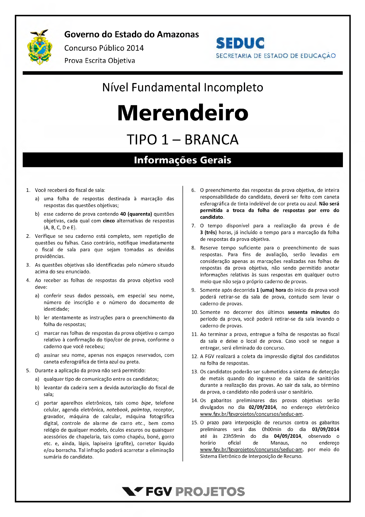 Governo do Estado do Amazonas Concurso Público 2014 Prova Escrita Objetiva SEDUC SECRETARIA DE ESTADO DE EDUCACÀO Nível Fundamental Incompleto Merendeiro TIPO 1 - BRANCA Inform ações Gerais 1. Você receberá do fiscal de sala: a) uma folha de respostas destinada à marcação das respostas das questões objetivas; b) esse caderno de prova contendo 40 (quarenta) questões objetivas, cada qual com cinco alternativas de respostas (A, B, C, D e E). 2. Verifique se seu caderno está completo, sem repetição de questões ou falhas. Caso contrário, notifique imediatamente o fiscal de sala para que sejam tomadas as devidas providências. 3. As questões objetivas são identificadas pelo número situado acima do seu enunciado. 4. Ao receber as folhas de respostas da prova objetiva você deve: a) conferir seus dados pessoais, em especial seu nome, número de inscrição e o número do documento de identidade; b) ler atentamente as instruções para o preenchimento da folha de respostas; c) marcar nas folhas de respostas da prova objetiva o campo relativo à confirmação do tipo/cor de prova, conforme o caderno que você recebeu; d) assinar seu nome, apenas nos espaços reservados, com caneta esferográfica de tinta azul ou preta. 5. Durante a aplicação da prova não será permitido: a) qualquer tipo de comunicação entre os candidatos; b) levantar da cadeira sem a devida autorização do fiscal de sala; c) portar aparelhos eletrônicos, tais como bipe, telefone celular, agenda eletrônica, notebook, palmtop, receptor, gravador, máquina de calcular, máquina fotográfica digital, controle de alarme de carro etc., bem como relógio de qualquer modelo, óculos escuros ou quaisquer acessórios de chapelaria, tais como chapéu, boné, gorro etc. e, ainda, lápis, lapiseira (grafite), corretor líquido e/ou borracha. Tal infração poderá acarretar a eliminação sumária do candidato. 6. O preenchimento das respostas da prova objetiva, de inteira responsabilidade do candidato, deverá ser feito com caneta esferográfica de tinta indelével de cor preta ou azul. Não será permitida a troca da folha de respostas por erro do candidato. 7. O tempo disponível para a realização da prova é de 3 (três) horas, já incluído o tempo para a marcação da folha de respostas da prova objetiva. 8. Reserve tempo suficiente para o preenchimento de suas respostas. Para fins de avaliação, serão levadas em consideração apenas as marcações realizadas nas folhas de respostas da prova objetiva, não sendo permitido anotar informações relativas às suas respostas em qualquer outro meio que não seja o próprio caderno de provas. 9. Somente após decorrida 1 (uma) hora do início da prova você poderá retirar-se da sala de prova, contudo sem levar o caderno de provas. 10. Somente no decorrer dos últimos sessenta minutos do período da prova, você poderá retirar-se da sala levando o caderno de provas. 11. Ao terminar a prova, entregue a folha de respostas ao fiscal da sala e deixe o local de prova. Caso você se negue a entregar, será eliminado do concurso. 12. A FGV realizará a coleta da impressão digital dos candidatos na folha de respostas. 13. Os candidatos poderão ser submetidos a sistema de detecção de metais quando do ingresso e da saída de sanitários durante a realização das provas. Ao sair da sala, ao término da prova, o candidato não poderá usar o sanitário. 14. Os gabaritos preliminares das provas objetivas serão divulgados no dia 02/09/2014, no endereço eletrônico www.fgv.br/fgvprojetos/concursos/seduc-am. 15. O prazo para interposição de recursos contra os gabaritos preliminares será das 0h00min do dia 03/09/2014 até às 23h59min do dia 04/09/2014, observado o horário oficial de Manaus, no endereço www.fgv.br/fgvprojetos/concursos/seduc-am, por meio do Sistema Eletrônico de Interposição de Recurso. X^FGV PROJETOS http://www.fgv.br/fgvprojetos/concursos/seduc-am http://www.fgv.br/fgvprojetos/concursos/seduc-am Secretaria de Estado de Educação e Qualidade de Ensino do Estado do Amazonas - SEDUC/AM - 2014 FGV - Projetos Língua Portuguesa Texto Os benefícios da merenda escolar A alimentação é uma necessidade básica ao desenvolvimento do ser humano. Nas fases da infância e da adolescência, alimentos de qualidade favorecem o crescimento tanto do aspecto físico, como do intelectual, do emocional e do social. Nesse sentido, a merenda escolar é fundamental, pois ela pode influenciar bastante no desempenho do aluno. Por isso, o Estatuto da Criança e do Adolescente (ECA) estabelece como função do Estado assegurar a alimentação de qualidade na escola. A merenda escolar é um direito de meninos e meninas. Não pode ser pensada como “auxílio aos carentes", nem como instrumento de combate à fome ou à desnutrição. O período em que o aluno permanece na escola deve ser de bem-estar para facilitar o aprendizado. Uma boa alimentação contribui, portanto, para um melhor desempenho escolar e, consequentemente, diminui a repetência. A merenda pode contribuir, também, para formação de bons hábitos alimentares. (Agência Unama) 01 A palavra “benefícios", que aparece no título do texto, significa (A) “o que produz algum tipo de prejuízo". (B) “o que é feito para prejudicar as pessoas". (C) “o que se fa z para o bem de alguém". (D) “o que é realizado dentro da lei” . (E) “o que causa algumas doenças". 02 Marque a opção em que as palavras estão colocadas em ordem alfabética corretamente. (A) Merenda / Alimentação (B) Necessidade / Desenvolvimento (C) Fase / Infância (D) Alimento / Adolescência (E) Qualidade / Crescimento 03 Marque a opção que indica a palavra que tem o mesmo número de vogais e consoantes. (A) Contribuir (B) Facilitar (C) Escolar (D) Estar (E) Menino 04 Marque e opção que apresenta uma palavra classificada como trissílaba. (A) Alimentação (B) Carentes (C) Instrumento (D) Fome (E) Repetência 05 “A a