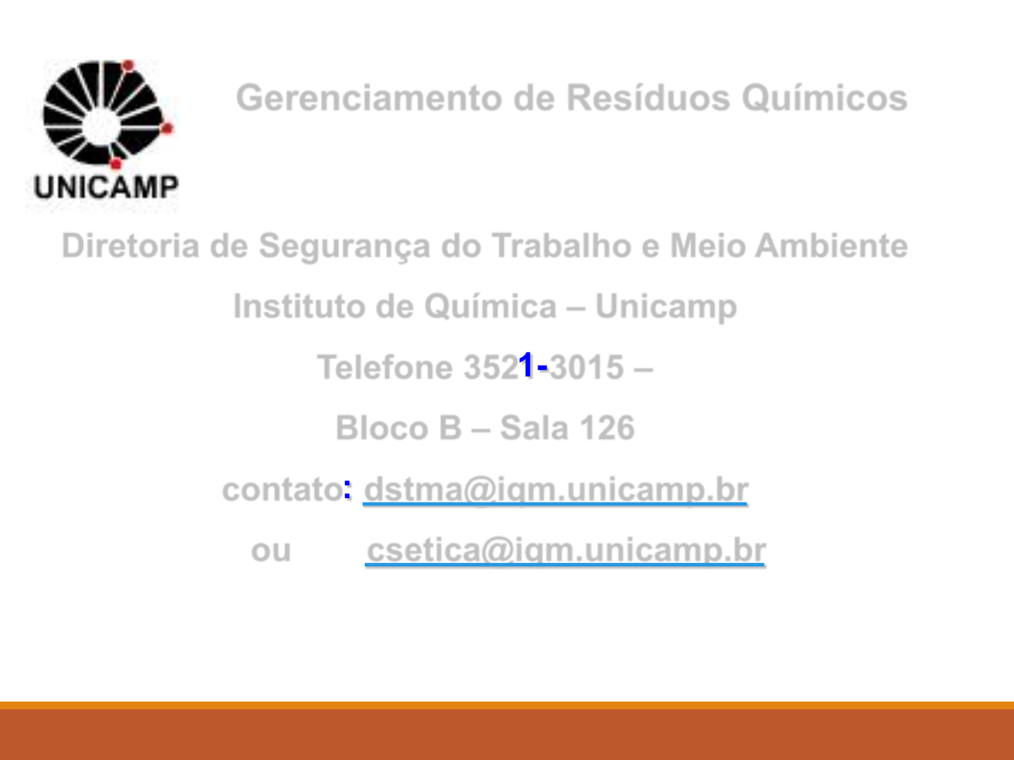 Gerenciamento de Resíduos Químicos Diretoria de Segurança do Trabalho e Meio Ambiente Instituto de Química – Unicamp Telefone 3521-3015 – Bloco B – Sala 126 contato: dstma@iqm.unicamp.br ou csetica@iqm.unicamp.br mailto:dstma@iqm.unicamp.br mailto:csetica@iqm.unicamp.br Diretoria de Segurança do Trabalho e Meio Ambiente Instituto de Química - UNICAMP Edson Gilberto Avansini Química – Elizabeth Fernandes Ferreira Gambini Técnica em Química - Débora Cristina Kranzfeld Técnico em Segurança - Marcelo da Silva Caldas Normas de Segurança e Gerenciamento de Resíduos DSTMA - IQ Norma de Segurança do Instituto de Química Finalidade e Aplicação 1.1. Essa norma determina os requisitos básicos para a proteção da vida e da propriedade nas dependências do Instituto de Química da UNICAMP, onde são manuseados produtos químicos e equipamentos. 1.2. Essa norma se aplica a todas as pessoas alocadas no Instituto de Química (docentes, funcionários, alunos de graduação, pós graduação, bolsistas de iniciação científica e pesquisadores) e também àquelas que não estejam ligadas ao mesmo, mas que tenham acesso ou permanência autorizadas, conforme o capítulo 2.0 dessa norma, às dependências do IQ/UNICAMP. DSTMA - IQ • Só se pode gerenciar aquilo que se conhece, • Inventário de todo o resíduo produzido, • Responsabilidade objetiva na geração do resíduo, • O gerador do resíduo é responsável pelo mesmo; DSTMA - IQ Gerenciamento de resíduos no Instituto de Química Aspectos a serem contemplados no Gerenciamento de Resíduos • Minimização da geração. • Tratamento de resíduos – inativação. • Disposição final. • A segurança institucional • Legislação • Imagem Institucional Prof. Fernando Coelho Resíduo Passivo: são os resíduos que ainda não tem destinação (Herança). Resíduo Ativo: são os resíduos de geração contínua (Rotina). Tipos de Resíduos DSTMA - IQ Classe I - Resíduos Perigosos: são aqueles que apresentam riscos à saúde pública e ao meio ambiente, exigindo tratamento e disposição especiais em função de suas características de inflamabilidade corrosividade, reatividade, toxicidade e patogenicidade. Exemplo: Borra de tinta. Classe II II A - Resíduos Não-inertes: são os resíduos que não apresentam periculosidade, porém não são inertes; podem ter propriedades tais como: combustibilidade, biodegradabilidade ou solubilidade em água. Exemplo: Lixo doméstico. II B- Resíduos Inertes: são aqueles que, ao serem submetidos aos testes de solubilização (NBR-10.007 da ABNT), não têm nenhum de seus constituintes solubilizados em concentrações superiores aos padrões de potabilidade da água. Exemplo: Entulhos de demolição. Classificação dos Resíduos Sólidos – NBR 10004:2004 NBR 10004:2004 Aspectos Importantes - Cuidados • Acúmulo de resíduos nos laboratórios, • Grande variedade de misturas, • Reagentes de natureza variada: oxidantes, redutores, ácidos, bases todos misturados (INCOMPATIBILIDADE) Prof. Fernando Coelho • Recipientes separados, devidamente etiquetados (segregação), • Mantenha um sistema de etiquetagem clara, • Não estoque grandes quantidades de resíduos dentro do laboratório, • Faça tentativas de diminuir a escala dos experimentos, sempre que possível. Prof. Fernando Coelho Manuseio de Resíduos Custos para disposição de Resíduos • Lixo Municipal e Esgoto Sanitário • Incineração de Lixo Hospitalar e Vala Asséptica Aterro licenciado (vários no país) - Disposição aterro licenciado R$ 500,00 (classe II) /tonelada - Disposição via incineração: R$ 5.000,00 (classe I/ tonelada) - Disposição via co-processamento: R$ 1.500,00 por tonelada - Transporte R$ 5.000,00 (carga) Prof. Fernando Coelho Aterros classificados Estrutura da impermeabilização Prof. Fernando Coelho Alguns exemplos de disposição externa de resíduos Aterros classificados Prof. Fernando Coelho Alguns exemplos de disposição externa de resíduos É o processo de destruição térmica realizado sob alta temperatura - 900 a 1250 ºC - com tempo de residência controlada. É utilizado para o tratamento de resíduos de alta periculosidade, ou que necessitam de destruição completa e segura. Vista geral de incineradores O interior de um incinerador em funcionamento Incineração de Resíduos Prof. Fernando Coelho O que é possível incinerar? • Resíduos sólidos, pastosos, líquidos e gasosos; • Resíduos orgânicos clorados e não clorados; • Resíduos orgânicos clorados e não clorados (borra de tinta, agrodefensivos, borras oleosas, farmacêuticos, resíduos de laboratório, resinas, entre outros; • Resíduos inorgânicos contaminados com óleo; • Água contaminada com solventes, entre outros; • Resíduos ambulatoriais. Prof. Fernando Coelho O que não é possível incinerar? • Resíduos totalmente inorgânicos; • Resíduos radioativos • Resíduos hospitalares de centros cirúrgicos; Prof. Fernando Coelho • Destruição total da parcela orgânica dos resíduos; • Os resíduos podem ser queimados em vários estados físicos e dentro de uma grande variedade de recipientes. • Redução drástica do volume a ser descartado – A incineração deixa como produto apenas as cinzas, que geralmente são inertes. Desta forma, reduz a necessidade de espaço para aterro. • Redução do impacto ambiental – Comparativamente com o aterro sanitário, a incineração minimiza a preocupação a longo prazo com monitorização do lençol freático já que o resíduo tóxico é destruído e não “guardado”. DSTMA - IQ Vantagens da incineração • Destoxificação – A incineração destrói bactérias, vírus e compostos orgânicos, como o tetracloreto de carbono, óleo ascarel e até dioxinas. Na incineração, a dificuldade de destruição não depende da periculosidade do resíduo mas sim da estabilidade do calor. A incineração também pode ser usad