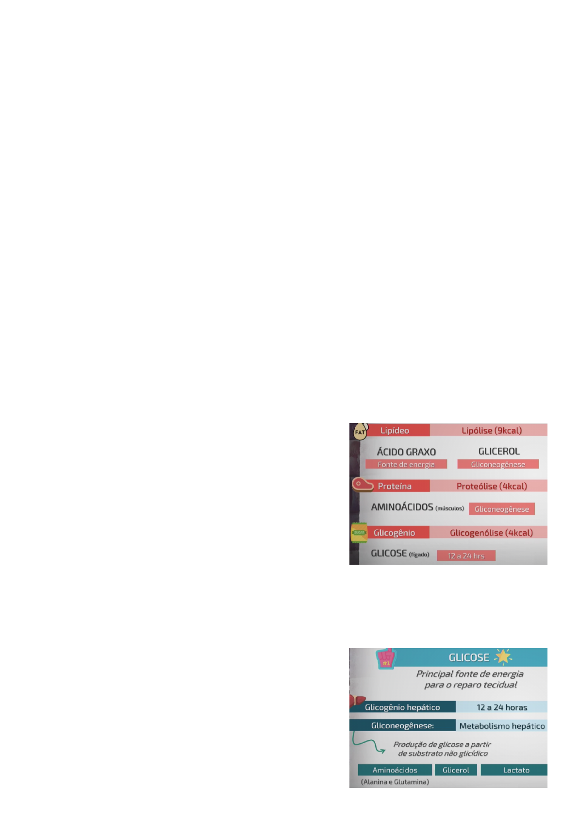 Júlia Camargos FACULDADE DE MEDICINA DE BARBACENA CLÍNICA CIRÚRGICA I AULA 2 - RESPOSTA ENDÓCRINO-METABÓLICA AO TRAUMA PARTE 1 - SANARFLIX: Pontos abordados: tema importante para entender a resposta do pós-operatório, trauma e processo inflamatório ● Resposta endócrino e metabólica ● Mediadores hormonais ● Fases da resposta INTRODUÇÃO: ● O objetivo da resposta endócrina é trazer o indivíduos que saiu do seu estado de equilíbrio para o estado de homeostasia ● Após o estresse (trauma, cirurgia, jejum prolongado, patologia cirúrgica ou clínica) o paciente sai do seu estado de equilíbrio. Para retornar a esse estado acontece uma resposta regulada pelo organismo → Resposta Endócrino-Metabólica e Imunológica. ● Objetivos: ○ Manter o fluxo sanguíneo ○ Aumentar aporte de nutrientes para a cicatrização ○ Restabelecer o equilíbrio endógeno ● Estímulos muito intensos: uma resposta muito exagerada devido a estímulos muito intensos pode gerar uma resposta maléfica, trazendo condições ruins ao paciente (do ponto de vista clínico) podendo evoluir para a disfunção de múltiplos órgãos. COMPOSIÇÃO CORPORAL: É necessário que ocorra o aumento do aporte de nutrientes, tanto de energia quanto de matéria prima na região acometida. ● Lipídios: conseguem fornecer cerca de 9 kcal através da lipólise → liberando ácido graxo (fonte de energia direta para alguma células) ou glicerol (metabolizado pelo fígado para a produção de nova glicose - gliconeogênese) ● Proteína: liberam cerca de 4 kcal através da proteólise das proteínas musculares → liberando aminoácidos (utilizados na produção de glicose - gliconeogênese hepática) ● Glicogênio: reserva primária de energia mais imediata, libera 4 kcal com a glicogenólise (quebra do glicogênio no fígado) → liberando glicose. Dura em torno de 12 a 24 horas, por isso, processos inflamatórios muito prolongados, recuperação de pós-operatório de grandes cirurgias é necessário a produção de nova glicose através do glicerol e de aminoácidos GLICOSE: fonte principal de energia para o reparo tecidual e para a manutenção da homeostasia interna ● Principal fonte inicial: quebra do glicogênio hepático → duração de 12 a 24 horas 1 Júlia Camargos ● Gliconeogênese (produção de nova glicose): metabolismo hepático com os aminoácidos (alanina e glutamina), glicerol e lactato ESTÍMULO AFERENTE: A resposta se inicia através do estímulo aferente: ● Nervo vago ● Fibras nociceptivas: estímulo de dor no local da cirurgia, da inflamação ● Citocinas: ponte de interação entre resposta metabólica e imunológica HORMÔNIOS: CORTISOL: liberado pelo córtex da adrenal ● Efeito catabólico: estimula a produção de glicose nova e liberação de nutrientes para o reparo tecidual ● Proteólise muscular: liberação de aminoácidos → utilizados na gliconeogênese e da produção de proteínas de fase aguda (fibrinogênio e PCR) ● Lipólise: liberação de ácido graxo (fonte de energia direta) e de glicerol (utilizado na gliconeogênese) CATECOLAMINAS: a principal representante é a adrenalina ● Liberadas pela medula da glândula suprarrenal em situações de alteração de volemia (fazendo uma vasoconstrição) e por estímulo local ● Preserva o volume intravascular através da vasoconstrição (fase inicial do reparo tecidual) ● Efeito metabólico do ponto de vista metabólico, estimulando a glicogenólise, gliconeogênese e lipólise ● Precisam dos glicocorticóides (cortisol) para que elas tenham um efeito metabólico adequado → atuam de forma sinérgica com o cortisol ● Catecolaminas + opióides endógenos: responsáveis pela atonia intestinal (íleo funcional, íleo paralítico pós operatório → pode levar a uma obstrução intestinal funcional) HORMÔNIO ANTIDIURÉTICO ou ARGININA VASOPRESSINA (ADH): ● Produzida no hipotálamo (nos núcleos supraóticos) e é armazenada na neuro-hipófise (parte posterior) ● Liberada a partir do estímulo de perda de água para estimular a absorção renal de água para manter a volemia ● Preserva o volume intravascular: participa das fases iniciais do reparo tecidual ● Oligúria funcional transitória: quando a resposta metabólica diminuir e entrar na fase anabólica, o reequilíbrio do balanço hídrico é restabelecido com diminuição do ADH e assim, aumento da diurese → restabelecer balanço hídrico ● Vasoconstrição esplâncnica: direciona o fluxo sanguíneo para os órgãos principais (cérebro, coração e rim) ● Efeito metabólico (catabólico): estimula a glicogenñolise e a gliconeogênese para disponibilizar glicose para o reparo tecidual 2 Júlia Camargos ALDOSTERONA: ● Produzida na zona glomerulosa da suprarrenal; é um mineralocorticóide, ● Participa do SRAA e participa do balanço hídrico (reabsorção de sódio e água) e de potássio (excreção junto com íons H+ → podendo evoluir para uma alcalose mista) ○ Alcalose mista: perda de H+ por via alta (sonda nasogástrica, vómitos) e por via baixa ● Paciente tem perda de CO2 devido hiperventilação por anestesia e dor → alcalose mista ● A alcalose é transitória e ao longo dos dias o paciente vai restabelecendo seu equilíbrio ácido-base GLUCAGON: ● estímulo neuro-hormonal, produzido nas células alfa do pâncreas ● Hormônio contrarregulador de insulina estimulando a gliconeogênese hepática para a produção de nova glicose INSULINA: ● Hormônio anabólico que vai estar suprimido durante a fase catabólica, pois nessa fase o organismo precisa de muitos nutrientes disponíveis para fazer o reparo tecidual ● Hormônios contra-insulínicos: glucagon, epinefrina e cortisol HORMÔNIO DE CRESCIMENTO (GH): ● Produzido pelas células da hipófise anterior ● Responsável pela lipólise (liberação de glicerol e de ácido graxos) ● Tem a sua função anabólica a partir do estímulo de IGF-1 