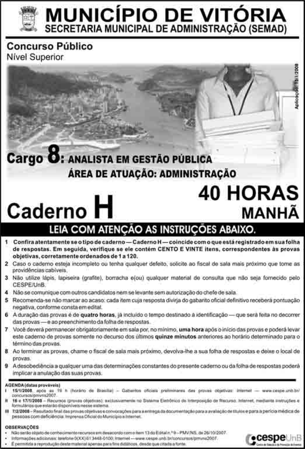 UnB/CESPE – PMV/NS Caderno H Cargo 8: Analista em Gestão Pública – Área de Atuação: Administração (40 horas – manhã) – 1 – • De acordo com o comando a que cada um dos itens de 1 a 120 se refira, marque, na folha de respostas, para cada item: o campo designado com o código C, caso julgue o item CERTO; ou o campo designado com o código E, caso julgue o item ERRADO. A ausência de marcação ou a marcação de ambos os campos não serão apenadas, ou seja, não receberão pontuação negativa. Para as devidas marcações, use a folha de respostas, único documento válido para a correção das suas provas. • Nos itens que avaliam Noções de Informática, a menos que seja explicitamente informado o contrário, considere que todos os programas mencionados estão em configuração-padrão, em português, que o mouse está configurado para pessoas destras e que expressões como clicar, clique simples e clique duplo referem-se a cliques com o botão esquerdo do mouse. Considere também que não há restrições de proteção, de funcionamento e de uso em relação aos programas, arquivos, diretórios e equipamentos mencionados. CONHECIMENTOS BÁSICOS As capitais brasileiras perdem quase metade (45%)1 da água retirada dos mananciais em vazamentos de redes de abastecimento, fraudes e falhas de medição. Os 6,14 milhões de litros desperdiçados diariamente nas grandes cidades do4 país seriam suficientes para atender a 38 milhões de consumidores. Os dados sobre as coberturas e desperdícios nas7 redes públicas de abastecimento de água e de saneamento estão reunidos em um estudo elaborado pelo Instituto Socioambiental (ISA). O estudo, inédito pela abrangência,10 ressalta a necessidade urgente de adoção de medidas para expandir as regiões de preservação ambiental e as redes de saneamento básico, assim como para conter a invasão de13 áreas de mananciais e recuperar aquelas que já foram degradadas em função da falta de planejamento urbano eficaz — o que acontece na maior parte das grandes cidades.16 O estudo recomenda, ainda, a intensificação dos esforços de educação ambiental, para que a população compreenda que também é responsável pela conservação da água.19 O Estado de S.Paulo, 23/11/2007 (com adaptações). Em relação às idéias e às estruturas lingüísticas do texto acima, julgue os itens a seguir. 1 A vírgula logo após “abastecimento” (R.3) é empregada para isolar expressão apositiva. 2 A expressão “seriam suficientes” (R.5) está no plural para concordar com “Os 6,14 milhões de litros” (R.3-4). 3 Subentende-se, logo após “como” (R.13), o segmento “a necessidade urgente de adoção de medidas”. 4 Depreende-se das informações do texto que a falta de planejamento urbano eficaz tem como conseqüência a degradação de áreas de mananciais. 5 O termo “para que” (R.18) pode, sem prejuízo para a informação original do texto, ser substituído por qualquer um dos seguintes: afim de que, de modo que, de forma que, contanto que. Um longo período de bonança econômica e de farta1 liquidez internacional, melhoria nos indicadores de emprego, perspectivas de crescimento menos medíocre do que nos anos anteriores e uma redução consistente na4 desigualdade social devido a uma política mais universalista e sistemática de transferência de renda não devem obscurecer um fato que é uma miséria em si: o país é tão desigual,7 amargou tantos anos de estagnação econômica, concentrou tanta renda que qualquer melhora, com essa base de comparação, é relativa. Uma evolução consistente na10 redução da desigualdade depende de uma visão mais global, que contemple as chamadas “portas de saída” dos programas sociais, o desenvolvimento inclusivo e uma visão igualitária13 que também seja federativa. Valor Econômico, 23/11/2007. Julgue os itens que se seguem, relativos às idéias e às estruturas lingüísticas do texto acima. 6 Na linha 3, a eliminação de “do” após a palavra “medíocre” prejudica a correção gramatical do período. 7 A forma verbal “devem” (R.6) está no plural para concordar com o sujeito composto. 8 A expressão “amargou” (R.8) está sendo empregada no mesmo sentido que tem na frase: O refresco depois de algum tempo amargou. 9 O emprego da vírgula logo após “global” (R.11) justifica-se por isolar oração subordinada adjetiva explicativa. 10 A expressão “desenvolvimento inclusivo” (R.13) equivale a desenvolvimento interno. UnB/CESPE – PMV/NS Caderno H Cargo 8: Analista em Gestão Pública – Área de Atuação: Administração (40 horas – manhã) – 2 – Há hoje poucas dúvidas de que, na ausência de1 ações incisivas e permanentes, o planeta se tornará cada vez mais hostil à vida humana. A Conferência do Clima, da Organização das Nações Unidas (ONU), a ser realizada em4 Bali, em dezembro, está cercada pela urgência e pela necessidade e ameaçada pela politicagem e estreiteza de interesses econômicos. Movem-se em direções opostas7 os diagnósticos severos lançados pelo Painel Intergovernamental sobre Mudanças Climáticas (IPCC), que coloca as transformações ambientais no limiar da10 irreversibilidade, e a conduta dos principais países poluidores do mundo, na maior parte dos casos, negligente e desinteressada.13 Diante da gravidade das ameaças, as metas do Protocolo de Kyoto se tornaram tímidas. O balanço feito pelo secretário-executivo da Convenção do Clima, da ONU,16 Yvo de Boer, indica que o objetivo de reduzir em 5,2% as emissões de gases nocivos à atmosfera, com base em 1990, será atingido em 2012.19 Idem, ibidem. Acerca das idéias e das estruturas lingüísticas do texto acima, julgue os itens seguintes. 11 Na linha 3, o sinal indicativo de crase em “à vida humana” justifica-se pela regência de “hostil”, que exige preposição, e pela presença de artigo definido feminino. 12 Depreende-se das info