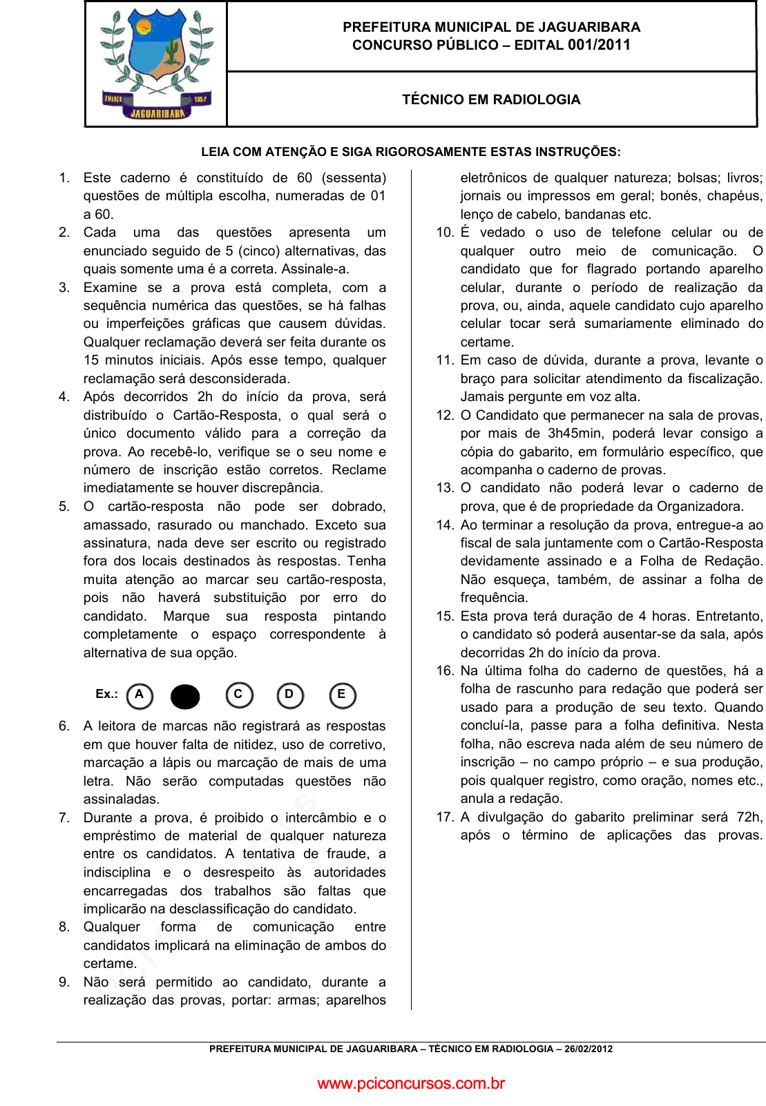 pcimarkpci MDAwMDowMDAwOjAwMDA6MDAwMDowMDAwOmZmZmY6MzZlOTpjMjU5:U2F0LCAxMSBTZXAgMjAyMSAxODoxMDowMiAtMDMwMA== PREFEITURA MUNICIPAL DE JAGUARIBARA – TÉCNICO EM RADIOLOGIA – 26/02/2012 LEIA COM ATENÇÃO E SIGA RIGOROSAMENTE ESTAS INSTRUÇÕES: 1. Este caderno é constituído de 60 (sessenta) questões de múltipla escolha, numeradas de 01 a 60. 2. Cada uma das questões apresenta um enunciado seguido de 5 (cinco) alternativas, das quais somente uma é a correta. Assinale-a. 3. Examine se a prova está completa, com a sequência numérica das questões, se há falhas ou imperfeições gráficas que causem dúvidas. Qualquer reclamação deverá ser feita durante os 15 minutos iniciais. Após esse tempo, qualquer reclamação será desconsiderada. 4. Após decorridos 2h do início da prova, será distribuído o Cartão-Resposta, o qual será o único documento válido para a correção da prova. Ao recebê-lo, verifique se o seu nome e número de inscrição estão corretos. Reclame imediatamente se houver discrepância. 5. O cartão-resposta não pode ser dobrado, amassado, rasurado ou manchado. Exceto sua assinatura, nada deve ser escrito ou registrado fora dos locais destinados às respostas. Tenha muita atenção ao marcar seu cartão-resposta, pois não haverá substituição por erro do candidato. Marque sua resposta pintando completamente o espaço correspondente à alternativa de sua opção. Ex.: A B C D E 6. A leitora de marcas não registrará as respostas em que houver falta de nitidez, uso de corretivo, marcação a lápis ou marcação de mais de uma letra. Não serão computadas questões não assinaladas. 7. Durante a prova, é proibido o intercâmbio e o empréstimo de material de qualquer natureza entre os candidatos. A tentativa de fraude, a indisciplina e o desrespeito às autoridades encarregadas dos trabalhos são faltas que implicarão na desclassificação do candidato. 8. Qualquer forma de comunicação entre candidatos implicará na eliminação de ambos do certame. 9. Não será permitido ao candidato, durante a realização das provas, portar: armas; aparelhos eletrônicos de qualquer natureza; bolsas; livros; jornais ou impressos em geral; bonés, chapéus, lenço de cabelo, bandanas etc. 10. É vedado o uso de telefone celular ou de qualquer outro meio de comunicação. O candidato que for flagrado portando aparelho celular, durante o período de realização da prova, ou, ainda, aquele candidato cujo aparelho celular tocar será sumariamente eliminado do certame. 11. Em caso de dúvida, durante a prova, levante o braço para solicitar atendimento da fiscalização. Jamais pergunte em voz alta. 12. O Candidato que permanecer na sala de provas, por mais de 3h45min, poderá levar consigo a cópia do gabarito, em formulário específico, que acompanha o caderno de provas. 13. O candidato não poderá levar o caderno de prova, que é de propriedade da Organizadora. 14. Ao terminar a resolução da prova, entregue-a ao fiscal de sala juntamente com o Cartão-Resposta devidamente assinado e a Folha de Redação. Não esqueça, também, de assinar a folha de frequência. 15. Esta prova terá duração de 4 horas. Entretanto, o candidato só poderá ausentar-se da sala, após decorridas 2h do início da prova. 16. Na última folha do caderno de questões, há a folha de rascunho para redação que poderá ser usado para a produção de seu texto. Quando concluí-la, passe para a folha definitiva. Nesta folha, não escreva nada além de seu número de inscrição – no campo próprio – e sua produção, pois qualquer registro, como oração, nomes etc., anula a redação. 17. A divulgação do gabarito preliminar será 72h, após o término de aplicações das provas. PREFEITURA MUNICIPAL DE JAGUARIBARA CONCURSO PÚBLICO – EDITAL 001/2011 TÉCNICO EM RADIOLOGIA www.pciconcursos.com.brwww.pciconcursos.com.br pcimarkpci MDAwMDowMDAwOjAwMDA6MDAwMDowMDAwOmZmZmY6MzZlOTpjMjU5:U2F0LCAxMSBTZXAgMjAyMSAxODoxMDowMyAtMDMwMA== www.pciconcursos.com.brwww.pciconcursos.com.br pcimarkpci MDAwMDowMDAwOjAwMDA6MDAwMDowMDAwOmZmZmY6MzZlOTpjMjU5:U2F0LCAxMSBTZXAgMjAyMSAxODoxMDowMyAtMDMwMA== 1 PREFEITURA MUNICIPAL DE JAGUARIBARA – TÉCNICO EM RADIOLOGIA – 26/02/2012 CONHECIMENTOS GERAIS Texto I: EXISTE UMA FÓRMULA PARA UMA BOA HISTÓRIA? 1. 2. 3. 4. 5. 6. 7. 8. 9. 10. 11. 12. 13. 14. “Não sei se tenho uma fórmula, mas alguns truques. Quando fazia A Turma do Pererê, criava as histórias de trás para diante. Primeiro, inventava o fim da história e, depois, o enredo que conduzia a trama até aquele final. Outro dia, imagine, só outro dia descobri que quase todas as histórias bem estruturadas que criei tratam de ritos de passagem. Será uma fórmula? O pior é o autor desavisado ter medo de recorrer a ideias difíceis por achar que criança não vai entender. Ter a tentação de “tatibitatizar” a linguagem. Autor nenhum pode abrir mão das ideias de difícil alcance, mas deve anunciá-las de forma compreensível. Quando li A Terra dos Meninos Pelados, de Graciliano Ramos, via nada além da seca em meu quintal. Sonhava entrar nele como se fosse um mundo mágico, como os personagens do livro fazem. Pedia a meu pai para ele explicar o sentido do verbo “cuidar” na frase “Fernando, cuida que a terra gira”, que eu nunca vira usado daquela maneira, no sentido de “reparar, achar que”. Graciliano era escritor com algo a dizer, sem os proselitismos que vemos em quem faz livro infantil por dinheiro. Fez um conto comunista, sem impor mensagens. Um Monteiro Lobato, por exemplo, não pode ser questionado, como já o foi, porque emite sinal errado ao mostrar uma negra servil como Tia Nastácia ou fazer do casamento a grande meta de vida da Narizinho. Lobato não tinha atitude crítica com seus personagens. Consciência política em história infantil é babaquice. Um autor deve ser cúmplice da criança, não esclarecê-la”. Ziraldo, a Luiz Costa Pereira Junior, Língua 6,