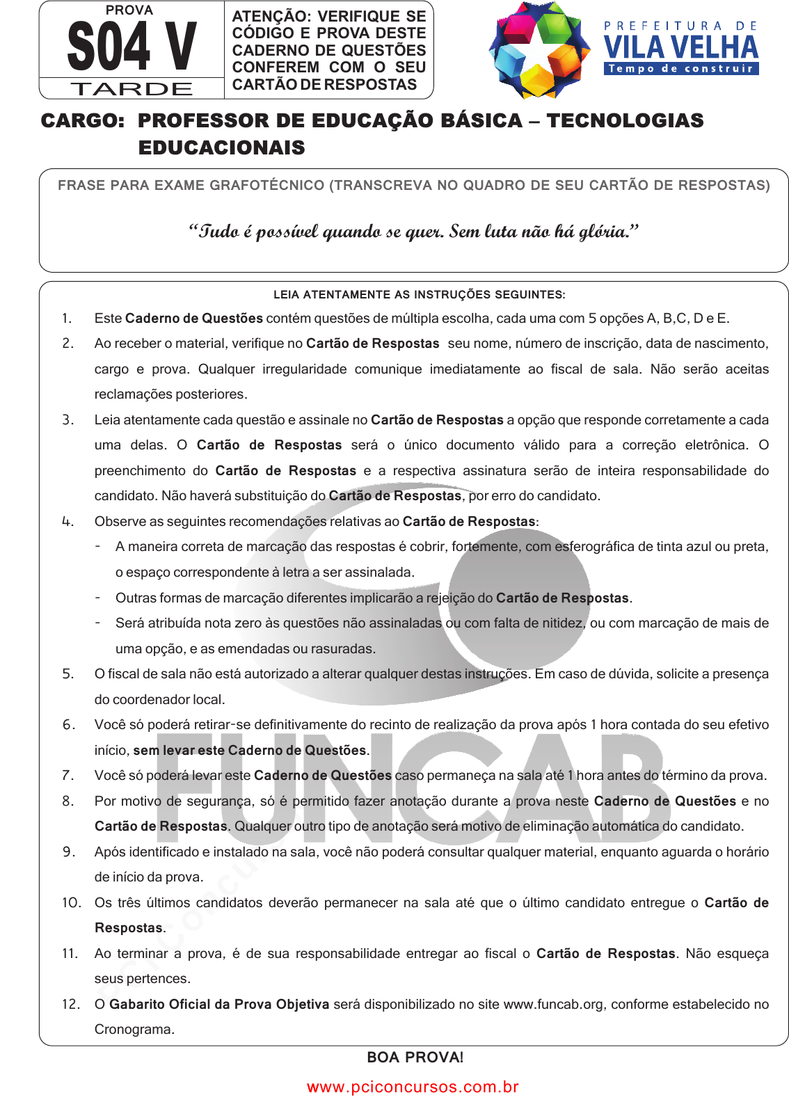 pcimarkpci MDAwMDowMDAwOjAwMDA6MDAwMDowMDAwOmZmZmY6MzZlOTpjMjU5:U3VuLCAxMiBTZXAgMjAyMSAxMTo0MjoyNSAtMDMwMA== CARGO: PROFESSOR DE EDUCAÇÃO BÁSICA TECNOLOGIAS EDUCACIONAIS – FRASE PARA EXAME GRAFOTÉCNICO (TRANSCREVA NO QUADRO DE SEU CARTÃO DE RESPOSTAS) “Tudo é possível quando se quer. Sem luta não há glória.” S04 V ATENÇÃO: VERIFIQUE SE CÓDIGO E PROVA DESTE CADERNO DE QUESTÕES CONFEREM COM O SEU CARTÃO DE RESPOSTAS PROVA TARDE 1. Este contém questões de múltipla escolha, cada uma com 5 opções A, B,C, D e E. 2. Ao receber o material, verifique no seu nome, número de inscrição, data de nascimento, cargo e prova. Qualquer irregularidade comunique imediatamente ao fiscal de sala. Não serão aceitas reclamações posteriores. 3. Leia atentamente cada questão e assinale no a opção que responde corretamente a cada uma delas. O será o único documento válido para a correção eletrônica. O preenchimento do e a respectiva assinatura serão de inteira responsabilidade do candidato. Não haverá substituição do , por erro do candidato. 4. Observe as seguintes recomendações relativas ao : - A maneira correta de marcação das respostas é cobrir, fortemente, com esferográfica de tinta azul ou preta, o espaço correspondente à letra a ser assinalada. - Outras formas de marcação diferentes implicarão a rejeição do . - Será atribuída nota zero às questões não assinaladas ou com falta de nitidez, ou com marcação de mais de uma opção, e as emendadas ou rasuradas. 5. O fiscal de sala não está autorizado a alterar qualquer destas instruções. Em caso de dúvida, solicite a presença do coordenador local. 6. Você só poderá retirar-se definitivamente do recinto de realização da prova após 1 hora contada do seu efetivo início, . 7. Você só poderá levar este caso permaneça na sala até 1 hora antes do término da prova. 8. Por motivo de segurança, só é permitido fazer anotação durante a prova neste e no . Qualquer outro tipo de anotação será motivo de eliminação automática do candidato. 9. Após identificado e instalado na sala, você não poderá consultar qualquer material, enquanto aguarda o horário de início da prova. 10. Os três últimos candidatos deverão permanecer na sala até que o último candidato entregue o . 11. Ao terminar a prova, é de sua responsabilidade entregar ao fiscal o . Não esqueça seus pertences. 12. O será disponibilizado no site www.funcab.org, conforme estabelecido no Cronograma. Caderno de Questões Cartão de Respostas Cartão de Respostas Cartão de Respostas Cartão de Respostas Cartão de Respostas Cartão de Respostas Cartão de Respostas sem levar este Caderno de Questões Caderno de Questões Caderno de Questões Cartão de Respostas Cartão de Respostas Cartão de Respostas Gabarito Oficial da Prova Objetiva LEIA ATENTAMENTE AS INSTRUÇÕES SEGUINTES: BOA PROVA! www.pciconcursos.com.br www.pciconcursos.com.br pcimarkpci MDAwMDowMDAwOjAwMDA6MDAwMDowMDAwOmZmZmY6MzZlOTpjMjU5:U3VuLCAxMiBTZXAgMjAyMSAxMTo0MjoyNSAtMDMwMA== 02 Leia o texto abaixo e responda às questões propostas. Aqui em casa pousou uma esperança. Não a clássica, que tantas vezes verifica-se ser ilusória, embora mesmo assim nos sustente sempre. Mas a outra, bem concreta e verde: o inseto. Houve um grito abafado de um de meus filhos: – Uma esperança! e na parede, bem em cima de sua cadeira! Emoção dele também que unia em uma só as duas esperanças, já tem idade para isso. Antes surpresa minha: esperança é coisa secreta e costuma pousar diretamente em mim, sem ninguém saber, e não acima de minha cabeça numa parede. Pequeno rebuliço: mas era indubitável, lá estava ela, e mais magra e verde não poderia ser. – Ela quase não tem corpo, queixei-me. – Ela só tem alma, explicou meu filho e, como filhos são uma surpresa para nós, descobri com surpresa que ele falava das duas esperanças. Ela caminhava devagar sobre os fiapos das longas pernas, por entre os quadros da parede. Três vezes tentou renitente uma saída entre dois quadros, três vezes teve que retroceder caminho. Custava a aprender. – Ela é burrinha, comentou o menino. – Sei disso, respondi um pouco trágica. – Está agora procurando outro caminho, olhe, coitada, como ela hesita. – Sei, é assim mesmo. – Parece que esperança não tem olhos, mamãe, é guiada pelas antenas. – Sei, continuei mais infeliz ainda. Ali ficamos, não sei quanto tempo olhando. Vigiando-a como se vigiava na Grécia ou em Roma o começo de fogo do lar para que não se apagasse. – Ela se esqueceu de que pode voar, mamãe, e pensa que só pode andar devagar assim. Andava mesmo devagar – estaria por acaso ferida? Ah não, senão de um modo ou de outro escorreria sangue, tem sido sempre assim comigo. Foi então que farejando o mundo que é comível, saiu de trás de um quadro uma aranha. Não uma aranha, mas me parecia “a” aranha. Andando pela sua teia invisível, parecia transladar-se maciamente no ar. Ela queria a esperança. Mas nós também queríamos e, oh! Deus, queríamos menos que comê-la. Meu filho foi buscar a vassoura. Eu disse fracamente, confusa, sem saber se chegara infelizmente a hora certa de perder a esperança: – É que não se mata aranha, me disseram que traz sorte... – Mas ela vai esmigalhar a esperança! respondeu o menino com ferocidade. – Preciso falar com a empregada para limpar atrás dos quadros – falei sentindo a frase deslocada e Uma esperança LÍNGUA PORTUGUESA FUNCAB - Fundação Professor Carlos Augusto Bittencourt ouvindo o certo cansaço que havia na minha voz. Depois devaneei um pouco de como eu seria sucinta e misteriosa com a empregada: eu lhe diria apenas: você faz o favor de facilitar o caminho da esperança. O menino, morta a aranha, fez um trocadilho, com o inseto e a nossa esperança. Meu outro filho, que estava vendo televisão, ouviu e riu de prazer. Não havia dúvida: a esperança pousara em casa, al