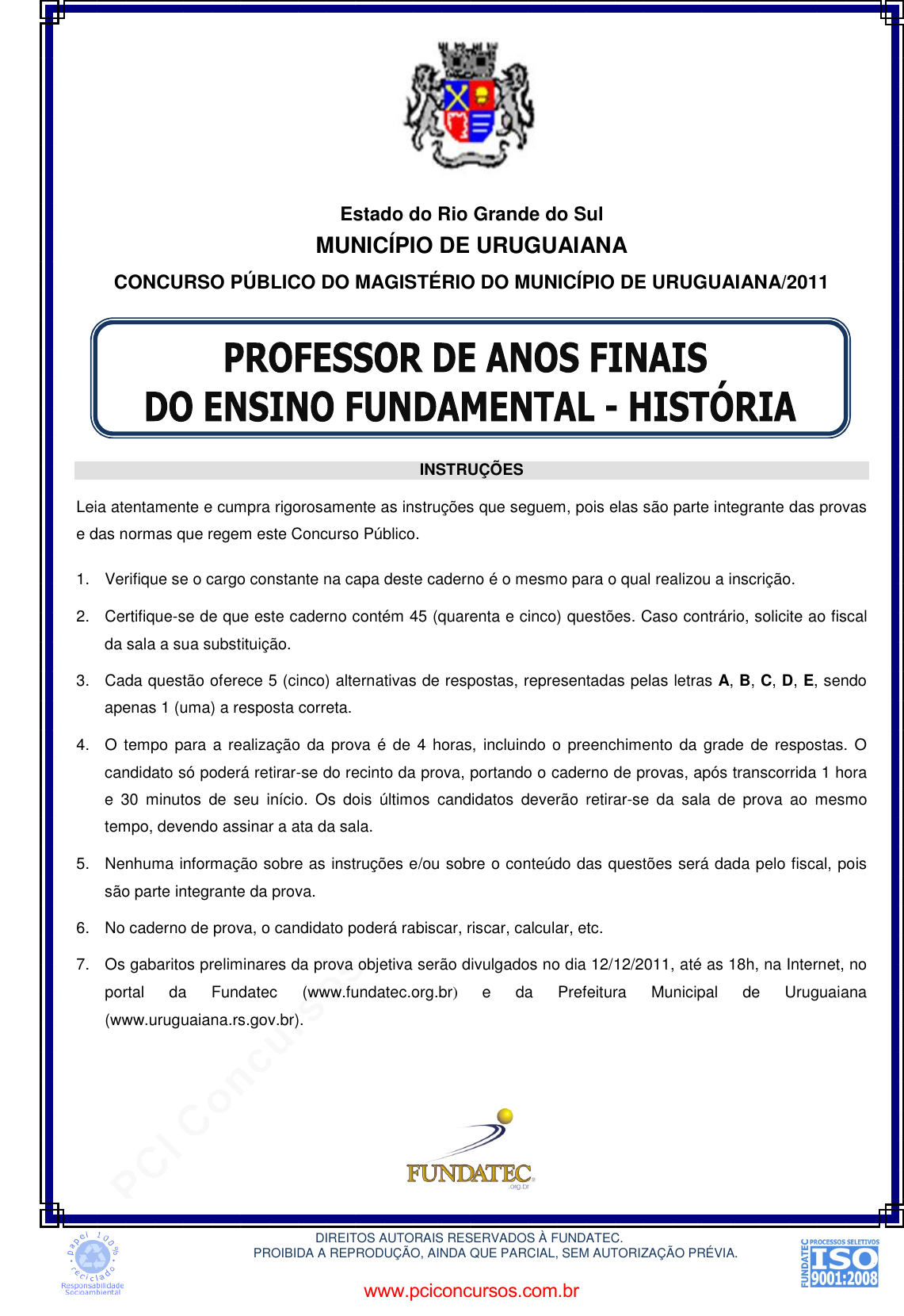 pcimarkpci MDAwMDowMDAwOjAwMDA6MDAwMDowMDAwOmZmZmY6MzZlOTpjMjU5:U3VuLCAxMiBTZXAgMjAyMSAxMzoxOTowMiAtMDMwMA== DIREITOS AUTORAIS RESERVADOS À FUNDATEC. PROIBIDA A REPRODUÇÃO, AINDA QUE PARCIAL, SEM AUTORIZAÇÃO PRÉVIA. Estado do Rio Grande do Sul MUNICÍPIO DE URUGUAIANA CONCURSO PÚBLICO DO MAGISTÉRIO DO MUNICÍPIO DE URUGUAIANA/2011 INSTRUÇÕES Leia atentamente e cumpra rigorosamente as instruções que seguem, pois elas são parte integrante das provas e das normas que regem este Concurso Público. 1. Verifique se o cargo constante na capa deste caderno é o mesmo para o qual realizou a inscrição. 2. Certifique-se de que este caderno contém 45 (quarenta e cinco) questões. Caso contrário, solicite ao fiscal da sala a sua substituição. 3. Cada questão oferece 5 (cinco) alternativas de respostas, representadas pelas letras A, B, C, D, E, sendo apenas 1 (uma) a resposta correta. 4. O tempo para a realização da prova é de 4 horas, incluindo o preenchimento da grade de respostas. O candidato só poderá retirar-se do recinto da prova, portando o caderno de provas, após transcorrida 1 hora e 30 minutos de seu início. Os dois últimos candidatos deverão retirar-se da sala de prova ao mesmo tempo, devendo assinar a ata da sala. 5. Nenhuma informação sobre as instruções e/ou sobre o conteúdo das questões será dada pelo fiscal, pois são parte integrante da prova. 6. No caderno de prova, o candidato poderá rabiscar, riscar, calcular, etc. 7. Os gabaritos preliminares da prova objetiva serão divulgados no dia 12/12/2011, até as 18h, na Internet, no portal da Fundatec (www.fundatec.org.br) e da Prefeitura Municipal de Uruguaiana (www.uruguaiana.rs.gov.br). www.pciconcursos.com.br pcimarkpci MDAwMDowMDAwOjAwMDA6MDAwMDowMDAwOmZmZmY6MzZlOTpjMjU5:U3VuLCAxMiBTZXAgMjAyMSAxMzoxOTowMiAtMDMwMA== PROVA A_V04_7/12/201117:49:41 Execução: Fundatec NÍVEL SUPERIOR 2 LÍNGUA PORTUGUESA Instrução: As questões de números 01 a 15 referem-se ao texto abaixo. Papéis de pai 01 02 03 04 05 06 07 08 09 10 11 12 13 14 15 16 17 18 19 20 21 22 23 24 25 26 27 28 29 30 31 32 33 34 35 36 37 38 39 40 41 42 43 44 45 46 47 48 49 50 51 Todo pai já sabe que cuidar de filhos pequenos é uma aventura contínua. Num certo instante, reinam a paz e a harmonia; em outro, um problema de saúde das crianças ___ a casa em polvorosa; mais adiante, um filho contrariado é capaz de gerar reflexos negativos em todo o lar. Os pais precisam de muito jogo de cintura e estar sempre preparados para assumir o papel adequado ___ ocasião, que pode ser de professor, de supervisor, de fiscalizador, de enfermeiro ou de colega de brincadeiras. Esse conceito elástico da paternidade é reforçado por um estudo conduzido por duas psicólogas do desenvolvimento, a canadense Joan Grusec, da Universidade de Toronto, e a israelense Maayan Davidov, da Universidade Hebraica de Jerusalém. Elas revisaram pesquisas envolvendo a relação de pais e filhos e identificaram cinco formas de interação que influenciam o amadurecimento dos pequenos. Na revista Child Development, as pesquisadoras ressaltam que não __ um "modelo" de criação, mas sim papéis diferentes que se alternam à medida que a situação se desenrola. Entender essa dinâmica ajuda os pais a conquistar o equilíbrio. Os papéis descritos por Joan e Maayan são recorrentes, mas provavelmente __ outros e nada impede que dois ou mais ocorram ao mesmo tempo. Quando falam de papéis de pais, as psicólogas não querem dizer que apenas genitores biológicos (ou adotivos) podem exercê-los. Um adulto responsável pelas crianças, um irmão ou uma criança mais velha pode assumir a tarefa. Veja, a seguir, as principais formas de interação. Guarda de trânsito: Participar de grupos como família, vizinhança, turma do colégio e culto religioso serve como escola para o aprendizado de comportamentos sociais. Os ensinamentos dos pais sobre rituais, rotinas e práticas das organizações são vivenciados e transformados, proporcionando um aprendizado implícito das normas: papéis sexuais, expectativas culturais, ideias sobre a classe social e comportamento adequado em público. Esses recursos ajudam a criança a moldar uma identidade social estável. Protetor: Como outras espécies, os humanos desenvolveram comportamentos que capacitam os membros da prole a chamar a atenção de um adulto para obter ajuda. Se uma criança chora em busca de proteção, uma reação dos pais demonstrando sensibilidade ao sinal resulta em benefícios a curto e longo prazo para ela. Com o reconhecimento, o sistema neurobiológico da criança passa a ser "treinado" para, eventualmente, lidar com o estresse por conta própria. Ela se torna mais empática ao sofrimento de outras pessoas e tende a ajudar os pais. Confortar um filho agitado equivale a investir na sua cooperação futura, seu desenvolvimento emocional positivo e seu bem-estar geral. Professor: Graças ao papel de professor a criança aprende a usar o vaso sanitário, a manejar talheres, a comportar-se em situações sociais complexas e a lidar com sentimentos. Segundo as psicólogas, os pais competentes ensinam por etapas, sempre de forma íntima e gentil. Depois de avaliarem o que o filho já sabe, instruem sobre o passo seguinte e oferecem apoio até a criança assimilar o conteúdo transmitido. Com isso, ela não apenas ______ novos ensinamentos como passa a compreender o quadro mais abrangente do problema. Mães que conversam com os filhos sobre questões emocionais específicas de forma coerente, fornecendo detalhes, interpretações e comentários, ajudam a desenvolver sua compreensão sobre a vida emocional. Disciplinador: Um pai tem de exercer poder sobre os filhos para impor disciplina. Escolher a ação disciplinar equilibrada ao ato que a _______ significa estimular na criança o senso de responsabilidade. Mas, se a reação dos pais for disciplinarmente fraca, o comportamento que gerou o problema não vai mudar. Já 