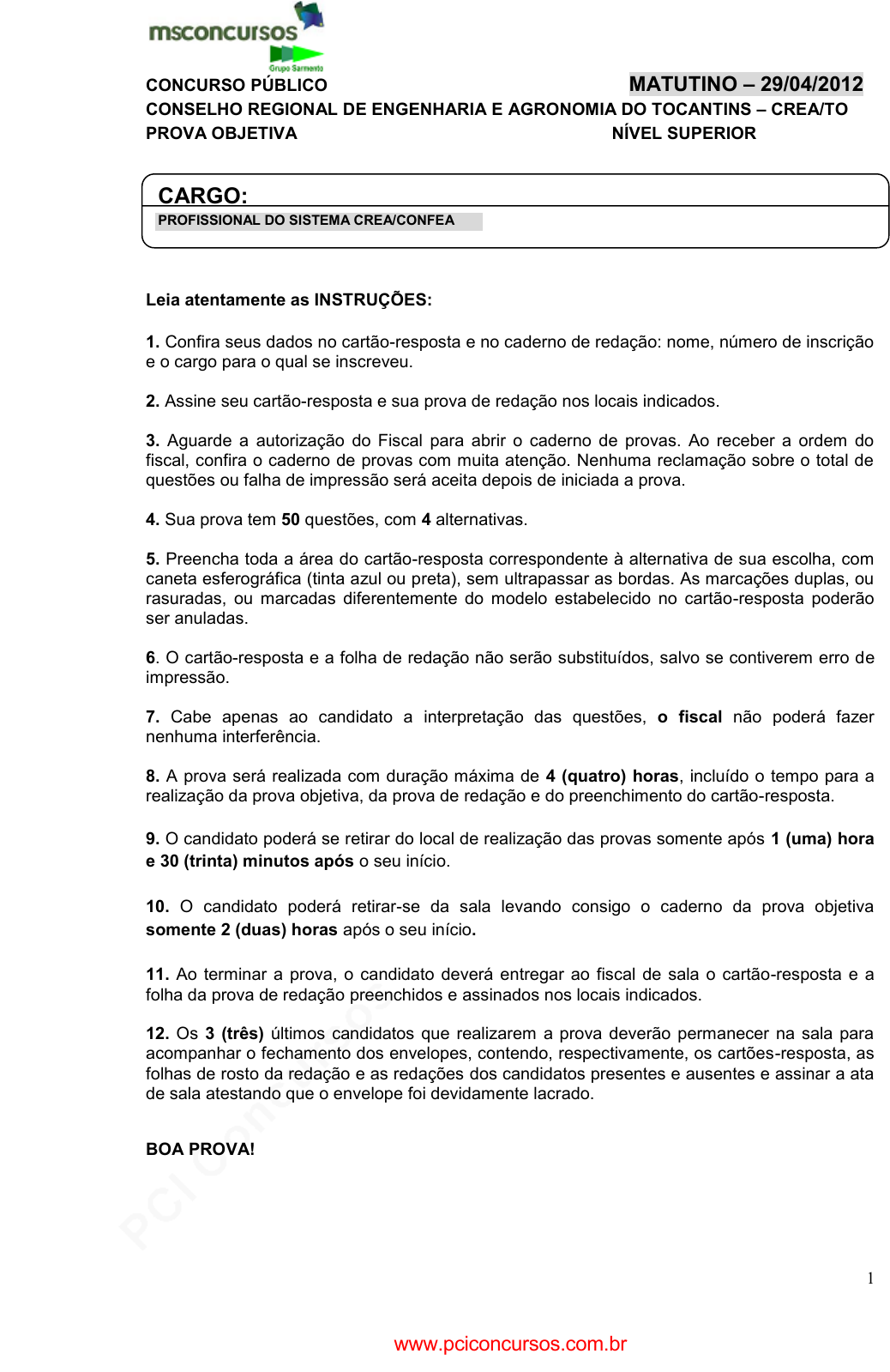 pcimarkpci MDAwMDowMDAwOjAwMDA6MDAwMDowMDAwOmZmZmY6MzZlOTpjMjU5:TW9uLCAxMyBTZXAgMjAyMSAxMDo1NDoxMSAtMDMwMA== 1 CONCURSO PÚBLICO MATUTINO – 29/04/2012 CONSELHO REGIONAL DE ENGENHARIA E AGRONOMIA DO TOCANTINS – CREA/TO PROVA OBJETIVA NÍVEL SUPERIOR CARGO: PROFISSIONAL DO SISTEMA CREA/CONFEA Leia atentamente as INSTRUÇÕES: 1. Confira seus dados no cartão-resposta e no caderno de redação: nome, número de inscrição e o cargo para o qual se inscreveu. 2. Assine seu cartão-resposta e sua prova de redação nos locais indicados. 3. Aguarde a autorização do Fiscal para abrir o caderno de provas. Ao receber a ordem do fiscal, confira o caderno de provas com muita atenção. Nenhuma reclamação sobre o total de questões ou falha de impressão será aceita depois de iniciada a prova. 4. Sua prova tem 50 questões, com 4 alternativas. 5. Preencha toda a área do cartão-resposta correspondente à alternativa de sua escolha, com caneta esferográfica (tinta azul ou preta), sem ultrapassar as bordas. As marcações duplas, ou rasuradas, ou marcadas diferentemente do modelo estabelecido no cartão-resposta poderão ser anuladas. 6. O cartão-resposta e a folha de redação não serão substituídos, salvo se contiverem erro de impressão. 7. Cabe apenas ao candidato a interpretação das questões, o fiscal não poderá fazer nenhuma interferência. 8. A prova será realizada com duração máxima de 4 (quatro) horas, incluído o tempo para a realização da prova objetiva, da prova de redação e do preenchimento do cartão-resposta. 9. O candidato poderá se retirar do local de realização das provas somente após 1 (uma) hora e 30 (trinta) minutos após o seu início. 10. O candidato poderá retirar-se da sala levando consigo o caderno da prova objetiva somente 2 (duas) horas após o seu início. 11. Ao terminar a prova, o candidato deverá entregar ao fiscal de sala o cartão-resposta e a folha da prova de redação preenchidos e assinados nos locais indicados. 12. Os 3 (três) últimos candidatos que realizarem a prova deverão permanecer na sala para acompanhar o fechamento dos envelopes, contendo, respectivamente, os cartões-resposta, as folhas de rosto da redação e as redações dos candidatos presentes e ausentes e assinar a ata de sala atestando que o envelope foi devidamente lacrado. BOA PROVA! www.pciconcursos.com.br pcimarkpci MDAwMDowMDAwOjAwMDA6MDAwMDowMDAwOmZmZmY6MzZlOTpjMjU5:TW9uLCAxMyBTZXAgMjAyMSAxMDo1NDoxMSAtMDMwMA== 2 PROVA OBJETIVA – PROFISSIONAL DO SISTEMA CREA/CONFEA LÍNGUA PORTUGUESA Leia o texto: “Dengue: pagamento de bônus a agentes cria polêmica no Tocantins”, para responder às questões de 1 a 10: Brasília – Dados do Ministério da Saúde mostram que de janeiro a 11 de fevereiro deste ano foram identificados 743,7 casos de dengue para cada 100 mil pessoas em Palmas, capital do Tocantins. Em números absolutos, foram 1.403 casos este ano, contra 312 no mesmo período do ano passado. A capital tocantinense só perde para a cidade do Rio de Janeiro em quantidade de casos, no conjunto dos dez municípios com população superior a 100 mil pessoas. Um dos pontos de divergência entre o governo do estado e a prefeitura da capital é o pagamento de bônus aos agentes de controle da dengue, que visitam as casas, o comércio e as empresas em busca de criadouros do mosquito transmissor, onde borrifam larvicida e orientam os moradores para prevenir a doença. Em dezembro passado, a prefeitura de Palmas recebeu verba adicional do Ministério da Saúde de cerca de R$ 300 mil para combate à doença. A partir daí, decidiu oferecer bônus no valor de R$ 150 aos agentes que cumprirem a meta de vistoriar 25 imóveis por dia. No total, o município dispõe de 96 agentes para inspecionar 80 mil imóveis, entre casas, terrenos baldios e centros comerciais. Segundo o diretor de Vigilância em Saúde de Palmas, Cláudio Garcia, o incentivo tem dado bom resultado. Antes do bônus, os agentes inspecionavam, em média, 15 imóveis diariamente. Nas primeiras semanas do ano, foram 41 mil visitas – 10 mil a mais em relação a janeiro de 2011. A ideia da bonificação é inspirada, informou Garcia, em iniciativa adotada em Minas Gerais e que teve sucesso. “Estamos fazendo aquilo que deu certo em outro lugar”, disse Garcia à Agência Brasil. O diretor reconhece, porém, que o aumento das visitas não irá refletir de imediato na queda dos casos de dengue no município. Na avaliação do diretor estadual de Vigilância de Doenças Vetoriais e Controle de Zoonoses, Whisllay Bastos, os agentes deveriam ser deslocados e as ações reforçadas em áreas da cidade que estão descobertas, em vez da premiação. “Não faz muito sentido. O Ministério Público também está questionando”. A promotora do Ministério Público do Tocantins Maria Roseli Pery critica a iniciativa. Para ela, Palmas vive um surto de dengue porque os agentes e a gestão da secretaria municipal têm falhado. “Ele [agente] entra na residência para acabar com o foco e não realiza a atividade de forma eficiente. Essa bonificação, a meu ver, é equivocada”, disse a promotora de Justiça, responsável por cuidar de temas de saúde pública. Maria Roseli Pery quer ainda uma lista com os nomes dos agentes que não cumpriram as obrigações. (...) Fonte: Agência Brasil. Publicado em 21/02/2012 (Disponível em: Acesso: http://www.redebrasilatual.com.br/temas/saude/2012/02/dengue-pagamento-de-bonus-a-agentes-cria- polemica-no-tocantins) 01. O objetivo central do texto é: a) Persuadir o leitor a protestar contra a decisão do município de bonificar os agentes de controle da dengue. b) Alertar a população sobre os riscos da dengue e sobre o possível desvio de verba pública para o combate à doença. c) Apresentar uma opinião sobre a polêmica causada pela bonificação dos agentes de controle da dengue. d) Informar a população sobre a polêmica causada pela bonificação dos agentes de