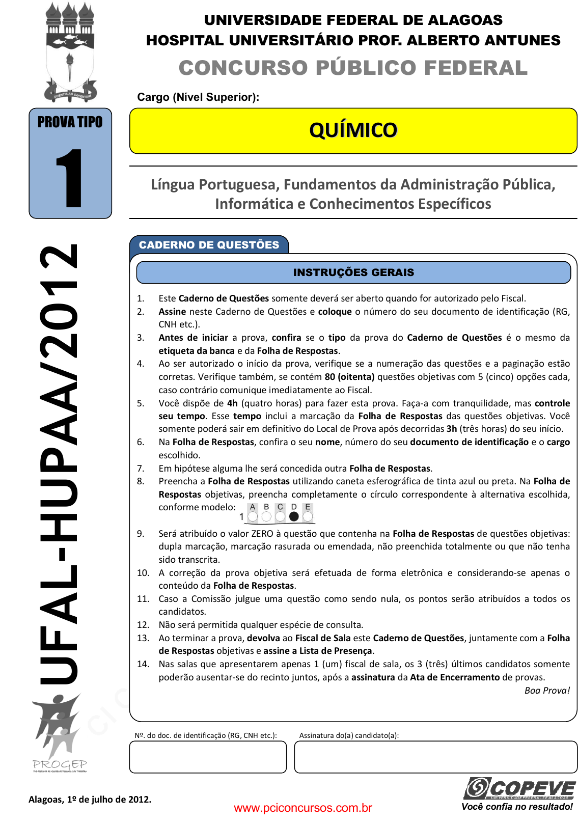 pcimarkpci MDAwMDowMDAwOjAwMDA6MDAwMDowMDAwOmZmZmY6MzZlOTpjMjU5:TW9uLCAxMyBTZXAgMjAyMSAxNjowNzozMSAtMDMwMA== UNIVERSIDADE FEDERAL DE ALAGOAS HOSPITAL UNIVERSITÁRIO PROF. ALBERTO ANTUNES CONCURSO PÚBLICO FEDERAL Língua Portuguesa, Fundamentos da Administração Pública, Informática e Conhecimentos Específicos Nº. do doc. de identificação (RG, CNH etc.): Assinatura do(a) candidato(a): Você confia no resultado! Alagoas, 1º de julho de 2012. U F A L - H U P A A / 2 0 1 2 CADERNO DE QUESTÕES 1. Este Caderno de Questões somente deverá ser aberto quando for autorizado pelo Fiscal. 2. Assine neste Caderno de Questões e coloque o número do seu documento de identificação (RG, CNH etc.). 3. Antes de iniciar a prova, confira se o tipo da prova do Caderno de Questões é o mesmo da etiqueta da banca e da Folha de Respostas. 4. Ao ser autorizado o início da prova, verifique se a numeração das questões e a paginação estão corretas. Verifique também, se contém 80 (oitenta) questões objetivas com 5 (cinco) opções cada, caso contrário comunique imediatamente ao Fiscal. 5. Você dispõe de 4h (quatro horas) para fazer esta prova. Faça-a com tranquilidade, mas controle seu tempo. Esse tempo inclui a marcação da Folha de Respostas das questões objetivas. Você somente poderá sair em definitivo do Local de Prova após decorridas 3h (três horas) do seu início. 6. Na Folha de Respostas, confira o seu nome, número do seu documento de identificação e o cargo escolhido. 7. Em hipótese alguma lhe será concedida outra Folha de Respostas. 8. Preencha a Folha de Respostas utilizando caneta esferográfica de tinta azul ou preta. Na Folha de Respostas objetivas, preencha completamente o círculo correspondente à alternativa escolhida, conforme modelo: 9. Será atribuído o valor ZERO à questão que contenha na Folha de Respostas de questões objetivas: dupla marcação, marcação rasurada ou emendada, não preenchida totalmente ou que não tenha sido transcrita. 10. A correção da prova objetiva será efetuada de forma eletrônica e considerando-se apenas o conteúdo da Folha de Respostas. 11. Caso a Comissão julgue uma questão como sendo nula, os pontos serão atribuídos a todos os candidatos. 12. Não será permitida qualquer espécie de consulta. 13. Ao terminar a prova, devolva ao Fiscal de Sala este Caderno de Questões, juntamente com a Folha de Respostas objetivas e assine a Lista de Presença. 14. Nas salas que apresentarem apenas 1 (um) fiscal de sala, os 3 (três) últimos candidatos somente poderão ausentar-se do recinto juntos, após a assinatura da Ata de Encerramento de provas. Boa Prova! INSTRUÇÕES GERAIS QQUUÍÍMMIICCOO Cargo (Nível Superior): PROVA TIPO 1 www.pciconcursos.com.br pcimarkpci MDAwMDowMDAwOjAwMDA6MDAwMDowMDAwOmZmZmY6MzZlOTpjMjU5:TW9uLCAxMyBTZXAgMjAyMSAxNjowNzozMSAtMDMwMA== Nível Superior – Químico 2 Prova tipo 1 01 – JUL – 2012 Concurso UFAL / HUPAA 2012 2 PORTUGUÊS As questões 1 e 2 referem-se ao texto abaixo. Tenho a impressão de que estou cercado de inimigos, e, como caminho devagar, noto que os outros têm demasiada pressa em pisar-me os pés e bater-me nos calcanhares. Quanto mais me vejo rodeado mais me isolo e entristeço. Quero recolher-me, afastar-me daqueles estranhos que não compreendo, ouvir o Currupaco, ler, escrever. A multidão é hostil e terrível (Graciliano Ramos – trecho de Angústia). 1. Considere as seguintes afirmações: “Tenho a impressão de que estou cercado de inimigos” e “A multidão é hostil e terrível”. Esse ponto de vista, expresso pelas duas sentenças, A) apresenta uma constituição linear de sentidos peculiar às estratégias da argumentação, ou seja, o que está expresso na primeira sentença é referendado na última. B) apresenta uma incongruência semântica, pois, se a multidão é hostil, ele não poderia sentir-se rodeado de inimigos. C) é contrário ao estado psíquico do narrador: não consta em seus desejos o enovelamento de si mesmo, que é a capacidade de constituir-se para o mundo a partir de uma imagem inicial. D) tem um efeito expletivo para o conjunto de sentidos em evidência no texto, já que o narrador não se detém em referências que possam definir alguma ação hostil da multidão. E) confirma a frivolidade das ações do narrador, referendadas pela sua necessidade de ajustar-se e definir a inserção nas relações sociais cotidianas. 2. Considere as palavras sublinhadas no excerto: “e, como caminho devagar, noto que os outros têm demasiada pressa em pisar-me os pés e bater-me nos calcanhares”. É correto afirmar que A) é um exemplo de metáfora, estratégia comum nos textos de ficção. B) se evidencia a contradição, marcada pelo forte apelo metonímico. C) essas palavras são expressões pleonásticas. D) é um exemplo de personificação. E) há uma relação semântica de contraste, portanto, trata-se de uma concepção antitética. As questões de 3 a 6 referem-se ao texto abaixo. Existem milhões de pessoas em todo o mundo ligadas às chamadas redes sociais virtuais. Sendo um espaço virtual em que – por definição – o contacto físico não existe, e tratando-se de um lugar onde é fácil cada um "inventar" uma personagem ou uma personalidade, todo o cuidado é pouco. E não basta que as pessoas continuem a encarar com boa-fé as tecnologias e a pensar que "do outro lado" encontram alguém sério ou bem- intencionado: se a prevenção não é suficiente – e creio que se começa a perceber que não – então é urgente que se regule a sua utilização (http://www.dn.pt). 3. Segundo o texto, as redes sociais virtuais A) configuram a ideia de relação pessoal fundamentada principalmente no contato físico. B) são mecanismos de encontro imprescindíveis às relações humanas. C) representam para as relações sociais uma zona constante de perigo se não encaradas com cautela. D) constituem-se basicamente de um modelo de distancia