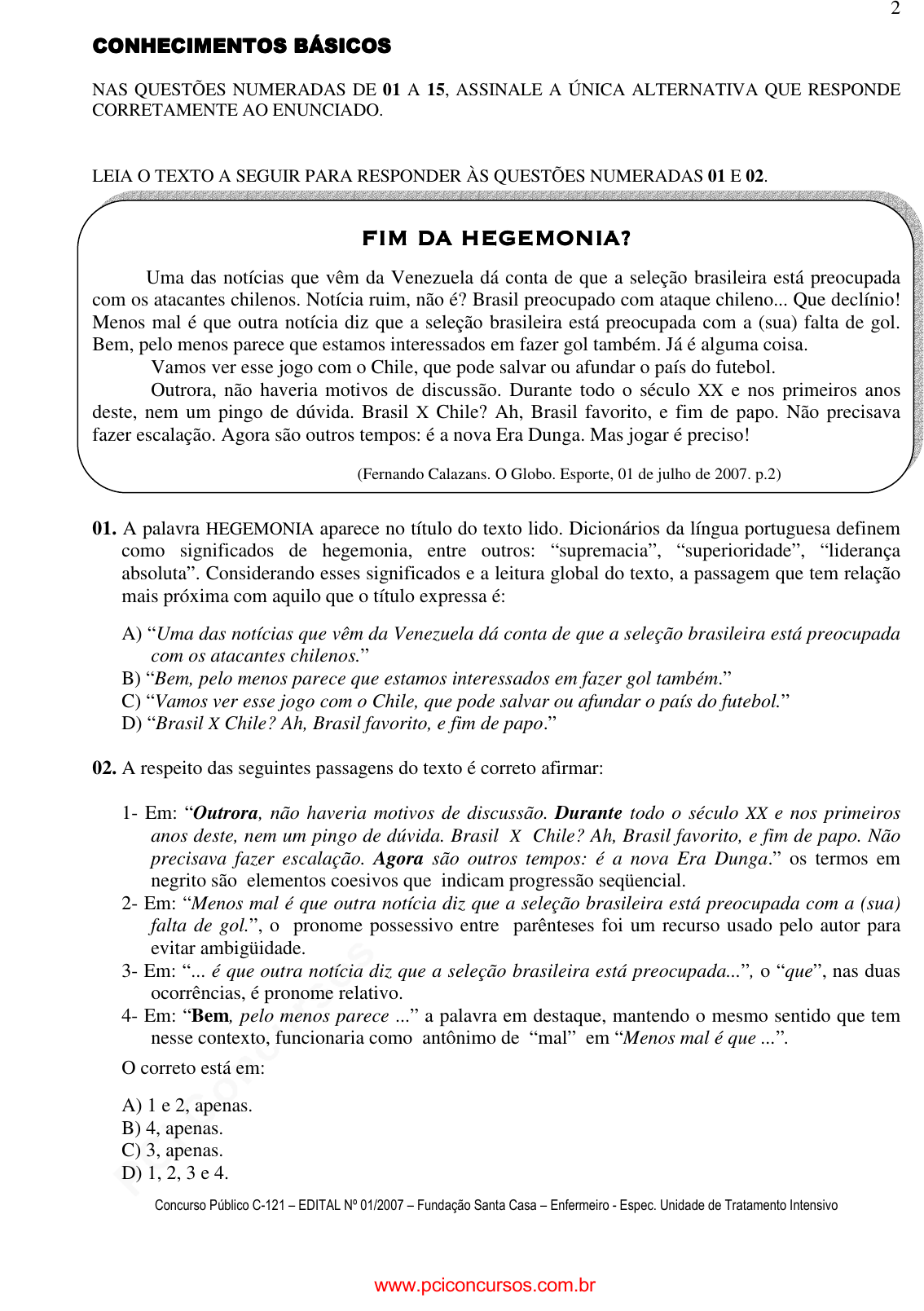 pcimarkpci MDAwMDowMDAwOjAwMDA6MDAwMDowMDAwOmZmZmY6MzZlOTpjMjU5:V2VkLCAxNSBTZXAgMjAyMSAxMzo0MDowNiAtMDMwMA== Concurso Público C-121 – EDITAL Nº 01/2007 – Fundação Santa Casa – Enfermeiro - Espec. Unidade de Tratamento Intensivo 2 CONHECIMENTOS BÁSICOSCONHECIMENTOS BÁSICOSCONHECIMENTOS BÁSICOSCONHECIMENTOS BÁSICOS NAS QUESTÕES NUMERADAS DE 01 A 15, ASSINALE A ÚNICA ALTERNATIVA QUE RESPONDE CORRETAMENTE AO ENUNCIADO. LEIA O TEXTO A SEGUIR PARA RESPONDER ÀS QUESTÕES NUMERADAS 01 E 02. FIM DA HEGEMONIA?FIM DA HEGEMONIA?FIM DA HEGEMONIA?FIM DA HEGEMONIA? Uma das notícias que vêm da Venezuela dá conta de que a seleção brasileira está preocupada com os atacantes chilenos. Notícia ruim, não é? Brasil preocupado com ataque chileno... Que declínio! Menos mal é que outra notícia diz que a seleção brasileira está preocupada com a (sua) falta de gol. Bem, pelo menos parece que estamos interessados em fazer gol também. Já é alguma coisa. Vamos ver esse jogo com o Chile, que pode salvar ou afundar o país do futebol. Outrora, não haveria motivos de discussão. Durante todo o século XX e nos primeiros anos deste, nem um pingo de dúvida. Brasil X Chile? Ah, Brasil favorito, e fim de papo. Não precisava fazer escalação. Agora são outros tempos: é a nova Era Dunga. Mas jogar é preciso! (Fernando Calazans. O Globo. Esporte, 01 de julho de 2007. p.2) 01. A palavra HEGEMONIA aparece no título do texto lido. Dicionários da língua portuguesa definem como significados de hegemonia, entre outros: “supremacia”, “superioridade”, “liderança absoluta”. Considerando esses significados e a leitura global do texto, a passagem que tem relação mais próxima com aquilo que o título expressa é: A) “Uma das notícias que vêm da Venezuela dá conta de que a seleção brasileira está preocupada com os atacantes chilenos.” B) “Bem, pelo menos parece que estamos interessados em fazer gol também.” C) “Vamos ver esse jogo com o Chile, que pode salvar ou afundar o país do futebol.” D) “Brasil X Chile? Ah, Brasil favorito, e fim de papo.” 02. A respeito das seguintes passagens do texto é correto afirmar: 1- Em: “Outrora, não haveria motivos de discussão. Durante todo o século XX e nos primeiros anos deste, nem um pingo de dúvida. Brasil X Chile? Ah, Brasil favorito, e fim de papo. Não precisava fazer escalação. Agora são outros tempos: é a nova Era Dunga.” os termos em negrito são elementos coesivos que indicam progressão seqüencial. 2- Em: “Menos mal é que outra notícia diz que a seleção brasileira está preocupada com a (sua) falta de gol.”, o pronome possessivo entre parênteses foi um recurso usado pelo autor para evitar ambigüidade. 3- Em: “... é que outra notícia diz que a seleção brasileira está preocupada...”, o “que”, nas duas ocorrências, é pronome relativo. 4- Em: “Bem, pelo menos parece ...” a palavra em destaque, mantendo o mesmo sentido que tem nesse contexto, funcionaria como antônimo de “mal” em “Menos mal é que ...”. O correto está em: A) 1 e 2, apenas. B) 4, apenas. C) 3, apenas. D) 1, 2, 3 e 4. www.pciconcursos.com.br pcimarkpci MDAwMDowMDAwOjAwMDA6MDAwMDowMDAwOmZmZmY6MzZlOTpjMjU5:V2VkLCAxNSBTZXAgMjAyMSAxMzo0MDowNiAtMDMwMA== Concurso Público C-121 – EDITAL Nº 01/2007 – Fundação Santa Casa – Enfermeiro - Espec. Unidade de Tratamento Intensivo 3 LEIA O TEXTO A SEGUIR PARA RESPONDER ÀS QUESTÕES 03 E 04. NAVEGAR É PRECISO ..NAVEGAR É PRECISO ..NAVEGAR É PRECISO ..NAVEGAR É PRECISO ...... “Navegar é preciso”, frase que remete ao tempo de Virgílio e Horácio, trazia provavelmente o sentido de que era necessário colocar as naves no mar, fazer novas descobertas. Havia grandes, inúmeras dificuldades. Não obstante, isso não foi impedimento... O sentimento de vencer obstáculos foi, provavelmente, o que mais estimulou a conquistas. E muitos foram os que saíram ao mar em busca de novos mundos absolutamente estranhos para eles. Que impulso era esse que empurrava para o desconhecido todos os homens destemidos que viveram naqueles tempos, fazendo-os enfrentar feras e tempestades nos mares bravios? Conhecer novas terras, dominar o mundo? Coragem, curiosidade, paixão, loucura? De que sentimentos eram tomados esses homens? Enfrentar o desconhecido seria mais simples do que viver nos novos tempos? Como na época das grandes descobertas, ou no tempo em que a caça às baleias ainda era permitida, ou na verdadeira odisséia moderna contada por Amyr Klink ao navegar pelos mares do Atlântico Sul, o sentimento humano deve ser parecido. Navegar é preciso! (Sueli Oliveira http://www.baleiassonline.hpg.ig.com.br/historia.html. Adaptado ) 03. Avalie as afirmativas seguintes, a respeito dos elementos lingüísticos do texto, e assinale a correta: A) Em: “... fazendo-os enfrentar feras...”, no 2º parágrafo, o pronome enclítico retoma a palavra “tempos”. B) Em: “... o que mais estimulou a conquistas.” e “... seria mais simples ...” as duas ocorrências do advérbio “mais” – intensificando “estimulou” e “simples” – comprovam que advérbios podem modificar tanto verbos como adjetivos. C) Em: “Havia grandes, inúmeras dificuldades.” o verbo haver, por ter sentido de existir, também poderia ser empregado no plural, obedecendo, assim, às regras de concordância da norma dita culta do português. D) De acordo com as estruturas do texto, as causas para coerência com a conotação de necessidade que há em “Navegar é preciso” podem assim ser enumeradas: “... enfrentar feras e tempestades...”; “... mares bravios” e “... mundos absolutamente estranhos ...”. 04. Tendo em vista o texto acima e o tema que ele focaliza, avalie os itens que se seguem: 1- A ausência de vírgula para separar a oração sublinhada em “... todos os homens destemidos que viveram naqueles tempos...” indica que ela constitui restrição a “todos os h