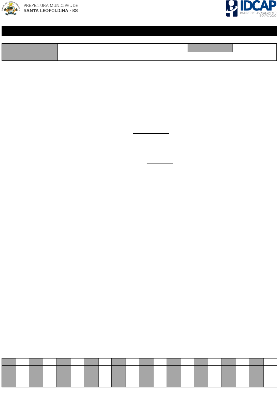PREFEITURA MUNICIPAL DE SANTA LEOPOLDINA PROCESSO SELETIVO Nº 004/2019 1 PROFESSOR DE LÍNGUA PORTUGUESA Nome do Candidato: Nº de Inscrição: Assinatura: LEIA COM ATENÇÃO AS INSTRUÇÕES ABAIXO: 1. É proibido folhear o caderno de provas antes da autorização do fiscal. 2. Confira se este caderno de provas corresponde ao cargo (cabeçalho desta página) para o qual você se candidatou. 3. Confira os dados impressos no cartão resposta. Quaisquer problemas deverão ser comunicados ao fiscal de sala, para registro em ata. 4. Assine o cartão de respostas. 5. Verifique se este caderno de prova contém 40 questões. Não serão consideradas reclamações posteriores ao término da prova. 6. Cada questão da prova objetiva constitui-se de cinco alternativas, identificadas pelas letras A, B, C, D e E, das quais apenas uma será a resposta correta. 7. Preencha primeiramente o rascunho do cartão de respostas da prova objetiva, que se encontra no final desta página; em seguida, passe-o a limpo, com caneta esferográfica azul ou preta. Qualquer outra cor de tinta no cartão de respostas não será aceita pela leitora ótica. 8. Preencha o cartão de respostas da prova objetiva completando totalmente a opção, ao lado dos números, que corresponde à resposta correta. 9. Serão consideradas incorretas questões para as quais o candidato tenha preenchido mais de uma opção no cartão de respostas, bem como questões cuja opção apresente rasuras no cartão de respostas. 10. O cartão resposta não será substituído em hipótese alguma; portanto, evite rasuras. 11. Em sala, a comunicação entre os candidatos não será permitida, sob qualquer forma ou alegação. 12. Não será permitido o uso de calculadoras, dicionários, telefones celulares, pen drive ou de qualquer outro recurso didático, elétrico ou eletrônico, nem o uso de qualquer acessório que cubra as orelhas do candidato. 13. A prova objetiva terá duração máxima de 3h, incluído o tempo para preenchimento do cartão de respostas. 14. O candidato somente poderá retirar-se do local de prova após 1 (uma) hora de seu início e poderá levar o caderno de provas 1 (uma) hora antes de seu término. 15. Os (3) três últimos candidatos somente poderão retirar-se da sala de prova simultaneamente e devem fazê-lo após a assinatura da ata de sala. 16. As saídas para: banheiro, tomar medicamento e água, só serão permitidas acompanhadas por um fiscal. 17. Os fiscais NÃO estão autorizados a prestar informações de interpretação das questões. Sua função é apenas fiscalizar e orientar quanto ao funcionamento do certame. 18. Ao concluir a prova, entregue ao fiscal de sala o cartão de respostas. Boa prova! 01 02 03 04 05 06 07 08 09 10 11 12 13 14 15 16 17 18 19 20 21 22 23 24 25 26 27 28 29 30 31 32 33 34 35 36 37 38 39 40 PREFEITURA MUNICIPAL DE SANTA LEOPOLDINA PROCESSO SELETIVO Nº 004/2019 2 RASCUNHO PREFEITURA MUNICIPAL DE SANTA LEOPOLDINA PROCESSO SELETIVO Nº 004/2019 3 LÍNGUA PORTUGUESA As questões de 01 a 05 dizem respeito ao Texto abaixo. Leia-o atentamente antes de respondê-las. Ética nas redes sociais – Pratique! Quando navegamos na internet, criamos a ilusão de estarmos “imunes” às nossas publicações, textos, fotos, vídeos... Porém, muitos se esquecem de que podemos ser prejudicados dependendo do que postamos, pois sempre somos responsáveis por nossas ações online. Algumas situações podem até gerar processos por causa de uma leve brincadeira, isso sem contar demissões por justa causa, separações de casais, brigas entre amigos e etc., por isso é importante manter uma postura ética não só nas redes sociais, mas em toda internet. Na dúvida, não publique! Todos nós sabemos que a internet abre possibilidades para nos expressarmos com mais liberdade, encontrarmos pessoas que pensam de maneira parecida (ou não), mas lembre-se: “O seu direito termina onde começa o direito do outro”. Já que a situação não é tão legal quando o prejudicado é você, então antes de escrever por impulso, pense um pouco, veja se não vai ofender ninguém, pois alguém pode um dia se deparar com alguma coisa que você escreveu e não gostar, daí o problema começa. E lembre-se: por mais que você pense que não é monitorado, isso não é verdade, na internet tudo é rastreado sim, então não abuse e aja com ética e respeito! Fonte (adaptada): https://blogprnewswire.com/2013/01/21/ ética nas redes sociais pratique/ 01. Sobre a estrutura do texto, é correto afirmar: a) Possui estrutura narrativa, cujo conflito pode ser identificado logo no início quando é apresentado o tema. b) Há presença constante do discurso indireto livre. c) Tem caráter científico, por isso sobressai a tipologia expositiva. d) O texto dividiu-se em parágrafos descritivos com presença constante de adjetivos. e) O texto apresenta uma problemática e busca alertar o leitor por meio de injunções. 02. Considere a seguinte oração: “por isso é importante manter uma postura ética”. Está acentuada de acordo com a mesma regra da palavra em destaque o vocábulo: a) Fácil b) Métrica c) Menção d) Isenção e) Prêmio 03. “Porém, muitos se esquecem de que podemos ser prejudicados dependendo do que postamos, pois sempre somos responsáveis por nossas ações online”. A conjunção que pode substituir a que está em destaque no período é: a) Portanto b) Logo c) Pois d) Sobretudo e) No entanto 04. No trecho “Já que a situação não é tão legal quando o prejudicado é você, então antes de escrever por impulso, pense um pouco, veja se não vai ofender ninguém”. Os termos sublinhados são respectivamente: a) Substantivo – pronome – preposição – verbo – conjunção b) Substantivo – pronome – pronome – verbo – conjunção PREFEITURA MUNICIPAL DE SANTA LEOPOLDINA PROCESSO SELETIVO Nº 004/2019 4 c) Substantivo – pronome – preposição – verbo – advérbio d) Substantivo – p