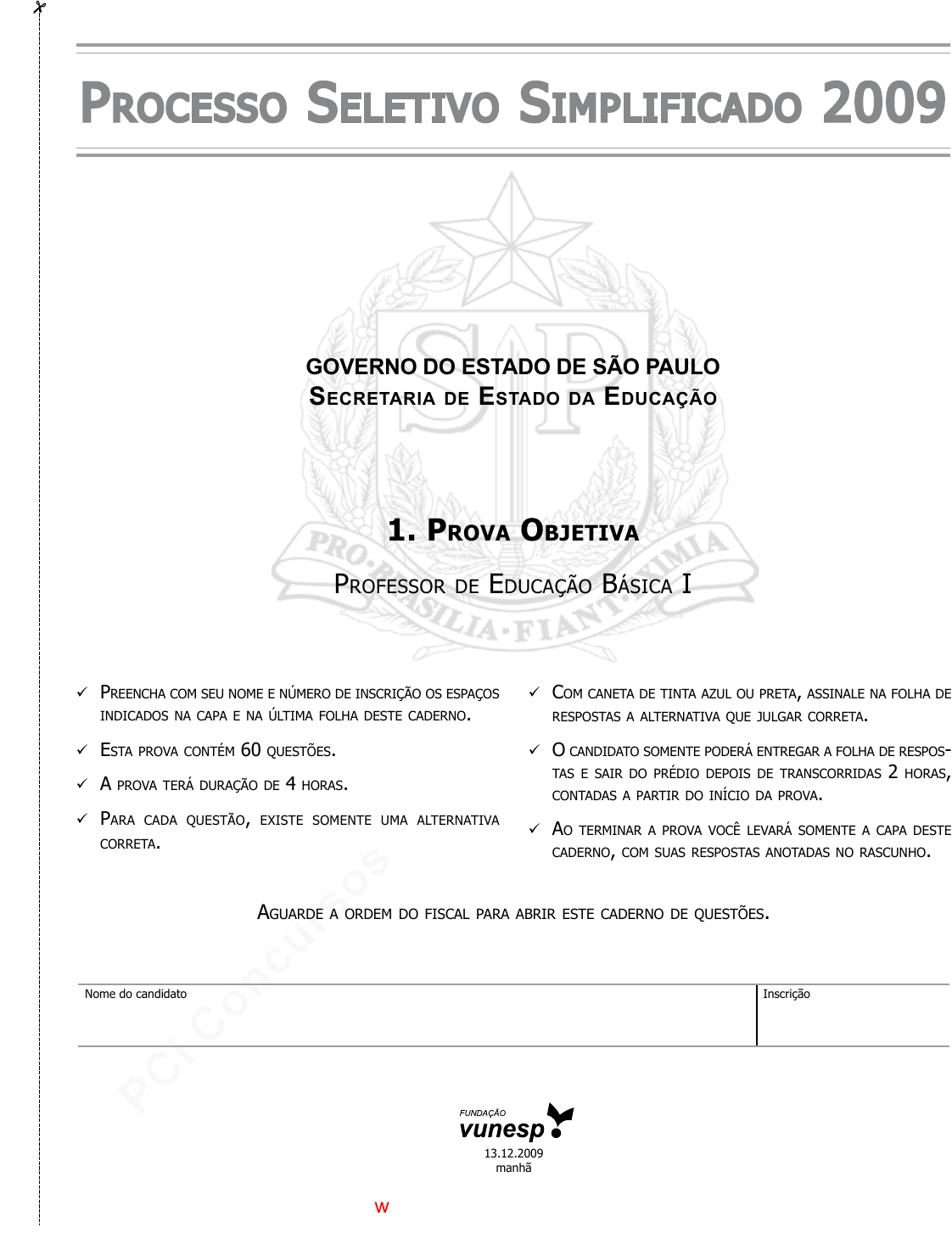 pcimarkpci MDAwMDowMDAwOjAwMDA6MDAwMDowMDAwOmZmZmY6MzZlOTpjMjU5:U3VuLCAxMiBTZXAgMjAyMSAxNjozODowMiAtMDMwMA== Processo seletivo simPlificado 2009 GOVERNO DO ESTADO DE SÃO PAULO Secretaria de eStado da educação 1. Prova objetiva Professor de educação Básica i Preencha com seu nome e número de inscrição os esPaços indicados na caPa e na última folha deste caderno. esta Prova contém 60 questões. a Prova terá duração de 4 horas. Para cada questão, existe somente uma alternativa correta. com caneta de tinta azul ou Preta, assinale na folha de resPostas a alternativa que julgar correta. o candidato somente Poderá entregar a folha de resPos- tas e sair do Prédio dePois de transcorridas 2 horas, contadas a Partir do início da Prova. ao terminar a Prova você levará somente a caPa deste caderno, com suas resPostas anotadas no rascunho. aguarde a ordem do fiscal Para aBrir este caderno de questões. Nome do candidato Inscrição 13.12.2009 manhã www.pciconcursos.com.br pcimarkpci MDAwMDowMDAwOjAwMDA6MDAwMDowMDAwOmZmZmY6MzZlOTpjMjU5:U3VuLCAxMiBTZXAgMjAyMSAxNjozODowMiAtMDMwMA== 2SEED0902/01-PEBI-13-manhã Processo seletivo simPlificado 2009 Rascunho www.pciconcursos.com.br pcimarkpci MDAwMDowMDAwOjAwMDA6MDAwMDowMDAwOmZmZmY6MzZlOTpjMjU5:U3VuLCAxMiBTZXAgMjAyMSAxNjozODowMiAtMDMwMA== 3 SEED0902/01-PEBI-13-manhã FUNDAmENTAçÃO PEDAGóGicA 01. As crianças, de uma turma com muitas dificuldades de aprendizagem, estavam desenhando. Uma das crianças queria escrever: “o revólver atira”, em seu desenho. Pede ajuda à professora que vai questionando, soletrando, apontando cada letra do alfabeto exposto na sala de aula. Nesse processo, a criança vai percebendo que já sabia escrever revólver, e resol- ve escrever “o revólver mata o ladrão”. A professora auxilia mais uma vez e quando se vira para atender outro aluno, a criança escreve sozinha: OLETAN. (Smolka. A criança na fase inicial de escrita. Adaptado) Nesta situação, é correto afirmar que (A) o resultado do ensino da professora é o aprendizado correto da criança. (B) a professora supõe que a criança é capaz e considera essa capacidade. (C) a escrita da criança não faz sentido: é ininteligível, mesmo que inserida no contexto. (D) a professora desconsidera os conhecimentos prévios do aluno. (E) o método não é adequado para ser utilizado no processo de alfabetização. 02. Considere a fala das professoras sobre o processo de alfabe- tização. Marta: Costumo trabalhar com meus alunos por meio de jogos – assim eles aprendem com prazer e conseguem me- morizar com mais facilidade. Havia um menino que comia letras: escrevia CADNO, em vez de CADERNO; PETC, em vez de PETECA. Com o bingo de palavras ele conseguiu superar essa fase. Bia: Eu já invisto todos os esforços na leitura, pois ajuda muito no processo de aprendizagem da escrita. Sempre começo com textos simples, para que as crianças consigam memorizar as sílabas e vou avançando, paulatinamente, até chegar a textos mais complexos. Márcia: Acredito que as crianças tenham que ter acesso ao mundo do texto escrito e da cultura da escrita, a partir de uma unidade com significado, como lista de nomes, lista de compras, ingredientes de uma receita. Trabalho com todas as crianças o mesmo tipo de atividade, ainda que cada uma delas faça do seu jeito. Assinale a alternativa que apresenta a sequência correta das concepções que sustentam a prática pedagógica das professoras. (A) Empirista, construtivista, construtivista. (B) Empirista, empirista, empirista. (C) Empirista, empirista, construtivista. (D) Construtivista, empirista, construtivista. (E) Construtivista, construtivista, construtivista. 03. Considere as situações. Caso 1. Uma professora do 3.º ano propõe que sua turma elabore as regras de convivência do grupo. Entre os pares, é escolhido um redator, responsável por registrar todas as opiniões, e um mediador, que teria que organizar a discussão. O grupo, além de definir as regras de convivência, também listou sanções a quem as transgredisse. Caso 2. A rotina de trabalho do 2.º ano é diariamente anota- da num canto da lousa pela professora. O dia começa com a leitura compartilhada de um texto escolhido e comentado pela professora. Em seguida, os alunos realizam trabalhos individuais de escrita. Por último, são realizadas atividades de matemática, em que a docente toma o cuidado de expor as regularidades e acompanhar o trabalho dos alunos para evitar erros. Caso 3. Uma professora propõe que seus alunos, em duplas, escolham um recorte de marca de produto alimentício, de comum acordo. Depois de escolhido e justificado o motivo da escolha, a professora pede às crianças que escrevam com letras móveis a marca e o slogan do produto escolhido. As duplas conversam, escrevem, leem, justificam sua escrita, ponderam, reconsideram, reescrevem, releem e ficam satis- feitas com o resultado obtido. Os elementos que podem contribuir para o desenvolvimento de relações de autonomia e cooperação estão contidos apenas (A) no caso 1. (B) no caso 2. (C) no caso 3. (D) nos casos 1 e 2. (E) nos casos 1 e 3. www.pciconcursos.com.br pcimarkpci MDAwMDowMDAwOjAwMDA6MDAwMDowMDAwOmZmZmY6MzZlOTpjMjU5:U3VuLCAxMiBTZXAgMjAyMSAxNjozODowMiAtMDMwMA== 4SEED0902/01-PEBI-13-manhã Utilize a situação para responder às questões de números 04 e 05. Uma professora está trabalhando com uma classe de terceira série heterogênea: 15 alunos ainda não estão alfabetizados. Os demais já começaram o ano alfabéticos: alguns já fazendo uso das convenções da escrita, outros nem tanto. 04. Ao propor uma atividade como cruzadinha para essa turma, é correto afirmar que os alunos (A) alfabéticos deverão realizar a atividade com vistas ao trabalho com as dificuldades ortográficas; aos não alfa- béticos, é possível a realização da tarefa com a utilização de banco de palavras. (B) não alfabéticos terão possibilidade de realizar essa ati- vidade, d