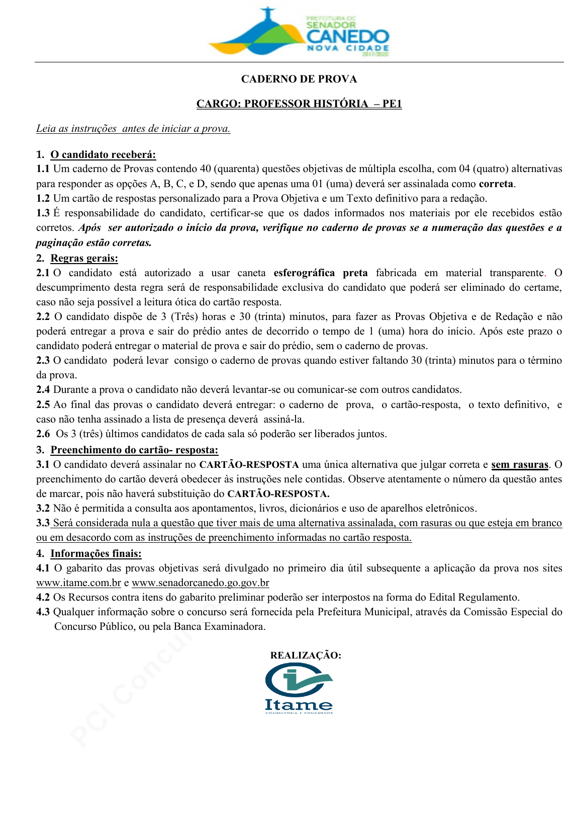pcimarkpci MDAwMDowMDAwOjAwMDA6MDAwMDowMDAwOmZmZmY6MzZlOTpjMjU5:TW9uLCAxMyBTZXAgMjAyMSAwMDowNDozNCAtMDMwMA== CADERNO DE PROVA CARGO: PROFESSOR HISTÓRIA – PE1 Leia as instruções antes de iniciar a prova. 1. O candidato receberá: 1.1 Um caderno de Provas contendo 40 (quarenta) questões objetivas de múltipla escolha, com 04 (quatro) alternativas para responder as opções A, B, C, e D, sendo que apenas uma 01 (uma) deverá ser assinalada como correta. 1.2 Um cartão de respostas personalizado para a Prova Objetiva e um Texto definitivo para a redação. 1.3 É responsabilidade do candidato, certificar-se que os dados informados nos materiais por ele recebidos estão corretos. Após ser autorizado o início da prova, verifique no caderno de provas se a numeração das questões e a paginação estão corretas. 2. Regras gerais: 2.1 O candidato está autorizado a usar caneta esferográfica preta fabricada em material transparente. O descumprimento desta regra será de responsabilidade exclusiva do candidato que poderá ser eliminado do certame, caso não seja possível a leitura ótica do cartão resposta. 2.2 O candidato dispõe de 3 (Três) horas e 30 (trinta) minutos, para fazer as Provas Objetiva e de Redação e não poderá entregar a prova e sair do prédio antes de decorrido o tempo de 1 (uma) hora do início. Após este prazo o candidato poderá entregar o material de prova e sair do prédio, sem o caderno de provas. 2.3 O candidato poderá levar consigo o caderno de provas quando estiver faltando 30 (trinta) minutos para o término da prova. 2.4 Durante a prova o candidato não deverá levantar-se ou comunicar-se com outros candidatos. 2.5 Ao final das provas o candidato deverá entregar: o caderno de prova, o cartão-resposta, o texto definitivo, e caso não tenha assinado a lista de presença deverá assiná-la. 2.6 Os 3 (três) últimos candidatos de cada sala só poderão ser liberados juntos. 3. Preenchimento do cartão- resposta: 3.1 O candidato deverá assinalar no CARTÃO-RESPOSTA uma única alternativa que julgar correta e sem rasuras. O preenchimento do cartão deverá obedecer às instruções nele contidas. Observe atentamente o número da questão antes de marcar, pois não haverá substituição do CARTÃO-RESPOSTA. 3.2 Não é permitida a consulta aos apontamentos, livros, dicionários e uso de aparelhos eletrônicos. 3.3 Será considerada nula a questão que tiver mais de uma alternativa assinalada, com rasuras ou que esteja em branco ou em desacordo com as instruções de preenchimento informadas no cartão resposta. 4. Informações finais: 4.1 O gabarito das provas objetivas será divulgado no primeiro dia útil subsequente a aplicação da prova nos sites www.itame.com.br e www.senadorcanedo.go.gov.br 4.2 Os Recursos contra itens do gabarito preliminar poderão ser interpostos na forma do Edital Regulamento. 4.3 Qualquer informação sobre o concurso será fornecida pela Prefeitura Municipal, através da Comissão Especial do Concurso Público, ou pela Banca Examinadora. REALIZAÇÃO: pcimarkpci MDAwMDowMDAwOjAwMDA6MDAwMDowMDAwOmZmZmY6MzZlOTpjMjU5:TW9uLCAxMyBTZXAgMjAyMSAwMDowNDozNCAtMDMwMA== Prefeitura Municipal de Senador Canedo/GO. Professor de História – PE 1 1 Leia o texto para responder as questões 01, 02, 03, 04, 05 e 06. O maniqueísmo que nos alimenta e o amor que nos falta Sérgio Pardellas Acordamos e logo somos tragados pelo maniqueísmo. A política nacional está empanturrada dele — um mal que não escolhe governos, muito menos ideologias. Maniqueu, filósofo do século III, cuja doutrina afirma existir o dualismo entre dois princípios opostos — o bem e o mal, o certo e o errado —, transbordaria de orgulho dos súditos que amealhou. A lógica binária é capaz de corromper até o “fundo insubornável do ser” de que dizia Ortega y Gasset. Não raro, a queda-de- braço retórica gira em torno de “quem está do lado correto da história”. Não demora e alguém avoca para si o monopólio da virtude. Logo, o oponente é a encarnação do que há de mais desgraçado no mundo. Muitas vezes, a polarização faz lembrar um museu de grandes novidades. O tempo não para e o argumento, outrora música para os ouvidos de um, passa a embalar a valsa do outro. Nem o dinamarquês Soren Kierkegaard ousaria produzir uma catástrofe tão perfeita. Como o exemplo vem de cima e a sociedade segue no mesmo compasso da política, aquilo a que assistimos são relações pessoais descompassadas. Não é preciso recorrer a exemplos do cotidiano. Eles pululam, semana a semana, e encontram-se debaixo do nosso nariz. O aroma é desagradável. Falta empatia, colocar-se no lugar do outro, entender e tocar a alma alheia. Em suma, a política está colérica e os relacionamentos nas redes sociais ou mesmo fora delas são o seu retrato mais bem- acabado. Um triste retrato de chorar lágrimas de esguicho. No ambiente amistoso ou não das mesas de bar não falávamos o que regurgitamos nesses ambientes. Conforme questionava Monteiro Lobato em A luz do baile, “como (o que mudou), se era a mesma gente?”. Se é certo que opinar sobre tudo virou um fetiche dos tempos modernos, também é lícito afirmar que falta escrúpulo de delicadeza no lançamento de pareceres definitivos, quando não rasos e injuriosos, sobre o outro. Aliás, todos parecem ter prontos na cartola juízos sobre os mais diversos temas na hora de pressupor prevalência sobre terceiros. É a tal superioridade moral erigida tanto pelo Fla quanto pelo Flu. Nessa disputa infértil sobre quem paira acima de quem, a língua se transformou no açoite do que não somos, porque não é possível que nascemos para chicotearmos uns aos outros sem pensarmos em que posturas tão cáusticas irão degenerar. É necessário descer ao inferno do autoconhecimento e desvelar a própria alma, de que falava Eric Voegelin. É preciso oferecer ao outro o que gostaríamos de receber. Mas nem as crianças, nem os id