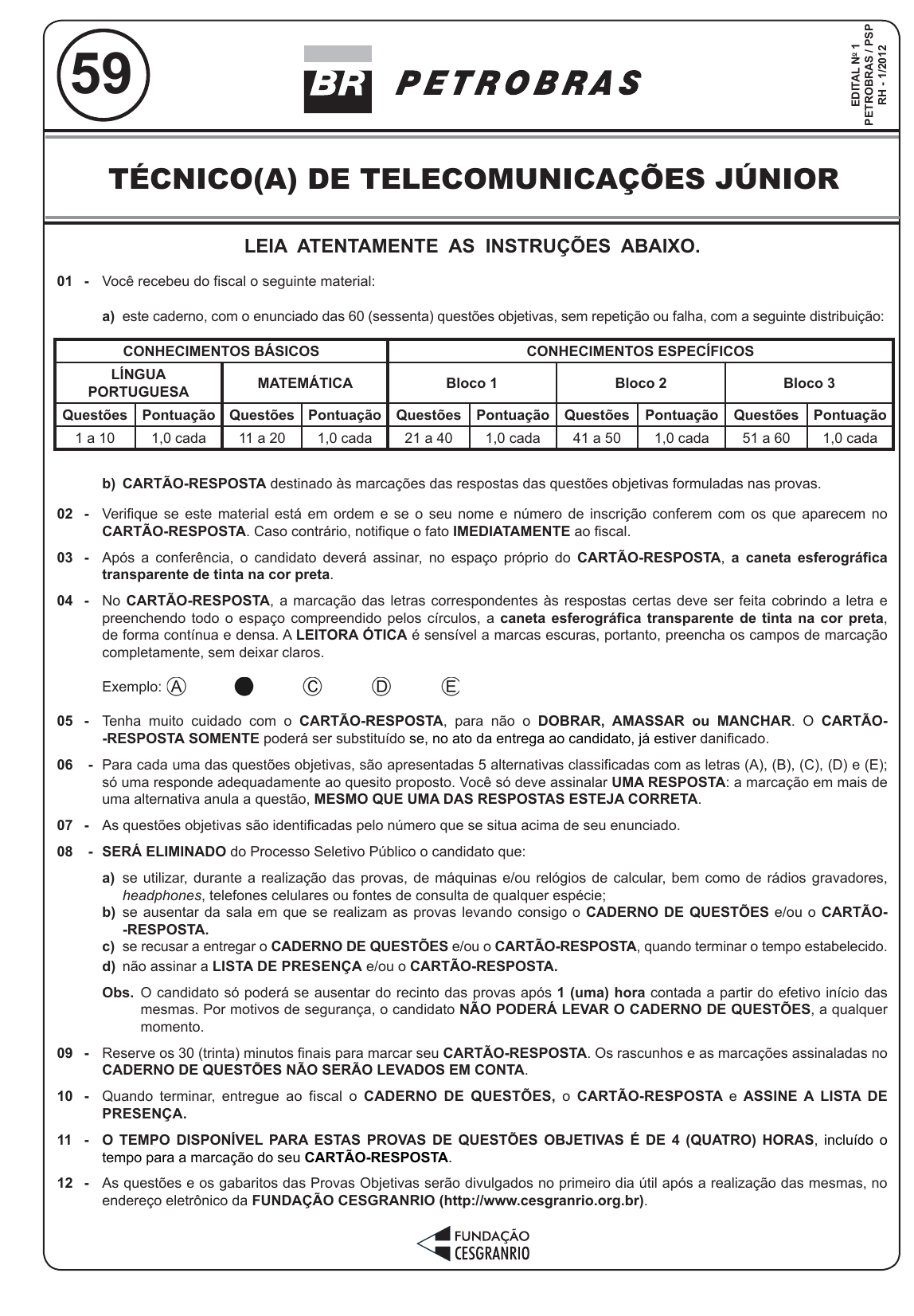 pcimarkpci MDAwMDowMDAwOjAwMDA6MDAwMDowMDAwOmZmZmY6MzZlOTpjMjU5:U2F0LCAxMSBTZXAgMjAyMSAwNjo0NzoxNSAtMDMwMA== TÉCNICO(A) DE TELECOMUNICAÇÕES JÚNIOR1 LEIA ATENTAMENTE AS INSTRUÇÕES ABAIXO. 01 - Você recebeu do fiscal o seguinte material: a) este caderno, com o enunciado das 60 (sessenta) questões objetivas, sem repetição ou falha, com a seguinte distribuição: b) CARTÃO-RESPOSTA destinado às marcações das respostas das questões objetivas formuladas nas provas. 02 - Verifique se este material está em ordem e se o seu nome e número de inscrição conferem com os que aparecem no CARTÃO-RESPOSTA. Caso contrário, notifique o fato IMEDIATAMENTE ao fiscal. 03 - Após a conferência, o candidato deverá assinar, no espaço próprio do CARTÃO-RESPOSTA, a caneta esferográfica transparente de tinta na cor preta. 04 - No CARTÃO-RESPOSTA, a marcação das letras correspondentes às respostas certas deve ser feita cobrindo a letra e preenchendo todo o espaço compreendido pelos círculos, a caneta esferográfica transparente de tinta na cor preta, de forma contínua e densa. A LEITORA ÓTICA é sensível a marcas escuras, portanto, preencha os campos de marcação completamente, sem deixar claros. Exemplo: 05 - Tenha muito cuidado com o CARTÃO-RESPOSTA, para não o DOBRAR, AMASSAR ou MANCHAR. O CARTÃO- -RESPOSTA SOMENTE poderá ser substituído se, no ato da entrega ao candidato, já estiver danificado. 06 - Para cada uma das questões objetivas, são apresentadas 5 alternativas classificadas com as letras (A), (B), (C), (D) e (E); só uma responde adequadamente ao quesito proposto. Você só deve assinalar UMA RESPOSTA: a marcação em mais de uma alternativa anula a questão, MESMO QUE UMA DAS RESPOSTAS ESTEJA CORRETA. 07 - As questões objetivas são identificadas pelo número que se situa acima de seu enunciado. 08 - SERÁ ELIMINADO do Processo Seletivo Público o candidato que: a) se utilizar, durante a realização das provas, de máquinas e/ou relógios de calcular, bem como de rádios gravadores, headphones, telefones celulares ou fontes de consulta de qualquer espécie; b) se ausentar da sala em que se realizam as provas levando consigo o CADERNO DE QUESTÕES e/ou o CARTÃO- -RESPOSTA. c) se recusar a entregar o CADERNO DE QUESTÕES e/ou o CARTÃO-RESPOSTA, quando terminar o tempo estabelecido. d) não assinar a LISTA DE PRESENÇA e/ou o CARTÃO-RESPOSTA. Obs. O candidato só poderá se ausentar do recinto das provas após 1 (uma) hora contada a partir do efetivo início das mesmas. Por motivos de segurança, o candidato NÃO PODERÁ LEVAR O CADERNO DE QUESTÕES, a qualquer momento. 09 - Reserve os 30 (trinta) minutos finais para marcar seu CARTÃO-RESPOSTA. Os rascunhos e as marcações assinaladas no CADERNO DE QUESTÕES NÃO SERÃO LEVADOS EM CONTA. 10 - Quando terminar, entregue ao fiscal o CADERNO DE QUESTÕES, o CARTÃO-RESPOSTA e ASSINE A LISTA DE PRESENÇA. 11 - O TEMPO DISPONÍVEL PARA ESTAS PROVAS DE QUESTÕES OBJETIVAS É DE 4 (QUATRO) HORAS, incluído o tempo para a marcação do seu CARTÃO-RESPOSTA. 12 - As questões e os gabaritos das Provas Objetivas serão divulgados no primeiro dia útil após a realização das mesmas, no endereço eletrônico da FUNDAÇÃO CESGRANRIO (http://www.cesgranrio.org.br). 59 TÉCNICO(A) DE TELECOMUNICAÇÕES JÚNIOR CONHECIMENTOS BÁSICOS CONHECIMENTOS ESPECÍFICOS LÍNGUA PORTUGUESA MATEMÁTICA Bloco 1 Bloco 2 Bloco 3 Questões Pontuação Questões Pontuação Questões Pontuação Questões Pontuação Questões Pontuação 1 a 10 1,0 cada 11 a 20 1,0 cada 21 a 40 1,0 cada 41 a 50 1,0 cada 51 a 60 1,0 cada ED IT A L N o 1 PE TR O B R A S / P SP R H - 1/ 20 12 pcimarkpci MDAwMDowMDAwOjAwMDA6MDAwMDowMDAwOmZmZmY6MzZlOTpjMjU5:U2F0LCAxMSBTZXAgMjAyMSAwNjo0NzoxNSAtMDMwMA== TÉCNICO(A) DE TELECOMUNICAÇÕES JÚNIOR 2 CONHECIMENTOS BÁSICOS LÍNGUA PORTUGUESA O futuro segundo os brasileiros Em 2050, o homem já vai ter chegado a Marte, e comprar pacotes turísticos para o espaço será corri- queiro. Em casa e no trabalho, vamos interagir regu- larmente com máquinas e robôs, que também deve- rão tomar o lugar das pessoas em algumas funções de atendimento ao público, e, nas ruas, os carros te- rão um sistema de direção automatizada. Apesar dis- so, os implantes corporais de dispositivos eletrônicos não serão comuns, assim como o uso de membros e outros órgãos cibernéticos. Na opinião dos brasilei- ros, este é o futuro que nos aguarda, revela pesquisa da empresa de consultoria OThink, que ouviu cerca de mil pessoas em todo o país entre setembro e ou- tubro do ano passado. [...] De acordo com o levantamento, para quase me- tade das pessoas ouvidas (47%) um homem terá pisado em Marte até 2050. Ainda nesse ano, 49% acham que será normal comprar pacotes turísticos para o espaço. Em ambos os casos, os homens es- tão um pouco mais confiantes do que as mulheres, tendência que se repete quando levadas em conta a escolaridade e a classe social. As respostas demonstram que a maioria da população tem acompanhado com interesse esses temas – avalia Wagner Pereira, gerente de inteli- gência Estratégica da OThink. – E isso também é um sinal de que aumentou o acesso a esse tipo de informação pelos brasileiros. [...] – Nossa vida está cada vez mais automatizada e isso ajuda o brasileiro a vislumbrar que as coisas vão manter esse ritmo de inovação nos próximos anos – comenta Pereira. – Hoje, o Brasil tem quase 80 milhões de internautas e a revolução que a internet produziu no nosso modo de viver, como esse acesso maior à informação, contribui muito para esta visão otimista do futuro. Já a resistência do brasileiro quando o tema é modificar o corpo humano é natural, analisa o exe- cutivo. De acordo com o levantamento, apenas 28% dos ouvidos creem que a evolução da tecnologia vai levar ao desenvolvimento e uso de partes do corpo artificiais que funcionarão melhor do que as naturais, enquan