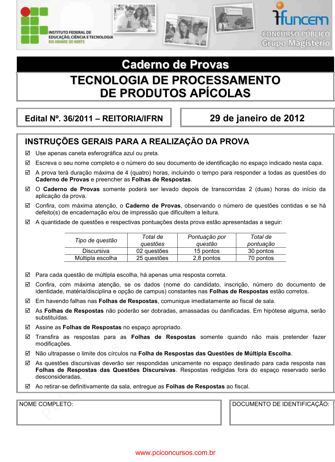 pcimarkpci MDAwMDowMDAwOjAwMDA6MDAwMDowMDAwOmZmZmY6MzZlOTpjMjU5:U2F0LCAxMSBTZXAgMjAyMSAyMzoxNzowNyAtMDMwMA== CCaaddeerrnnoo ddee PPrroovvaass TTEECCNNOOLLOOGGIIAA DDEE PPRROOCCEESSSSAAMMEENNTTOO DDEE PPRROODDUUTTOOSS AAPPÍÍCCOOLLAASS Edital Nº. 36/2011 – REITORIA/IFRN 29 de janeiro de 2012 INSTRUÇÕES GERAIS PARA A REALIZAÇÃO DA PROVA Use apenas caneta esferográfica azul ou preta. Escreva o seu nome completo e o número do seu documento de identificação no espaço indicado nesta capa. A prova terá duração máxima de 4 (quatro) horas, incluindo o tempo para responder a todas as questões do Caderno de Provas e preencher as Folhas de Respostas. O Caderno de Provas somente poderá ser levado depois de transcorridas 2 (duas) horas do início da aplicação da prova. Confira, com máxima atenção, o Caderno de Provas, observando o número de questões contidas e se há defeito(s) de encadernação e/ou de impressão que dificultem a leitura. A quantidade de questões e respectivas pontuações desta prova estão apresentadas a seguir: Tipo de questão Total de questões Pontuação por questão Total de pontuação Discursiva 02 questões 15 pontos 30 pontos Múltipla escolha 25 questões 2,8 pontos 70 pontos Para cada questão de múltipla escolha, há apenas uma resposta correta. Confira, com máxima atenção, se os dados (nome do candidato, inscrição, número do documento de identidade, matéria/disciplina e opção de campus) constantes nas Folhas de Respostas estão corretos. Em havendo falhas nas Folhas de Respostas, comunique imediatamente ao fiscal de sala. As Folhas de Respostas não poderão ser dobradas, amassadas ou danificadas. Em hipótese alguma, serão substituídas. Assine as Folhas de Respostas no espaço apropriado. Transfira as respostas para as Folhas de Respostas somente quando não mais pretender fazer modificações. Não ultrapasse o limite dos círculos na Folha de Respostas das Questões de Múltipla Escolha. As questões discursivas deverão ser respondidas unicamente no espaço destinado para cada resposta nas Folhas de Respostas das Questões Discursivas. Respostas redigidas fora do espaço reservado serão desconsideradas. Ao retirar-se definitivamente da sala, entregue as Folhas de Respostas ao fiscal. NOME COMPLETO: DOCUMENTO DE IDENTIFICAÇÃO: www.pciconcursos.com.br pcimarkpci MDAwMDowMDAwOjAwMDA6MDAwMDowMDAwOmZmZmY6MzZlOTpjMjU5:U2F0LCAxMSBTZXAgMjAyMSAyMzoxNzowNyAtMDMwMA== www.pciconcursos.com.br pcimarkpci MDAwMDowMDAwOjAwMDA6MDAwMDowMDAwOmZmZmY6MzZlOTpjMjU5:U2F0LCAxMSBTZXAgMjAyMSAyMzoxNzowNyAtMDMwMA== CONCURSO PÚBLICO – GRUPO MAGISTÉRIO EDITAL Nº. 36/2011-REITORIA/IFRN IFRN – Concurso Público – Grupo Magistério –Tecnologia de Processamento de Produtos Apícolas 1 QUESTÕES DISCURSIVAS ESTAS QUESTÕES DEVERÃO SER RESPONDIDAS NAS FOLHAS DE RESPOSTAS DAS QUESTÕES DISCURSIVAS. Questão 1 Por possuir características especiais de flora e clima, o Brasil se tornou um dos países que mais produz e exporta mel para o mundo. Para tanto, vem adotando diversas tecnologias que visam melhorar a qualidade e aceitação desse mel, desde a colheita dos favos até o seu envase e comercialização. Assim, descreva as etapas do fluxograma do mel, enfatizando seus objetivos e sua importância para a qualidade final do produto. www.pciconcursos.com.br pcimarkpci MDAwMDowMDAwOjAwMDA6MDAwMDowMDAwOmZmZmY6MzZlOTpjMjU5:U2F0LCAxMSBTZXAgMjAyMSAyMzoxNzowNyAtMDMwMA== CONCURSO PÚBLICO – GRUPO MAGISTÉRIO EDITAL Nº. 36/2011-REITORIA/IFRN IFRN – Concurso Público Grupo Magistério – Tecnologia de Processamento de Produtos Apícolas 2 Questão 2 A geleia real, além de ser o alimento principal da abelha rainha, possui alto valor nutricional e terapêutico para o homem. Sua produção se baseia no princípio da motivação das abelhas para criar uma nova rainha. Cite os métodos que podem ser utilizados para produzir a geleia real e descreva as etapas de um desses métodos, destacando suas vantagens e desvantagens. www.pciconcursos.com.br pcimarkpci MDAwMDowMDAwOjAwMDA6MDAwMDowMDAwOmZmZmY6MzZlOTpjMjU5:U2F0LCAxMSBTZXAgMjAyMSAyMzoxNzowNyAtMDMwMA== CONCURSO PÚBLICO – GRUPO MAGISTÉRIO EDITAL Nº. 36/2011-REITORIA/IFRN IFRN – Concurso Público – Grupo Magistério –Tecnologia de Processamento de Produtos Apícolas 3 QUESTÕES DE MÚLTIPLA ESCOLHA AS RESPOSTAS DESTAS QUESTÕES DEVERÃO SER ASSINALADAS NA FOLHA DE RESPOSTAS DAS QUESTÕES DE MÚLTIPLA ESCOLHA. 01. Considere as seguintes afirmações relacionadas à biologia das abelhas: I Uma colônia é formada por abelhas operárias, abelha rainha e zangão. As operárias e a rainha nascem de ovos fecundados e o zangão nasce de ovos não fecundados II O zangão é maior que a abelha operária, não trabalha, vive em média 80 dias e morre logo após fecundar uma abelha. III As abelhas operárias desempenham diferentes funções, de acordo com o desenvolvimento glandular, a idade e a necessidade da colmeia. IV A função da rainha é realizar a postura dos ovos, manter a ordem social da colmeia e alimentar as larvas em desenvolvimento. V A rainha é responsável pelo equilíbrio populacional da colmeia e é reconhecida pelas operárias e zangões através da emissão de um feromônio específico. A opção em que todas as afirmações estão corretas é: A) I, II, IV e V. B) II, III e IV. C) I, II, III e V. D) I, III, IV e V. 02. Sobre a anatomia das abelhas, é INCORRETO afirmar que: A) Na cabeça das abelhas, estão presentes três olhos simples, localizados na parte frontal, que servem para enxergar longe e com luz para visitação das flores; e dois olhos compostos, um de cada lado, que servem para enxergar dentro da flor, no escuro e dentro da colmeia. B) O corpo de uma abelha adulta é dividido em cabeça, tórax e abdômen, sendo a cabeça o órgão sensorial da abelha, onde se encontram duas antenas, três olhos simples e dois olhos compostos. C) O tórax é a parte do corpo responsável 