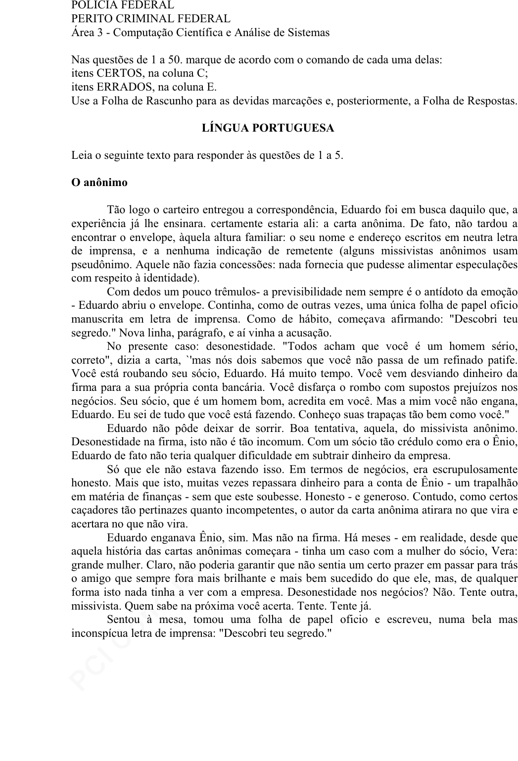 pcimarkpci MDAwMDowMDAwOjAwMDA6MDAwMDowMDAwOmZmZmY6MzZlOTpjMjU5:U3VuLCAxMiBTZXAgMjAyMSAwNTozMjozNyAtMDMwMA== POLICIA FEDERAL PERITO CRIMINAL FEDERAL Área 3 - Computação Científica e Análise de Sistemas Nas questões de 1 a 50. marque de acordo com o comando de cada uma delas: itens CERTOS, na coluna C; itens ERRADOS, na coluna E. Use a Folha de Rascunho para as devidas marcações e, posteriormente, a Folha de Respostas. LÍNGUA PORTUGUESA Leia o seguinte texto para responder às questões de 1 a 5. O anônimo Tão logo o carteiro entregou a correspondência, Eduardo foi em busca daquilo que, a experiência já lhe ensinara. certamente estaria ali: a carta anônima. De fato, não tardou a encontrar o envelope, àquela altura familiar: o seu nome e endereço escritos em neutra letra de imprensa, e a nenhuma indicação de remetente (alguns missivistas anônimos usam pseudônimo. Aquele não fazia concessões: nada fornecia que pudesse alimentar especulações com respeito à identidade). Com dedos um pouco trêmulos- a previsibilidade nem sempre é o antídoto da emoção - Eduardo abriu o envelope. Continha, como de outras vezes, uma única folha de papel oficio manuscrita em letra de imprensa. Como de hábito, começava afirmando: "Descobri teu segredo." Nova linha, parágrafo, e aí vinha a acusação. No presente caso: desonestidade. "Todos acham que você é um homem sério, correto", dizia a carta, `'mas nós dois sabemos que você não passa de um refinado patife. Você está roubando seu sócio, Eduardo. Há muito tempo. Você vem desviando dinheiro da firma para a sua própria conta bancária. Você disfarça o rombo com supostos prejuízos nos negócios. Seu sócio, que é um homem bom, acredita em você. Mas a mim você não engana, Eduardo. Eu sei de tudo que você está fazendo. Conheço suas trapaças tão bem como você." Eduardo não pôde deixar de sorrir. Boa tentativa, aquela, do missivista anônimo. Desonestidade na firma, isto não é tão incomum. Com um sócio tão crédulo como era o Ênio, Eduardo de fato não teria qualquer dificuldade em subtrair dinheiro da empresa. Só que ele não estava fazendo isso. Em termos de negócios, era escrupulosamente honesto. Mais que isto, muitas vezes repassara dinheiro para a conta de Ênio - um trapalhão em matéria de finanças - sem que este soubesse. Honesto - e generoso. Contudo, como certos caçadores tão pertinazes quanto incompetentes, o autor da carta anônima atirara no que vira e acertara no que não vira. Eduardo enganava Ênio, sim. Mas não na firma. Há meses - em realidade, desde que aquela história das cartas anônimas começara - tinha um caso com a mulher do sócio, Vera: grande mulher. Claro, não poderia garantir que não sentia um certo prazer em passar para trás o amigo que sempre fora mais brilhante e mais bem sucedido do que ele, mas, de qualquer forma isto nada tinha a ver com a empresa. Desonestidade nos negócios? Não. Tente outra, missivista. Quem sabe na próxima você acerta. Tente. Tente já. Sentou à mesa, tomou uma folha de papel oficio e escreveu, numa bela mas inconspícua letra de imprensa: "Descobri teu segredo." pcimarkpci MDAwMDowMDAwOjAwMDA6MDAwMDowMDAwOmZmZmY6MzZlOTpjMjU5:U3VuLCAxMiBTZXAgMjAyMSAwNTozMjozNyAtMDMwMA== QUE.STÃO 1 Para a leitura compreensiva se efetivar, um dos passos essenciais é o entendimento do vocabulário utilizado. Julgue os itens a seguir, considerando o sentido das palavras do texto. 1) O vocábulo "concessões" (L.5) está utilizado denotativamente, com o sentido de privilégios; da mesma forma, "especulações" (L.5) traz o sentido de negociações. 2) Contextualmente, "antídoto" (L.7) significa droga, veneno. 3) As palavras "desonestidade" (L.11) e "pertinazes" (L.23) estão empregadas como antônimos de probidade e de volúveis, respectivamente. 4) O termo "crédulo" (L.18) apresenta conotações de religiosidade; significando crente, devoto. 5) A palavra "inconspícua'' (L.32) tem o significado de ilegível, indecifrável. QUESTÃO 2 Julgue os itens abaixo. evidenciando a compreensão do texto. 1) O título "O anônimo'' é, frente ao conteúdo do texto. um emprego irônico dessa palavra. 2) O narrador faz suposições acerca da identidade do remetente ao registrar. como texto da carta a seguinte idéia: "nós dois sabemos que você não passa de um refinado patife" (L.11-12). 3) Pelo foco do recebedor da missiva, são comuns casos de desonestidade profissional. mas tal acusação não se aplica a ele. que se julga um sujeito, absolutamente, honesto e generoso. 4) No sexto parágrafo. fica explícito que Eduardo sentia um complexo de inferioridade profissional frente a Ênio. 5) Infere-se do texto que o remetente era o próprio destinatário das cartas. QUESTÃO 3 Com referencia à tipologia textual e ao nível de linguagem do texto, julgue os itens seguintes. 1) A história acerca das cartas anônimas, conforme contada pelo autor, apresentando-se na forma de uma narrativa curta, densa, exemplifica o que é conhecido por conto. 2) O trecho entre aspas situado nas linhas de 11 a 14 possui várias marcas de oralidade: registros típicos da língua falada transpostos para a língua escrita. 3) O texto apresenta algumas expressões típicas da linguagem vulgar, como, entre outras, ' patife' , ' trapaças' . "trapalhão ". 4) Os trechos registrados entre aspas no texto estão dispostos na forma de discurso indireto. 5) As passagens descritivas são predominantes nos quatro últimos parágrafos. pcimarkpci MDAwMDowMDAwOjAwMDA6MDAwMDowMDAwOmZmZmY6MzZlOTpjMjU5:U3VuLCAxMiBTZXAgMjAyMSAwNTozMjozNyAtMDMwMA== QUESTÃO 4 Moacyr Scliar, consagrado ficcionista brasileiro, tem um estilo de escrita em que a preocupação com a escolha vocabular e com o ritmo da frase não turvam o potencial comunicativo do texto. Com base nesse aspecto, julgue os itens a seguir. 1) Em "Eduardo foi em busca daquilo" (L.1 ), o termo sublinhado refere-se ao que "a experiência já lh