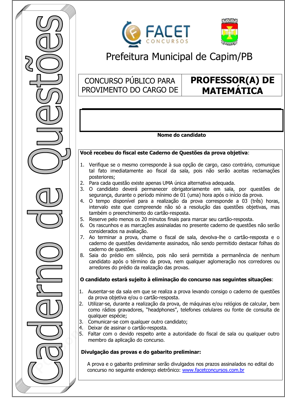 pcimarkpci MDAwMDowMDAwOjAwMDA6MDAwMDowMDAwOmZmZmY6MzZlOTpjMjU5:U3VuLCAxMiBTZXAgMjAyMSAxMjoyNTowMyAtMDMwMA== Prefeitura Municipal de Capim/PB CONCURSO PÚBLICO PARA PROVIMENTO DO CARGO DE PROFESSOR(A) DE MATEMÁTICA Nome do candidato Você recebeu do fiscal este Caderno de Questões da prova objetiva: 1. Verifique se o mesmo corresponde à sua opção de cargo, caso contrário, comunique tal fato imediatamente ao fiscal da sala, pois não serão aceitas reclamações posteriores; 2. Para cada questão existe apenas UMA única alternativa adequada. 3. O candidato deverá permanecer obrigatoriamente em sala, por questões de segurança, durante o período mínimo de 01 (uma) hora após o início da prova. 4. O tempo disponível para a realização da prova corresponde a 03 (três) horas, intervalo este que compreende não só a resolução das questões objetivas, mas também o preenchimento do cartão-resposta. 5. Reserve pelo menos os 20 minutos finais para marcar seu cartão-resposta. 6. Os rascunhos e as marcações assinaladas no presente caderno de questões não serão considerados na avaliação. 7. Ao terminar a prova, chame o fiscal de sala, devolva-lhe o cartão-resposta e o caderno de questões devidamente assinados, não sendo permitido destacar folhas do caderno de questões. 8. Saia do prédio em silêncio, pois não será permitida a permanência de nenhum candidato após o término da prova, nem qualquer aglomeração nos corredores ou arredores do prédio da realização das provas. O candidato estará sujeito à eliminação do concurso nas seguintes situações: 1. Ausentar-se da sala em que se realiza a prova levando consigo o caderno de questões da prova objetiva e/ou o cartão-resposta. 2. Utilizar-se, durante a realização da prova, de máquinas e/ou relógios de calcular, bem como rádios gravadores, “headphones”, telefones celulares ou fonte de consulta de qualquer espécie; 3. Comunicar-se com qualquer outro candidato; 4. Deixar de assinar o cartão-resposta. 5. Faltar com o devido respeito ante a autoridade do fiscal de sala ou qualquer outro membro da aplicação do concurso. Divulgação das provas e do gabarito preliminar: A prova e o gabarito preliminar serão divulgados nos prazos assinalados no edital do concurso no seguinte endereço eletrônico: www.facetconcursos.com.br pcimarkpci MDAwMDowMDAwOjAwMDA6MDAwMDowMDAwOmZmZmY6MzZlOTpjMjU5:U3VuLCAxMiBTZXAgMjAyMSAxMjoyNTowMyAtMDMwMA== pcimarkpci MDAwMDowMDAwOjAwMDA6MDAwMDowMDAwOmZmZmY6MzZlOTpjMjU5:U3VuLCAxMiBTZXAgMjAyMSAxMjoyNTowMyAtMDMwMA== 2 Prefeitura Municipal de Capim CONCURSO PÚBLICO PARA PROVIMENTO DO CARGO DE PROF. DE MATEMÁTICA DIDÁTICA 1. De acordo com Libâneo, a formação profissional é um processo pedagógico proposital e organizado no qual os professores realizam uma preparação teórica e científica para orientar o processo de ensino com competência. Essa formação é composta por duas dimensões: a Teórico-científica e Técnico-prática. b Prática e Científica. c Técnico-pedagógica e Teórico-científica. d Pedagógica e Cientifica. e Técnico-pedagógica e Técnico-prática. 2. Sobre didática e a formação profissional do professor, marque V para verdadeiro e F para falso: (__) A didática auxilia a parte pedagógica e suas relações dentro do processo de ensino e aprendizagem. (__) O professor precisa assumir um papel capaz de vincular a didática com a realidade social, o conhecimento do aluno e todo o universo cultural existente. (__) O objetivo da didática é promover, dentro do processo de ensino, um meio dos alunos adquirirem conhecimento, capacidades e atitudes, sendo mediados pelo professor. (__) A didática orienta as ações do professor, partindo das situações de vivência concreta onde será realizado o processo de ensino. A sequência correta encontrada é: a V, V, F, V. b F, V, V, V. c V, F, V, F. d F, F, F, V. e V, V, V, V. 3. Leia as afirmativas a seguir: I. Aprendizagem casual: é a aprendizagem espontânea que nasce naturalmente nas relações com o ambiente e as pessoas. Surge a partir da convivência social. II. Qualquer tarefa executada no ambiente social em que o indivíduo está inserido pode levar a uma aprendizagem. III. A aprendizagem organizada aparece com uma finalidade específica. É aquela em que são determinados os conhecimentos, habilidades e até mesmo as regras sociais. Estão corretas as afirmativas: a I e II apenas. b I e III apenas. c I, II e III. d III apenas. e II apenas. 4. Correspondem às características da aprendizagem escolar, EXCETO: a O desenvolvimento dos conhecimentos resulta do processo de reflexão proporcionada pelas ações mentais que caracterizam o pensamento, juntamente com a percepção prático-sensorial. b A aprendizagem escolar é influenciada pelos fatores afetivos e sociais que podem motivar (ou não) o aluno. c A organização lógica e psicológica depende das ações mentais em que o aluno forma diante das matérias de ensino. d A aprendizagem escolar não necessariamente precisa ser planejada, podendo ser casual ou espontânea. e A organização psicológica diz respeito ao desenvolvimento físico e mental. 5. Partindo das concepções sobre tendências pedagógicas, analise as afirmativas abaixo: I. Na tendência pedagógica crítico-social dos conteúdos o professor é visto como o mediador do processo ensino-aprendizagem. II. A tendência pedagógica tecnicista é articulada ao sistema produtivo com o objetivo de aperfeiçoamento do sistema capitalista, a qual provê a formação de indivíduos para o mercado de trabalho de acordo com as exigências da sociedade industrial e tecnológica. III. Para a concepção progressivista libertária, o importante não é a transmissão de conteúdos específicos, mas a nova forma de relação com a experiência vivida. IV. Para a concepção liberal renovada progressivista, o processo de aquisição do saber é mais importante do que o saber propriamente dito