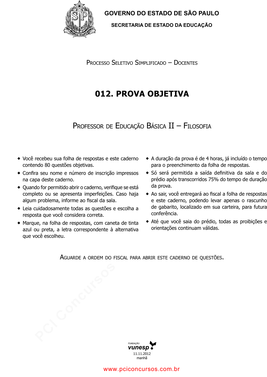 pcimarkpci MDAwMDowMDAwOjAwMDA6MDAwMDowMDAwOmZmZmY6MzZlOTpjMjU5:U3VuLCAxMiBTZXAgMjAyMSAxNjo1MjozNyAtMDMwMA== GOVERNO DO ESTADO DE SÃO PAULO SECRETARIA DE ESTADO DA EDUCAÇÃO Processo seletivo simPlificado – docentes 012. Prova objetiva Professor de educação Básica ii – filosofia � Você recebeu sua folha de respostas e este caderno contendo 80 questões objetivas. � Conira seu nome e número de inscrição impressos na capa deste caderno. � Quando for permitido abrir o caderno, veriique se está completo ou se apresenta imperfeições. Caso haja algum problema, informe ao iscal da sala. � Leia cuidadosamente todas as questões e escolha a resposta que você considera correta. � Marque, na folha de respostas, com caneta de tinta azul ou preta, a letra correspondente à alternativa que você escolheu. � A duração da prova é de 4 horas, já incluído o tempo para o preenchimento da folha de respostas. � Só será permitida a saída deinitiva da sala e do prédio após transcorridos 75% do tempo de duração da prova. � Ao sair, você entregará ao iscal a folha de respostas e este caderno, podendo levar apenas o rascunho de gabarito, localizado em sua carteira, para futura conferência. � Até que você saia do prédio, todas as proibições e orientações continuam válidas. aguarde a ordem do fiscal Para aBrir este caderno de questões. 11.11.2012 manhã www.pciconcursos.com.br pcimarkpci MDAwMDowMDAwOjAwMDA6MDAwMDowMDAwOmZmZmY6MzZlOTpjMjU5:U3VuLCAxMiBTZXAgMjAyMSAxNjo1MjozNyAtMDMwMA== www.pciconcursos.com.br pcimarkpci MDAwMDowMDAwOjAwMDA6MDAwMDowMDAwOmZmZmY6MzZlOTpjMjU5:U3VuLCAxMiBTZXAgMjAyMSAxNjo1MjozNyAtMDMwMA== 3 SEED1201/012-PEB-II-Filsofia-manhã 04. Em relação à escola segundo os paradigmas do consenso e do conflito, analise as seguintes afirmações. I. Na escola, existem e coexistem duas estruturas: formal e informal. Um exemplo da estrutura formal encontra- -se em situações em que um professor, em virtude de seu amplo e profundo conhecimento das relações in- formais da escola, torna-se mais importante que um administrador. II. O paradigma do conflito enfatiza as tensões e oposi- ções entre professores e estudantes. A escola é vista como uma instituição que impõe certos valores e pa- drões culturais ao aluno. III. O paradigma do consenso enfatiza os valores comuns e a cooperação entre professores e alunos, de modo que a escola funcione como elemento de integração e continuidade entre gerações. De acordo com Gomes, está correto o que se afirma em (A) I, apenas. (B) III, apenas. (C) I e II, apenas. (D) II e III, apenas. (E) I, II e III. 05. Saviani afirma que o “lema ‘aprender a aprender’, tão di- fundido na atualidade, remete ao núcleo das ideias peda- gógicas escolanovistas.”. Segundo esse autor, o “aprender a aprender”, (A) no âmbito do escolanovismo, ligava-se à necessidade de constante atualização exigida pela necessidade de ampliar a esfera da empregabilidade. (B) atualmente, no processo de ensino e aprendizagem, provoca um deslocamento do eixo: o professor passa a ser aquele que ensina e deixa de ser o auxiliar do aluno em seu próprio processo de aprendizagem. (C) no contexto atual, é ressignificado, já não significa adquirir a capacidade de buscar conhecimentos por si mesmo, ocupar um lugar e cumprir um papel de- terminado em uma sociedade entendida como um organismo. (D) na atualidade, significa assimilar determinados co- nhecimentos, isto é, o mais importante é ensinar e aprender os conteúdos curriculares previstos pelos programas de cada sistema de ensino. (E) no contexto atual, refere-se à valorização dos proces- sos de convivência entre as crianças e os adultos e da adaptação do indivíduo à sociedade vista como um organismo em que cada um tem um lugar e um papel definido a cumprir. FORMAÇÃO PEDAGÓGICA 01. Com relação à formação contínua de professores, analise as seguintes afirmações. I. Formar-se é fazer cursos de forma ativa, sem, neces- sariamente, ter de repensar as práticas profissionais. II. Entre os procedimentos pessoais e coletivos de auto- formação, podem-se mencionar, entre outros, a leitura, a experimentação, a inovação e o trabalho em equipe. III. A prática reflexiva diz respeito a uma vontade de aprender metodicamente com a experiência e de trans- formar sua prática a cada ano. De acordo com Perrenoud, está correto o que se afirma em (A) I, apenas. (B) II, apenas. (C) I e III, apenas. (D) II e III, apenas. (E) I, II e III. 02. Segundo Perrenoud, “[...] sob as aparências da continuidade, as práticas pedagógicas mudam lenta, mas profundamente. Ao longo das décadas, elas: (A) exigem uma disciplina cada vez mais estrita, deixando pouca liberdade aos alunos”. (B) vinculam-se mais à adaptação do aluno à sociedade, um pouco menos ao desenvolvimento da pessoa”. (C) concebem progressivamente o ensino como uma sucessão de lições, desconsiderando a organização de situações de aprendizagem”. (D) direcionam-se a um planejamento didático mais rí- gido, sem negociação com os alunos, e desconside- rando ocasiões e aportes imprevisíveis”. (E) visam cada vez mais frequentemente a construir compe- tências, para além dos conhecimentos que mobilizam”. 03. Em A educação em novas perspectivas sociológicas, Go- mes retoma algumas ideias de um importante autor. Gomes menciona que, segundo esse autor, “[...] A educação pode ajudar o homem a ser sujeito. Não qualquer tipo de educa- ção, mas uma educação crítica e dirigida à tomada de deci- sões e à responsabilidade social e política. Uma educação baseada no diálogo e não no monólogo.” Nesse trecho, Gomes está fazendo menção a (A) Paulo Freire. (B) Jean Piaget. (C) Cipriano Luckesi. (D) Henri Wallon. (E) L. S. Vygotsky. www.pciconcursos.com.br pcimarkpci MDAwMDowMDAwOjAwMDA6MDAwMDowMDAwOmZmZmY6MzZlOTpjMjU5:U3VuLCAxMiBTZXAgMjAyMSAxNjo1MjozNyAtMDMwMA== 4SEED1201/01
