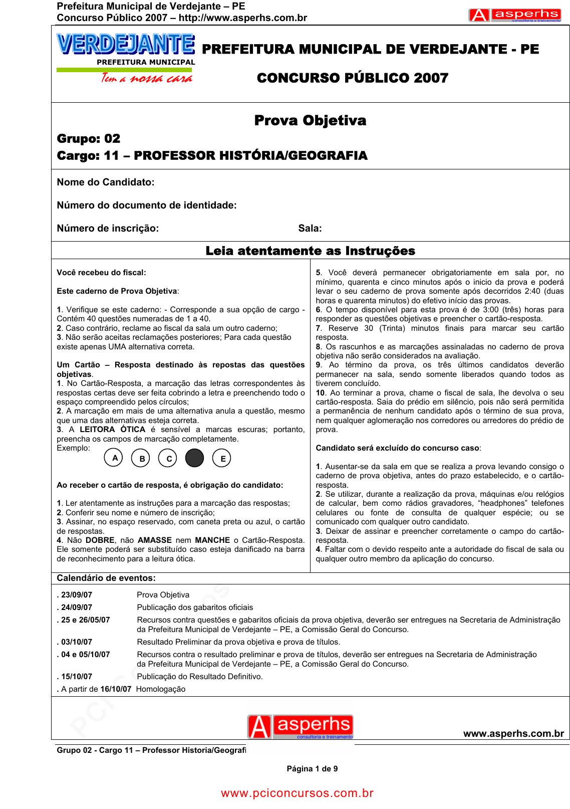pcimarkpci MDAwMDowMDAwOjAwMDA6MDAwMDowMDAwOmZmZmY6MzZlOTpjMjU5:TW9uLCAxMyBTZXAgMjAyMSAwNjozMjo1MCAtMDMwMA== Prefeitura Municipal de Verdejante – PE Concurso Público 2007 – http://www.asperhs.com.br Grupo 02 - Cargo 11 – Professor Historia/Geografia Página 1 de 9 PREFEITURA MUNICIPAL DE VERDEJANTE - PE PREFEITURA MUNICIPAL Tem a nossa cara CONCURSO PÚBLICO 2007 Prova Objetiva Grupo: 02 Cargo: 11 – PROFESSOR HISTÓRIA/GEOGRAFIA Nome do Candidato: Número do documento de identidade: Número de inscrição: Sala: Leia atentamente as Instruções Você recebeu do fiscal: Este caderno de Prova Objetiva: 1. Verifique se este caderno: - Corresponde a sua opção de cargo - Contém 40 questões numeradas de 1 a 40. 2. Caso contrário, reclame ao fiscal da sala um outro caderno; 3. Não serão aceitas reclamações posteriores; Para cada questão existe apenas UMA alternativa correta. Um Cartão – Resposta destinado às repostas das questões objetivas. 1. No Cartão-Resposta, a marcação das letras correspondentes às respostas certas deve ser feita cobrindo a letra e preenchendo todo o espaço compreendido pelos círculos; 2. A marcação em mais de uma alternativa anula a questão, mesmo que uma das alternativas esteja correta. 3. A LEITORA ÓTICA é sensível a marcas escuras; portanto, preencha os campos de marcação completamente. Exemplo: Ao receber o cartão de resposta, é obrigação do candidato: 1. Ler atentamente as instruções para a marcação das respostas; 2. Conferir seu nome e número de inscrição; 3. Assinar, no espaço reservado, com caneta preta ou azul, o cartão de respostas. 4. Não DOBRE, não AMASSE nem MANCHE o Cartão-Resposta. Ele somente poderá ser substituído caso esteja danificado na barra de reconhecimento para a leitura ótica. 5. Você deverá permanecer obrigatoriamente em sala por, no mínimo, quarenta e cinco minutos após o inicio da prova e poderá levar o seu caderno de prova somente após decorridos 2:40 (duas horas e quarenta minutos) do efetivo início das provas. 6. O tempo disponível para esta prova é de 3:00 (três) horas para responder as questões objetivas e preencher o cartão-resposta. 7. Reserve 30 (Trinta) minutos finais para marcar seu cartão resposta. 8. Os rascunhos e as marcações assinaladas no caderno de prova objetiva não serão considerados na avaliação. 9. Ao término da prova, os três últimos candidatos deverão permanecer na sala, sendo somente liberados quando todos as tiverem concluído. 10. Ao terminar a prova, chame o fiscal de sala, lhe devolva o seu cartão-resposta. Saia do prédio em silêncio, pois não será permitida a permanência de nenhum candidato após o término de sua prova, nem qualquer aglomeração nos corredores ou arredores do prédio de prova. Candidato será excluído do concurso caso: 1. Ausentar-se da sala em que se realiza a prova levando consigo o caderno de prova objetiva, antes do prazo estabelecido, e o cartão- resposta. 2. Se utilizar, durante a realização da prova, máquinas e/ou relógios de calcular, bem como rádios gravadores, “headphones” telefones celulares ou fonte de consulta de qualquer espécie; ou se comunicado com qualquer outro candidato. 3. Deixar de assinar e preencher corretamente o campo do cartão- resposta. 4. Faltar com o devido respeito ante a autoridade do fiscal de sala ou qualquer outro membro da aplicação do concurso. Calendário de eventos: . 23/09/07 Prova Objetiva . 24/09/07 Publicação dos gabaritos oficiais . 25 e 26/05/07 Recursos contra questões e gabaritos oficiais da prova objetiva, deverão ser entregues na Secretaria de Administração da Prefeitura Municipal de Verdejante – PE, a Comissão Geral do Concurso. . 03/10/07 Resultado Preliminar da prova objetiva e prova de títulos. . 04 e 05/10/07 Recursos contra o resultado preliminar e prova de títulos, deverão ser entregues na Secretaria de Administração da Prefeitura Municipal de Verdejante – PE, a Comissão Geral do Concurso. . 15/10/07 Publicação do Resultado Definitivo. . A partir de 16/10/07 Homologação www.asperhs.com.br A B C E www.pciconcursos.com.br pcimarkpci MDAwMDowMDAwOjAwMDA6MDAwMDowMDAwOmZmZmY6MzZlOTpjMjU5:TW9uLCAxMyBTZXAgMjAyMSAwNjozMjo1MCAtMDMwMA== Prefeitura Municipal de Verdejante – PE Concurso Público 2007 – http://www.asperhs.com.br Grupo 02 - Cargo 11 – Professor Historia/Geografia Página 2 de 9 Português Texto I A declaração Universal dos Direitos Humanos diz que todas as pessoas nascem livres. A mesma coisa foi dita por muitos filósofos e estudiosos da natureza e do comportamento dos seres humanos. Essa é uma afirmação muito importante, pois quer dizer que a liberdade faz parte da natureza humana. Por esse motivo, o direito à liberdade não pode ser tirado dos seres humanos, porque sem liberdade a pessoa humana não está completa. Para que se diga que uma pessoa tem direito de ser livre, é indispensável que essa pessoa possa tomar suas próprias decisões sobre o que pensar e fazer e que seus sentimentos sejam respeitados pelas outras. Ninguém é livre se não pode fazer sua própria escolha em matéria de religião, de política ou sobre aquilo em que vai ou não acreditar. Assim sendo, a liberdade de pensamento, de opinião e de sentimento faz parte do direito à liberdade, que deve ser assegurada a todos os seres humanos. É lição da História que, mesmo nas sociedades mais justas e tirânicas, sempre houve os que continuaram livres. Esses foram o núcleo de resistência, o ponto de partida para mudanças profundas, que mais cedo ou mais tarde acabam ocorrendo. A liberdade tem sido e poderá ser ofuscada muitas vezes, mas nunca morreu e nunca poderá morrer, porque é inerente à condição humana. (DALLAIR, Dalmo de Abreu. Direitos humanos e cidadania. São Paulo: Moderna, p. 29-31 . Adaptado) 01. A compreensão das idéias apresentadas no texto nos leva a: a) Estabelecer uma relação de contigüidade entre soci