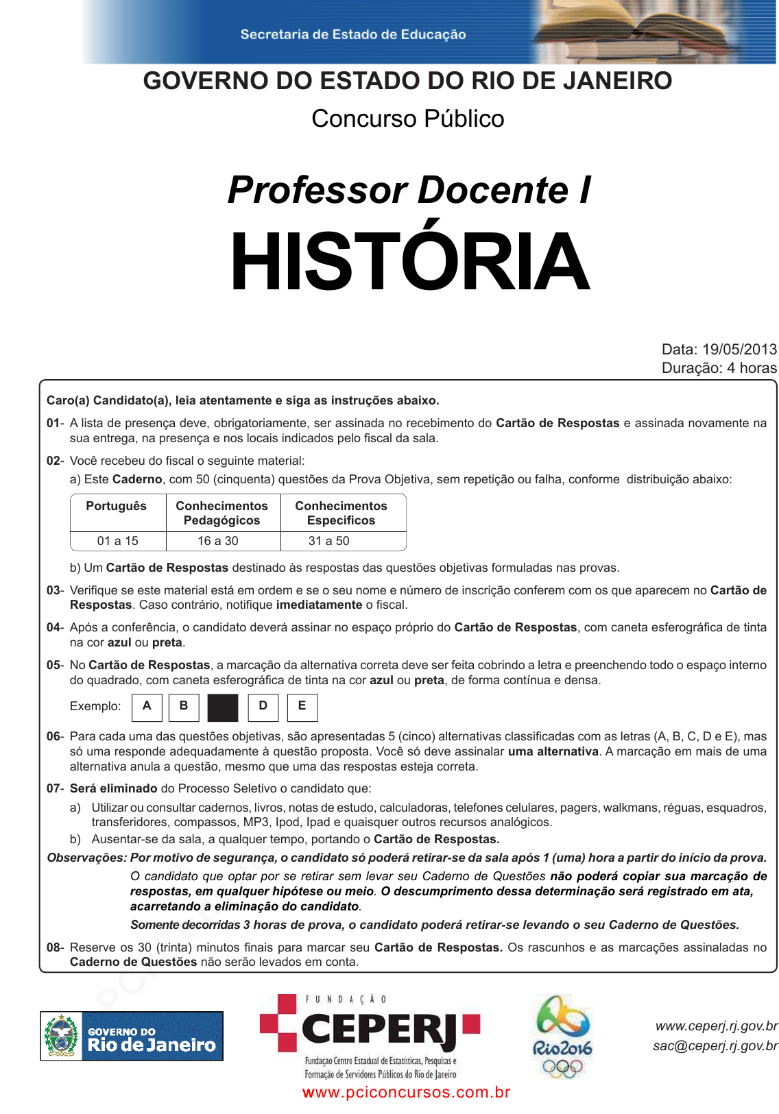pcimarkpci MDAwMDowMDAwOjAwMDA6MDAwMDowMDAwOmZmZmY6MzZlOTpjMjU5:TW9uLCAxMyBTZXAgMjAyMSAwNjo1Mzo0OCAtMDMwMA== Caro(a) Candidato(a), leia atentamente e siga as instruções abaixo. 01- A lista de presença deve, obrigatoriamente, ser assinada no recebimento do Cartão de Respostas e assinada novamente na sua entrega, na presença e nos locais indicados pelo fi scal da sala. 02- Você recebeu do fi scal o seguinte material: a) Este Caderno , com 50 (cinquenta) questões da Prova Objetiva, sem repetição ou falha, conforme distribuição abaixo: Português Conhecimentos Conhecimentos Pedagógicos Especí fi cos 01 a 15 16 a 30 31 a 50 b) Um Cartão de Respostas destinado às respostas das questões objetivas formuladas nas provas. 03- Verifi que se este material está em ordem e se o seu nome e número de inscrição conferem com os que aparecem no Cartão de Respostas . Caso contrário, notifi que imediatamente o fi scal. 04- Após a conferência, o candidato deverá assinar no espaço próprio do Cartão de Respostas , com caneta esferográfi ca de tinta na cor azul ou preta . 05- No Cartão de Respostas , a marcação da alternativa correta deve ser feita cobrindo a letra e preenchendo todo o espaço interno do quadrado, com caneta esferográfi ca de tinta na cor azul ou preta , de forma contínua e densa. Exemplo: 06- Para cada uma das questões objetivas, são apresentadas 5 (cinco) alternativas classifi cadas com as letras (A, B, C, D e E), mas só uma responde adequadamente à questão proposta. Você só deve assinalar uma alternativa . A marcação em mais de uma alternativa anula a questão, mesmo que uma das respostas esteja correta. 07- Será eliminado do Processo Seletivo o candidato que: a) Utilizar ou consultar cadernos, livros, notas de estudo, calculadoras, telefones celulares, pagers, walkmans, réguas, esquadros, transferidores, compassos, MP3, Ipod, Ipad e quaisquer outros recursos analógicos. b) Ausentar-se da sala, a qualquer tempo, portando o Cartão de Respostas. Observações: Por motivo de segurança, o candidato só poderá retirar-se da sala após 1 (uma) hora a partir do início da prova. O candidato que optar por se retirar sem levar seu Caderno de Questões não poderá copiar sua marcação de respostas, em qualquer hipótese ou meio . O descumprimento dessa determinação será registrado em ata, acarretando a eliminação do candidato . Somente decorridas 3 horas de prova, o candidato poderá retirar-se levando o seu Caderno de Questões. 08- Reserve os 30 (trinta) minutos fi nais para marcar seu Cartão de Respostas. Os rascunhos e as marcações assinaladas no Caderno de Questões não serão levados em conta. sac@ceperj.rj.gov.br www.ceperj.rj.gov.br Concurso Público Data: 19/05/2013 Duração: 4 horas GOVERNO DO ESTADO DO RIO DE JANEIRO A B C D E Professor Docente I HISTÓRIA www.pciconcursos.com.br www.pciconcursos.com.br www.pciconcursos.com.br pcimarkpci MDAwMDowMDAwOjAwMDA6MDAwMDowMDAwOmZmZmY6MzZlOTpjMjU5:TW9uLCAxMyBTZXAgMjAyMSAwNjo1Mzo0OSAtMDMwMA== Professor Docente I - HISTÓRIA 2GOVERNO DO ESTADO DO RIO DE JANEIRO - Secretaria de Estado de Educação - SEEDUCFundação Centro Estadual de Estatística, Pesquisa e Formação de Servidores Públicos do Rio de Janeiro - CEPERJ LÍNGUA PORTUGUESA TEXTO 1 01. A alternativa que mostra uma afi rmação inadequada em relação à charge acima é: A) facebook e compartilhando fazem parte do jargão da mídia social. B) a forma tô registra uma pronúncia corrente do português colo- quial. C) a forma a doidado representa um exemplo de gíria. D) a forma a doidado deveria estar corretamente grafada adoidado. E) a vírgula entre as duas frases do texto tem emprego equivocado. 02. Tendo em vista a situação de produção da charge, pode-se dizer que esse texto representa: A) uma crítica às autoridades da área de saúde. B) uma condenação da atitude de alguns cidadãos. C) um alerta contra o perigo da dengue no ano próximo. D) um comentário malicioso contra a inutilidade das redes sociais. E) uma ironia contra a falta de democracia na área digital. TEXTO 2 PENSAMENTOS DO MILLÔR O Estado só deveria dar ao indivíduo, como educação, o aprendizado da leitura. Daí em diante o cidadão seria, do ponto de vista ofi cial, completamente deseducado, o Estado criando apenas vastíssimas bibliotecas e centros de informações, onde o cidadão pudesse encontrar todas (mas todas mesmo) as tendências culturais existentes. Ao chegar à puberdade (14, 15, 16, 17 anos ou quando ele próprio decidisse) o cidadão frequentaria centros de aprendiza- do técnico, onde lidaria com máquinas e instrumentos necessários a uma educação técnica, não abstrata. Os cidadãos interessados apenas em atividades abstratas – escrever, pintar, psicanalisar ou politicar – frequentariam, se quisessem, locais de discussão – ágoras modernas – mas continuariam, no sentido atual, totalmente autodidatas. O sistema educacional vigente é apenas uma maneira de levar a ignorância às suas extremas consequências. (Millôr Fernandes, Defi nitivo) 03. O autor do texto atua como: A) conselheiro crítico B) autoridade inquestionável C) humorista cético D) educador tradicional E) cientista inquieto 04. “O Estado só deveria dar ao indivíduo...”; o emprego do futuro do pretérito, nesse caso, se justifi ca porque esse tempo verbal expressa: A) uma ação que ainda vai realizar-se. B) uma ordem ou recomendação moral. C) um fato que se dará, dependendo de certa condição. D) admiração por um fato se ter realizado. E) uma ação hipotética, agora ou no futuro. 05. “O Estado só deveria dar ao indivíduo, como educação, o aprendizado da leitura”; a única forma de reescrever-se essa frase do texto que altera o seu signifi cado original é: A) Como educação, o Estado só deveria dar ao indivíduo o apren- dizado da leitura. B) O aprendizado da leitura é a única coisa que deveria ser dada pelo Estado ao indiví