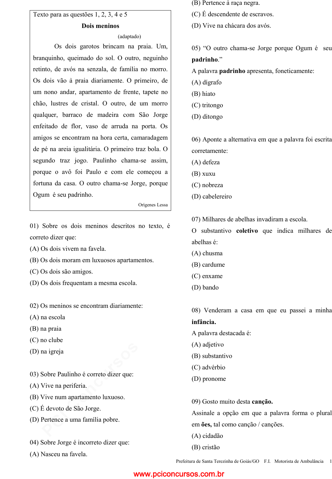 pcimarkpci MDAwMDowMDAwOjAwMDA6MDAwMDowMDAwOmZmZmY6MzZlOTpjMjU5:V2VkLCAxNSBTZXAgMjAyMSAwMTowMzozNCAtMDMwMA== Prefeitura de Santa Terezinha de Goiás/GO F.I. Motorista de Ambulância 1 Texto para as questões 1, 2, 3, 4 e 5 Dois meninos (adaptado) Os dois garotos brincam na praia. Um, branquinho, queimado do sol. O outro, neguinho retinto, de avós na senzala, de família no morro. Os dois vão à praia diariamente. O primeiro, de um nono andar, apartamento de frente, tapete no chão, lustres de cristal. O outro, de um morro qualquer, barraco de madeira com São Jorge enfeitado de flor, vaso de arruda na porta. Os amigos se encontram na hora certa, camaradagem de pé na areia igualitária. O primeiro traz bola. O segundo traz jogo. Paulinho chama-se assim, porque o avô foi Paulo e com ele começou a fortuna da casa. O outro chama-se Jorge, porque Ogum é seu padrinho. Orígenes Lessa 01) Sobre os dois meninos descritos no texto, é correto dizer que: (A) Os dois vivem na favela. (B) Os dois moram em luxuosos apartamentos. (C) Os dois são amigos. (D) Os dois frequentam a mesma escola. 02) Os meninos se encontram diariamente: (A) na escola (B) na praia (C) no clube (D) na igreja 03) Sobre Paulinho é correto dizer que: (A) Vive na periferia. (B) Vive num apartamento luxuoso. (C) É devoto de São Jorge. (D) Pertence a uma família pobre. 04) Sobre Jorge é incorreto dizer que: (A) Nasceu na favela. (B) Pertence à raça negra. (C) É descendente de escravos. (D) Vive na chácara dos avós. 05) “O outro chama-se Jorge porque Ogum é seu padrinho.” A palavra padrinho apresenta, foneticamente: (A) dígrafo (B) hiato (C) tritongo (D) ditongo 06) Aponte a alternativa em que a palavra foi escrita corretamente: (A) defeza (B) xuxu (C) nobreza (D) cabelereiro 07) Milhares de abelhas invadiram a escola. O substantivo coletivo que indica milhares de abelhas é: (A) chusma (B) cardume (C) enxame (D) bando 08) Venderam a casa em que eu passei a minha infância. A palavra destacada é: (A) adjetivo (B) substantivo (C) advérbio (D) pronome 09) Gosto muito desta canção. Assinale a opção em que a palavra forma o plural em ões, tal como canção / canções. (A) cidadão (B) cristão www.pciconcursos.com.br pcimarkpci MDAwMDowMDAwOjAwMDA6MDAwMDowMDAwOmZmZmY6MzZlOTpjMjU5:V2VkLCAxNSBTZXAgMjAyMSAwMTowMzozNCAtMDMwMA== Prefeitura de Santa Terezinha de Goiás/GO F.I. Motorista de Ambulância 2 (C) balão (D) irmão 10) “Se aqui tivesse metrô, eu chegaria rapidinho no meu trabalho.” A separação silábica de rapidinho é: (A) ra – pi – din - ho (B) rapi – di - nho (C) ra – pi – di - nho (D) rapi – din - ho 11) Considere a relação existente entre o primeiro e o segundo grupos de número, a contar da esquerda do esquema abaixo. A mesma relação deve existir entre o terceiro e o quarto, que está faltando. 1º 2º 3º 4º 1 2 3 1 5 6 7 5 9 10 11 9 ? O grupo de números que substitui corretamente o ponto de interrogação é? (A) 12 13 14 12 (B) 10 11 12 10 (C) 13 14 15 13 (D) 11 12 13 11 12) Três quintos da verba mensal de uma secretaria são reservados para o pagamento dos funcionários e um terço do que sobra para os gastos de emergência. A secretaria fica então com R$ 21.600,00 para os demais gastos. A verba mensal desta secretaria é: (A) R$ 80.000,00 (B) R$ 80.500,00 (C) R$ 81.000,00 (D) R$ 81.500,00 13) Um colecionador de disco vinil possui entre 130 e 230 discos. Contanto sempre de 3 em 3, 4 em 4, 5 em 5 sempre sobram 2 discos. Quantos são os discos? (A) 176 (B) 178 (C) 180 (D) 182 14) Em um fila para entrada no estádio, João gritou que estava no meio da fila e que era o quinquagésimo oitavo da fila. Quantas pessoas estavam na fila? (A) 114 (B) 115 (C) 116 (D) 117 15) Anos bissextos são aqueles diviseis por 4. O ano 2016, por exemplo, é um ano bissexto. Quantos anos entre 1989 e 2016 são bissextos? (A) 5 (B) 6 (C) 8 (D) 9 16) Um motorista iniciou uma viagem às 6h 13min e chegou ao seu destino às 21h 26 min. Essa viagem durou: (A) 14h 13min (B) 14h 29min (C) 15h 13 min (D) 15h 29min 17) Um pedreiro, assenta 5 tijolos em 40 segundos para construção de um muro. Em um dia de trabalho, começou a assentar tijolos às 8h 35min e parou às 11h 51min. Se ele manteve o mesmo ritmo para assentar os tijolos, o número de tijolos por esse pedreiro, nesse intervalo de tempo, foi de : (A) 1.395 (B) 1.398 (C) 1.402 (D) 1.406 www.pciconcursos.com.br pcimarkpci MDAwMDowMDAwOjAwMDA6MDAwMDowMDAwOmZmZmY6MzZlOTpjMjU5:V2VkLCAxNSBTZXAgMjAyMSAwMTowMzozNCAtMDMwMA== Prefeitura de Santa Terezinha de Goiás/GO F.I. Motorista de Ambulância 3 18) Uma professora corrige as redações em 4 horas. Outra professora faz o mesmo serviço em 3 horas. Se elas trabalharem juntas, em quanto tempo, aproximadamente, as redações estarão corrigidas? (A) 1h 40 min (B) 1h 43 min (C) 1h 46 min (D) 1h 49 min 19) Qual idade atual da professora: (A) 80 (B) 82 (C) 84 (D) 86 20) Com que idade a professora se casou: (A) 28 (B) 30 (C) 32 (D) 35 Em relação às informações do texto, responda as questões 19 e 20. Uma professora, não conta sua idade pra ninguém, mas dá as seguintes dicas: 1/12 de sua vida ocorreu antes dela começar a estudar; estudou durante 1/4 da sua vida; depois, ela trabalhou durante 1/12 de sua vida e, então se casou; passado mais 1/3 de sua vida, ela ficou viúva e foi viúva por 21 anos. www.pciconcursos.com.br pcimarkpci MDAwMDowMDAwOjAwMDA6MDAwMDowMDAwOmZmZmY6MzZlOTpjMjU5:V2VkLCAxNSBTZXAgMjAyMSAwMTowMzozMSAtMDMwMA== CÂMARA MUNICIPAL DE SANTA TEREZINHA DE GOIÁS GABARITO PRELIMINAR ENSINO FUNDAMENTAL INCOMPLETO AUXILIAR DE SERVIÇOS GERAIS 01 02 03 04 05 06 07 08 09 10 C B B D A C C B C C 11 12 13 14 15 16 17 18 19 20 C C D B B C A B C D GUARDA NOTURNO 01 02 03 04 05 06 07 08 09 10 C B B D A C C B C C 11 12 13 14 15 16 17 18 19 20 C C D B B C A B C D MERENDEIRA 01 02 03 04 05 06 07 08 09 10 C B B D A C C B C C 11 12 13 14 15 16 17 18 19 20 C C D B B C A B C D MOTORISTA DE AMBULÂN