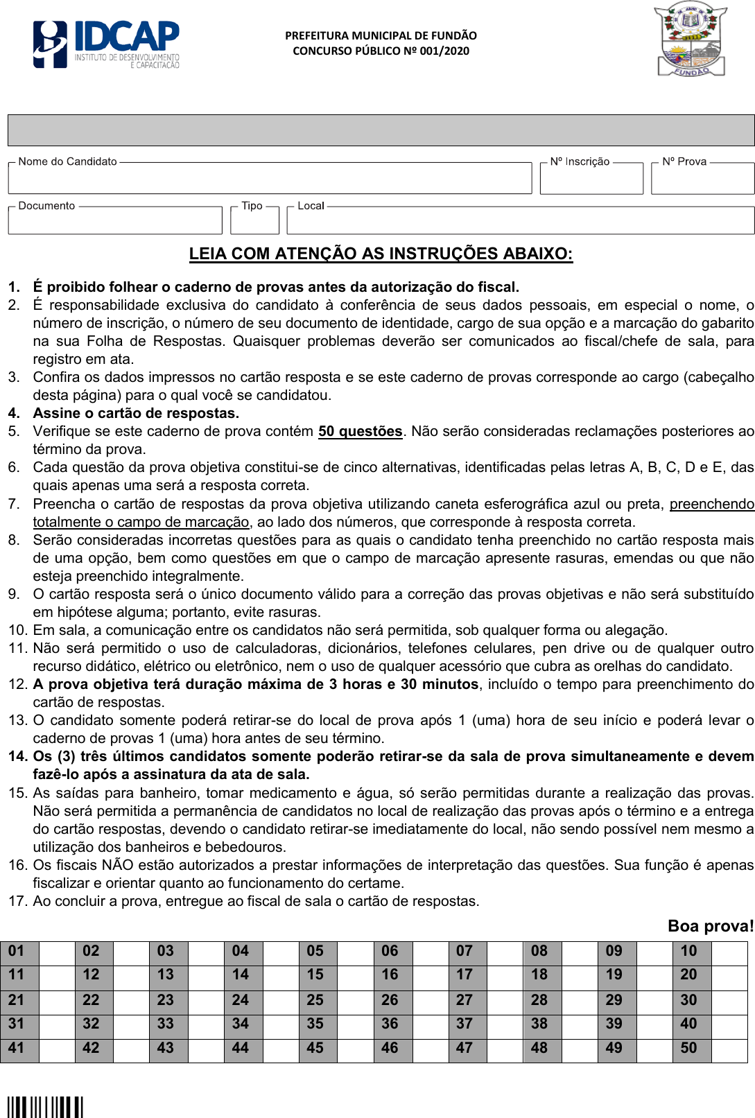 ARQUITETO N 3271 PREFEITURA MUNICIPAL DE FUNDÃO CONCURSO PÚBLICO Nº 001/2020 LEIA COM ATENÇÃO AS INSTRUÇÕES ABAIXO: 1. É proibido folhear o caderno de provas antes da autorização do fiscal. 2. É responsabilidade exclusiva do candidato à conferência de seus dados pessoais, em especial o nome, o número de inscrição, o número de seu documento de identidade, cargo de sua opção e a marcação do gabarito na sua Folha de Respostas. Quaisquer problemas deverão ser comunicados ao fiscal/chefe de sala, para registro em ata. 3. Confira os dados impressos no cartão resposta e se este caderno de provas corresponde ao cargo (cabeçalho desta página) para o qual você se candidatou. 4. Assine o cartão de respostas. 5. Verifique se este caderno de prova contém 50 questões. Não serão consideradas reclamações posteriores ao término da prova. 6. Cada questão da prova objetiva constitui-se de cinco alternativas, identificadas pelas letras A, B, C, D e E, das quais apenas uma será a resposta correta. 7. Preencha o cartão de respostas da prova objetiva utilizando caneta esferográfica azul ou preta, preenchendo totalmente o campo de marcação, ao lado dos números, que corresponde à resposta correta. 8. Serão consideradas incorretas questões para as quais o candidato tenha preenchido no cartão resposta mais de uma opção, bem como questões em que o campo de marcação apresente rasuras, emendas ou que não esteja preenchido integralmente. 9. O cartão resposta será o único documento válido para a correção das provas objetivas e não será substituído em hipótese alguma; portanto, evite rasuras. 10. Em sala, a comunicação entre os candidatos não será permitida, sob qualquer forma ou alegação. 11. Não será permitido o uso de calculadoras, dicionários, telefones celulares, pen drive ou de qualquer outro recurso didático, elétrico ou eletrônico, nem o uso de qualquer acessório que cubra as orelhas do candidato. 12. A prova objetiva terá duração máxima de 3 horas e 30 minutos, incluído o tempo para preenchimento do cartão de respostas. 13. O candidato somente poderá retirar-se do local de prova após 1 (uma) hora de seu início e poderá levar o caderno de provas 1 (uma) hora antes de seu término. 14. Os (3) três últimos candidatos somente poderão retirar-se da sala de prova simultaneamente e devem fazê-lo após a assinatura da ata de sala. 15. As saídas para banheiro, tomar medicamento e água, só serão permitidas durante a realização das provas. Não será permitida a permanência de candidatos no local de realização das provas após o término e a entrega do cartão respostas, devendo o candidato retirar-se imediatamente do local, não sendo possível nem mesmo a utilização dos banheiros e bebedouros. 16. Os fiscais NÃO estão autorizados a prestar informações de interpretação das questões. Sua função é apenas fiscalizar e orientar quanto ao funcionamento do certame. 17. Ao concluir a prova, entregue ao fiscal de sala o cartão de respostas. Boa prova! 01 02 03 04 05 06 07 08 09 10 11 12 13 14 15 16 17 18 19 20 21 22 23 24 25 26 27 28 29 30 31 32 33 34 35 36 37 38 39 40 41 42 43 44 45 46 47 48 49 50 1 PREFEITURA MUNICIPAL DE FUNDÃO CONCURSO PÚBLICO Nº 001/2020 RASCUNHO ARQUITETO 2 PREFEITURA MUNICIPAL DE FUNDÃO CONCURSO PÚBLICO Nº 001/2020 Língua Portuguesa Questão 01 Qual frase abaixo está redigida de acordo com o Novo Acordo Ortográfico? a) Ontem, a Assembleia Legislativa aprovou uma nova legislação de trânsito. b) Meu cachorro já tomou a vacina anti-rábica. c) Maria voltou das compras com 5 quilos de lingüiça. d) O nosso microondas quebrou. e) Entre os principais sintomas da doença estão dor de cabeça e enjôo. Questão 02 Julgue corretamente o período abaixo quanto ao emprego dos artigos. O jornal publicou uma matéria informando toda a população sobre os riscos do coronavírus. a) artigo indefinido; artigo indefinido; artigo indefinido; artigo definido. b) artigo definido; artigo definido; artigo definido; artigo definido. c) artigo indefinido; artigo definido; artigo indefinido; artigo definido. d) artigo indefinido; artigo definido; artigo definido; artigo indefinido. e) artigo indefinido; artigo definido; artigo definido; artigo definido. Questão 03 Assinale a alternativa que NÃO apresenta um pleonasmo vicioso. a) Eu gosto de histórias que tenham compromisso com fatos reais. b) Penso que outra alternativa seria votar em branco ou nulo. c) A grande maioria preferiu ficar e esperar o resultado. d) Há um elo de ligação entre as ações dos ambientalistas e das ONGs. e) Para que as discussões avancem, é necessário que haja um consenso geral. Questão 04 No período: "Em seu aniversário de 15 anos, Luana estava bela como as flores do campo.", a palavra destacada expressa uma ideia de: a) Adição. b) Comparação. c) Causa. d) Conclusão. e) Explicação. Questão 05 Considerando as interjeições abaixo, marque a alternativa que apresenta o valor semântico correto. 1- Caramba! Você é uma pessoa incrível! 2- Eca! Não gostei dessa comida! a) 1 - admiração; 2 - aversão. b) 1 - admiração; 2 - espanto. c) 1 - espanto; 2 - admiração. d) 1 - alívio; 2 - aversão. e) 1 - espanto; 2 - aversão. Questão 06 Na frase: "A mochila pesa uma tonelada", encontramos a figura denominada: a) Catacrese. b) Onomatopeia. c) Antonomásia. d) Hipérbole. e) Sinestesia. Questão 07 Analise a frase abaixo: É admirável a maneira loquaz com que discursa à plateia. Qual das palavras abaixo pode substituir a palavra em negrito sem causar prejuízo semântico? a) modesta. b) bela. ARQUITETO 3 PREFEITURA MUNICIPAL DE FUNDÃO CONCURSO PÚBLICO Nº 001/2020 c) eloquente. d) maliciosa. e) prepotente. Questão 08 Assinale a alternativa em que a regência verbal está INCORRETA. a) O objetivo do empresário era apenas lucrar. b) Tereza tinha compradopresentes para toda a família. c) Maria buscava uma vida