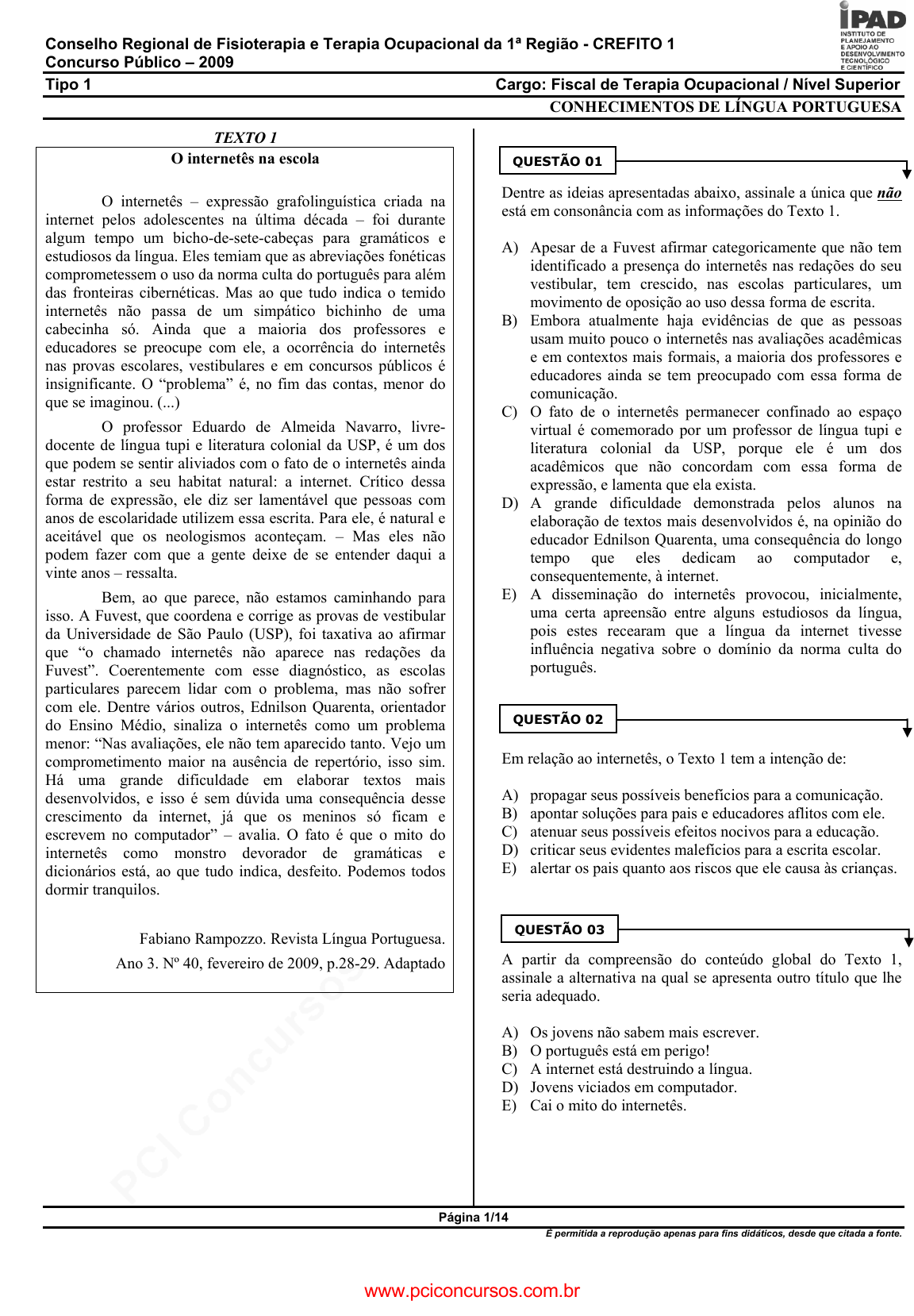 pcimarkpci MDAwMDowMDAwOjAwMDA6MDAwMDowMDAwOmZmZmY6MzZlOTpjMjU5:VGh1LCAxNiBTZXAgMjAyMSAwNDozNTowMCAtMDMwMA== Conselho Regional de Fisioterapia e Terapia Ocupacional da 1ª Região - CREFITO 1 Concurso Público – 2009 Tipo 1 Cargo: Fiscal de Terapia Ocupacional / Nível Superior Página 1/14 É permitida a reprodução apenas para fins didáticos, desde que citada a fonte. CONHECIMENTOS DE LÍNGUA PORTUGUESA TEXTO 1 O internetês na escola O internetês – expressão grafolinguística criada na internet pelos adolescentes na última década – foi durante algum tempo um bicho-de-sete-cabeças para gramáticos e estudiosos da língua. Eles temiam que as abreviações fonéticas comprometessem o uso da norma culta do português para além das fronteiras cibernéticas. Mas ao que tudo indica o temido internetês não passa de um simpático bichinho de uma cabecinha só. Ainda que a maioria dos professores e educadores se preocupe com ele, a ocorrência do internetês nas provas escolares, vestibulares e em concursos públicos é insignificante. O “problema” é, no fim das contas, menor do que se imaginou. (...) O professor Eduardo de Almeida Navarro, livre- docente de língua tupi e literatura colonial da USP, é um dos que podem se sentir aliviados com o fato de o internetês ainda estar restrito a seu habitat natural: a internet. Crítico dessa forma de expressão, ele diz ser lamentável que pessoas com anos de escolaridade utilizem essa escrita. Para ele, é natural e aceitável que os neologismos aconteçam. – Mas eles não podem fazer com que a gente deixe de se entender daqui a vinte anos – ressalta. Bem, ao que parece, não estamos caminhando para isso. A Fuvest, que coordena e corrige as provas de vestibular da Universidade de São Paulo (USP), foi taxativa ao afirmar que “o chamado internetês não aparece nas redações da Fuvest”. Coerentemente com esse diagnóstico, as escolas particulares parecem lidar com o problema, mas não sofrer com ele. Dentre vários outros, Ednilson Quarenta, orientador do Ensino Médio, sinaliza o internetês como um problema menor: “Nas avaliações, ele não tem aparecido tanto. Vejo um comprometimento maior na ausência de repertório, isso sim. Há uma grande dificuldade em elaborar textos mais desenvolvidos, e isso é sem dúvida uma consequência desse crescimento da internet, já que os meninos só ficam e escrevem no computador” – avalia. O fato é que o mito do internetês como monstro devorador de gramáticas e dicionários está, ao que tudo indica, desfeito. Podemos todos dormir tranquilos. Fabiano Rampozzo. Revista Língua Portuguesa. Ano 3. Nº 40, fevereiro de 2009, p.28-29. Adaptado Dentre as ideias apresentadas abaixo, assinale a única que não está em consonância com as informações do Texto 1. A) Apesar de a Fuvest afirmar categoricamente que não tem identificado a presença do internetês nas redações do seu vestibular, tem crescido, nas escolas particulares, um movimento de oposição ao uso dessa forma de escrita. B) Embora atualmente haja evidências de que as pessoas usam muito pouco o internetês nas avaliações acadêmicas e em contextos mais formais, a maioria dos professores e educadores ainda se tem preocupado com essa forma de comunicação. C) O fato de o internetês permanecer confinado ao espaço virtual é comemorado por um professor de língua tupi e literatura colonial da USP, porque ele é um dos acadêmicos que não concordam com essa forma de expressão, e lamenta que ela exista. D) A grande dificuldade demonstrada pelos alunos na elaboração de textos mais desenvolvidos é, na opinião do educador Ednilson Quarenta, uma consequência do longo tempo que eles dedicam ao computador e, consequentemente, à internet. E) A disseminação do internetês provocou, inicialmente, uma certa apreensão entre alguns estudiosos da língua, pois estes recearam que a língua da internet tivesse influência negativa sobre o domínio da norma culta do português. Em relação ao internetês, o Texto 1 tem a intenção de: A) propagar seus possíveis benefícios para a comunicação. B) apontar soluções para pais e educadores aflitos com ele. C) atenuar seus possíveis efeitos nocivos para a educação. D) criticar seus evidentes malefícios para a escrita escolar. E) alertar os pais quanto aos riscos que ele causa às crianças. A partir da compreensão do conteúdo global do Texto 1, assinale a alternativa na qual se apresenta outro título que lhe seria adequado. A) Os jovens não sabem mais escrever. B) O português está em perigo! C) A internet está destruindo a língua. D) Jovens viciados em computador. E) Cai o mito do internetês. QUESTÃO 01 QUESTÃO 02 QUESTÃO 03 www.pciconcursos.com.br pcimarkpci MDAwMDowMDAwOjAwMDA6MDAwMDowMDAwOmZmZmY6MzZlOTpjMjU5:VGh1LCAxNiBTZXAgMjAyMSAwNDozNTowMCAtMDMwMA== Conselho Regional de Fisioterapia e Terapia Ocupacional da 1ª Região - CREFITO 1 Concurso Público – 2009 Tipo 1 Cargo: Fiscal de Terapia Ocupacional / Nível Superior Página 2/14 É permitida a reprodução apenas para fins didáticos, desde que citada a fonte. Considerada no contexto em que se insere, podemos dizer que, com a afirmação de que “o temido internetês não passa de um simpático bichinho de uma cabecinha só”, o autor do Texto 1 pretendeu dizer que o internetês é: A) inútil. B) interessante. C) imprevisível. D) inofensivo. E) imprestável. “Ainda que a maioria dos professores e educadores se preocupe com ele, a ocorrência do internetês nas provas escolares, vestibulares e em concursos públicos é insignificante.” Nesse trecho, o segmento destacado estabelece com o seguinte uma relação semântica de: A) causa. B) concessão. C) condição. D) conclusão. E) adição. Analise as proposições a seguir, que tratam da função de alguns elementos linguísticos do Texto 1. 1. No trecho: “ele diz ser lamentável que pessoas com anos de escolaridade utilizem essa 