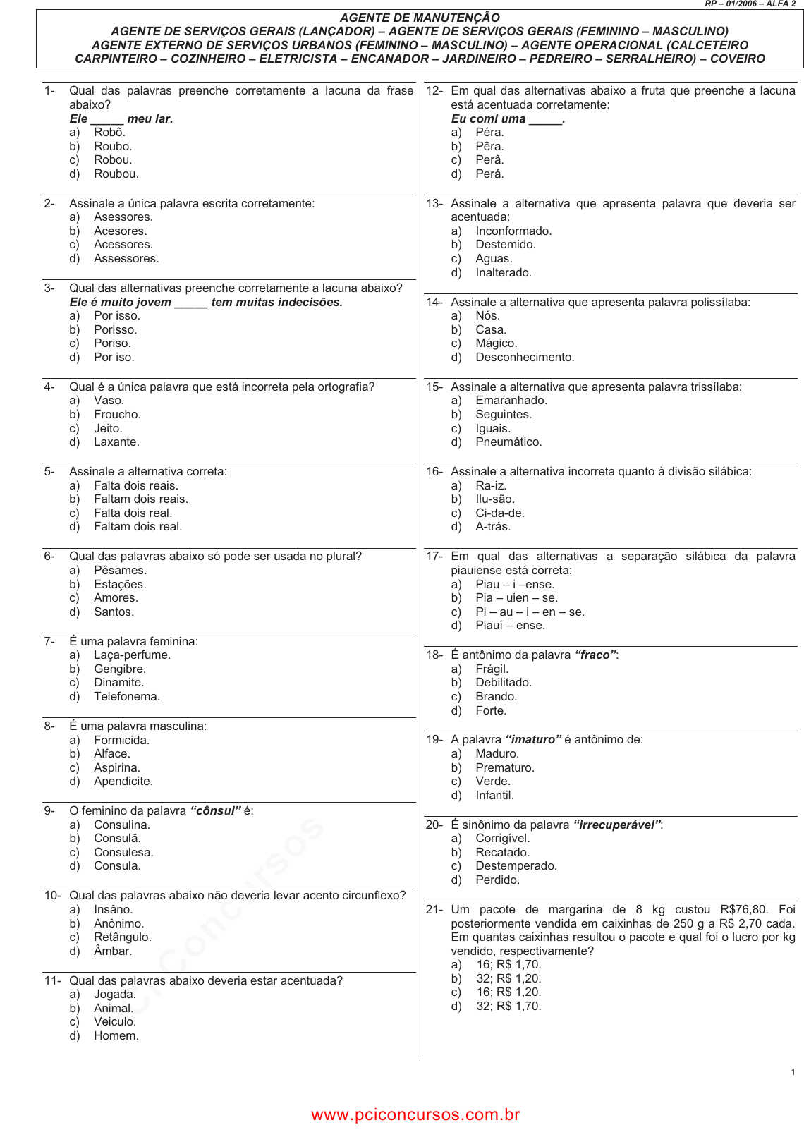 pcimarkpci MDAwMDowMDAwOjAwMDA6MDAwMDowMDAwOmZmZmY6MzZlOTpjMjU5:VGh1LCAxNiBTZXAgMjAyMSAxMDozNDo1OCAtMDMwMA== RP – 01/2006 – ALFA 2 1 AGENTE DE MANUTENÇÃO AGENTE DE SERVIÇOS GERAIS (LANÇADOR) – AGENTE DE SERVIÇOS GERAIS (FEMININO – MASCULINO) AGENTE EXTERNO DE SERVIÇOS URBANOS (FEMININO – MASCULINO) – AGENTE OPERACIONAL (CALCETEIRO CARPINTEIRO – COZINHEIRO – ELETRICISTA – ENCANADOR – JARDINEIRO – PEDREIRO – SERRALHEIRO) – COVEIRO 1- Qual das palavras preenche corretamente a lacuna da frase abaixo? Ele _____ meu lar. a) Robô. b) Roubo. c) Robou. d) Roubou. 2- Assinale a única palavra escrita corretamente: a) Asessores. b) Acesores. c) Acessores. d) Assessores. 3- Qual das alternativas preenche corretamente a lacuna abaixo? Ele é muito jovem _____ tem muitas indecisões. a) Por isso. b) Porisso. c) Poriso. d) Por iso. 4- Qual é a única palavra que está incorreta pela ortografia? a) Vaso. b) Froucho. c) Jeito. d) Laxante. 5- Assinale a alternativa correta: a) Falta dois reais. b) Faltam dois reais. c) Falta dois real. d) Faltam dois real. 6- Qual das palavras abaixo só pode ser usada no plural? a) Pêsames. b) Estações. c) Amores. d) Santos. 7- É uma palavra feminina: a) Laça-perfume. b) Gengibre. c) Dinamite. d) Telefonema. 8- É uma palavra masculina: a) Formicida. b) Alface. c) Aspirina. d) Apendicite. 9- O feminino da palavra “cônsul” é: a) Consulina. b) Consulã. c) Consulesa. d) Consula. 10- Qual das palavras abaixo não deveria levar acento circunflexo? a) Insâno. b) Anônimo. c) Retângulo. d) Âmbar. 11- Qual das palavras abaixo deveria estar acentuada? a) Jogada. b) Animal. c) Veiculo. d) Homem. 12- Em qual das alternativas abaixo a fruta que preenche a lacuna está acentuada corretamente: Eu comi uma _____. a) Péra. b) Pêra. c) Perâ. d) Perá. 13- Assinale a alternativa que apresenta palavra que deveria ser acentuada: a) Inconformado. b) Destemido. c) Aguas. d) Inalterado. 14- Assinale a alternativa que apresenta palavra polissílaba: a) Nós. b) Casa. c) Mágico. d) Desconhecimento. 15- Assinale a alternativa que apresenta palavra trissílaba: a) Emaranhado. b) Seguintes. c) Iguais. d) Pneumático. 16- Assinale a alternativa incorreta quanto à divisão silábica: a) Ra-iz. b) Ilu-são. c) Ci-da-de. d) A-trás. 17- Em qual das alternativas a separação silábica da palavra piauiense está correta: a) Piau – i –ense. b) Pia – uien – se. c) Pi – au – i – en – se. d) Piauí – ense. 18- É antônimo da palavra “fraco”: a) Frágil. b) Debilitado. c) Brando. d) Forte. 19- A palavra “imaturo” é antônimo de: a) Maduro. b) Prematuro. c) Verde. d) Infantil. 20- É sinônimo da palavra “irrecuperável”: a) Corrigível. b) Recatado. c) Destemperado. d) Perdido. 21- Um pacote de margarina de 8 kg custou R$76,80. Foi posteriormente vendida em caixinhas de 250 g a R$ 2,70 cada. Em quantas caixinhas resultou o pacote e qual foi o lucro por kg vendido, respectivamente? a) 16; R$ 1,70. b) 32; R$ 1,20. c) 16; R$ 1,20. d) 32; R$ 1,70. www.pciconcursos.com.br pcimarkpci MDAwMDowMDAwOjAwMDA6MDAwMDowMDAwOmZmZmY6MzZlOTpjMjU5:VGh1LCAxNiBTZXAgMjAyMSAxMDozNDo1OCAtMDMwMA== RP – 01/2006 – ALFA 2 2 22- Tenho um rolo de 60 m de barbante e preciso cortá-lo em pedaços de 20 m cada um. Quantos pedaços vou obter? a) 30. b) 1.200. c) 12. d) 300. 23- Sabendo-se que 3 kg de carne custam R$ 17,40, qual o preço de 600 g? a) R$ 3,48. b) R$ 5,28. c) R$ 4,28. d) R$ 3,08. 24- Lucia foi ao mercado e comprou 3 latas de ervilha a R$ 1,08 cada, 2 latas de molho de tomate a R$ 1,97 cada, e 6 caixinhas de gelatina a R$ 0,86 cada. Pagou com 2 notas de R$ 5,00 e 1 de R$ 10,00. Qual foi o seu troco? a) R$ 2,50. b) R$ 5,50. c) R$ 7,66. d) R$ 8,50. 25- Uma sala mede 6 m de comprimento por 7,60 m de largura. Os tacos dessa sala são retangulares medindo 0,12 m de comprimento por 0,05 m de largura. Quantos tacos há na sala? a) 76. b) 760. c) 7.600. d) 76.000. 26- Existem vários pares de números cuja soma é 20. Descubra o par que resultará no maior produto. a) 10 e 10. b) 8 e 12. c) 11 e 9. d) 13 e 7. 27- Descubra o número que multiplicado por 48 resultará em 4.944: a) 98. b) 13. c) 103. d) 108. 28- Um pai tem 48 anos e seu filho tem � � da sua idade. Quantos anos têm seu filho? a) 6. b) 8. c) 12. d) 16. 29- Otávio dormiu das 23 horas e 15 minutos até as 7 horas e 32 minutos do dia seguinte. Quanto tempo ele dormiu? a) 8 horas e 43 minutos. b) 9 horas e 43 minutos. c) 8 horas e 17 minutos. d) 9 horas e 17 minutos. 30- Se dos � � de um determinado número for tirado os seus � � , sobrará 24. Qual é esse número? a) 360. b) 280. c) 420. d) 120. 31- Quantas caixas de 0,4 m de comprimento, 0,30 m de largura e 0,20 m de altura podem conter em um depósito, de 6 m de comprimento, 3 m de altura e 5 m de largura? a) 5.750. b) 375. c) 575. d) 3.750. 32- São dados dois números, dos quais o maior é 480. Tirando 250 do maior e 128 do menor, a soma dos resultados é 300. O menor número é: a) 198. b) 201. c) 398. d) 260. 33- De R$ 300,00, 45 % corresponde a: a) R$ 165,00. b) R$ 145,00. c) R$ 125,00. d) R$ 135,00. 34- Se Meire comeu � � do bolo e Bia comeu � � , que fatia do bolo sobrou? a) � � . b) � � . c) �� �� . d) � . 35- O número três milhões, setenta mil e oito corresponde a: a) 3.708.000. b) 370.008. c) 3.070.008. d) 3.078.000. 36- Não é um personagem da história do Brasil: a) Eurico Gaspar Dutra. b) Ernesto Che Guevara. c) Padre Anchieta. d) João Goulart. 37- Marechal Deodoro da Fonseca: a) Proclamou a República. b) Descobriu o Brasil. c) Proclamou a Independência. d) Libertou os escravos. 38- Com o descobrimento, o Brasil ficou: a) Livre. b) Pertencendo à Inglaterra. c) Parceiro de Portugal. d) Pertencendo a Portugal. 39- A festa popular e tradicional de Santo Antônio, de origem portuguesa, ocorre no mês de: a) Maio. b) Junho. c) Julho. d) Agosto. 40- Por que Tiradentes é considerad