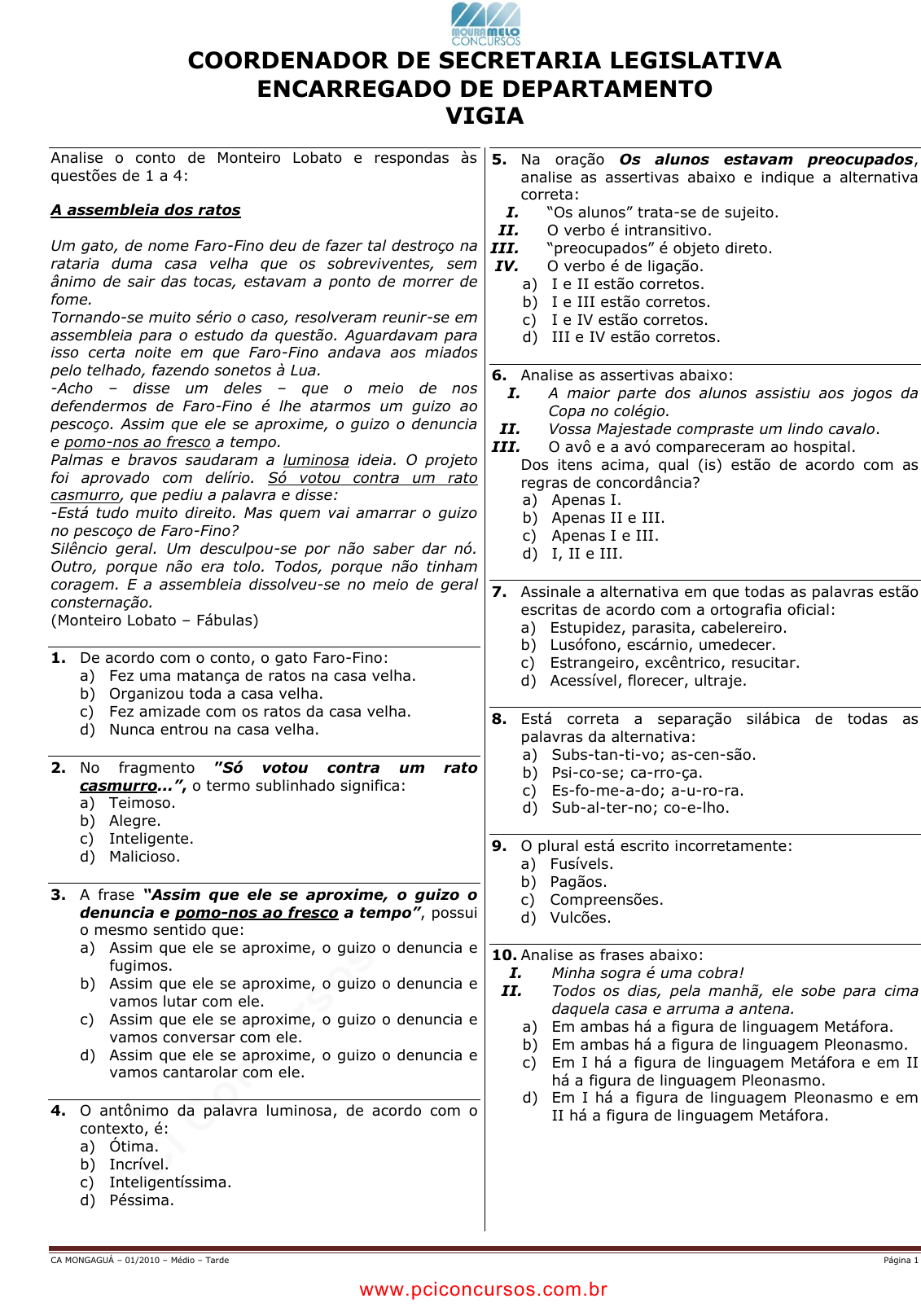 pcimarkpci MDAwMDowMDAwOjAwMDA6MDAwMDowMDAwOmZmZmY6MzZlOTpjMjU5:VGh1LCAxNiBTZXAgMjAyMSAxNTo1Nzo0NiAtMDMwMA== CA MONGAGUÁ – 01/2010 – Médio – Tarde Página 1 COORDENADOR DE SECRETARIA LEGISLATIVA ENCARREGADO DE DEPARTAMENTO VIGIA Analise o conto de Monteiro Lobato e respondas às questões de 1 a 4: A assembleia dos ratos Um gato, de nome Faro-Fino deu de fazer tal destroço na rataria duma casa velha que os sobreviventes, sem ânimo de sair das tocas, estavam a ponto de morrer de fome. Tornando-se muito sério o caso, resolveram reunir-se em assembleia para o estudo da questão. Aguardavam para isso certa noite em que Faro-Fino andava aos miados pelo telhado, fazendo sonetos à Lua. -Acho – disse um deles – que o meio de nos defendermos de Faro-Fino é lhe atarmos um guizo ao pescoço. Assim que ele se aproxime, o guizo o denuncia e pomo-nos ao fresco a tempo. Palmas e bravos saudaram a luminosa ideia. O projeto foi aprovado com delírio. Só votou contra um rato casmurro, que pediu a palavra e disse: -Está tudo muito direito. Mas quem vai amarrar o guizo no pescoço de Faro-Fino? Silêncio geral. Um desculpou-se por não saber dar nó. Outro, porque não era tolo. Todos, porque não tinham coragem. E a assembleia dissolveu-se no meio de geral consternação. (Monteiro Lobato – Fábulas) 1. De acordo com o conto, o gato Faro-Fino: a) Fez uma matança de ratos na casa velha. b) Organizou toda a casa velha. c) Fez amizade com os ratos da casa velha. d) Nunca entrou na casa velha. 2. No fragmento ”Só votou contra um rato casmurro...”, o termo sublinhado significa: a) Teimoso. b) Alegre. c) Inteligente. d) Malicioso. 3. A frase “Assim que ele se aproxime, o guizo o denuncia e pomo-nos ao fresco a tempo”, possui o mesmo sentido que: a) Assim que ele se aproxime, o guizo o denuncia e fugimos. b) Assim que ele se aproxime, o guizo o denuncia e vamos lutar com ele. c) Assim que ele se aproxime, o guizo o denuncia e vamos conversar com ele. d) Assim que ele se aproxime, o guizo o denuncia e vamos cantarolar com ele. 4. O antônimo da palavra luminosa, de acordo com o contexto, é: a) Ótima. b) Incrível. c) Inteligentíssima. d) Péssima. 5. Na oração Os alunos estavam preocupados, analise as assertivas abaixo e indique a alternativa correta: I. “Os alunos” trata-se de sujeito. II. O verbo é intransitivo. III. “preocupados” é objeto direto. IV. O verbo é de ligação. a) I e II estão corretos. b) I e III estão corretos. c) I e IV estão corretos. d) III e IV estão corretos. 6. Analise as assertivas abaixo: I. A maior parte dos alunos assistiu aos jogos da Copa no colégio. II. Vossa Majestade compraste um lindo cavalo. III. O avô e a avó compareceram ao hospital. Dos itens acima, qual (is) estão de acordo com as regras de concordância? a) Apenas I. b) Apenas II e III. c) Apenas I e III. d) I, II e III. 7. Assinale a alternativa em que todas as palavras estão escritas de acordo com a ortografia oficial: a) Estupidez, parasita, cabelereiro. b) Lusófono, escárnio, umedecer. c) Estrangeiro, excêntrico, resucitar. d) Acessível, florecer, ultraje. 8. Está correta a separação silábica de todas as palavras da alternativa: a) Subs-tan-ti-vo; as-cen-são. b) Psi-co-se; ca-rro-ça. c) Es-fo-me-a-do; a-u-ro-ra. d) Sub-al-ter-no; co-e-lho. 9. O plural está escrito incorretamente: a) Fusívels. b) Pagãos. c) Compreensões. d) Vulcões. 10. Analise as frases abaixo: I. Minha sogra é uma cobra! II. Todos os dias, pela manhã, ele sobe para cima daquela casa e arruma a antena. a) Em ambas há a figura de linguagem Metáfora. b) Em ambas há a figura de linguagem Pleonasmo. c) Em I há a figura de linguagem Metáfora e em II há a figura de linguagem Pleonasmo. d) Em I há a figura de linguagem Pleonasmo e em II há a figura de linguagem Metáfora. www.pciconcursos.com.br pcimarkpci MDAwMDowMDAwOjAwMDA6MDAwMDowMDAwOmZmZmY6MzZlOTpjMjU5:VGh1LCAxNiBTZXAgMjAyMSAxNTo1Nzo0NiAtMDMwMA== CA MONGAGUÁ – 01/2010 – Médio – Tarde Página 2 11. Assinale a alternativa em que o termo sublinhado exerça função de adjunto adnominal: a) Adoro aquela torta de limão. b) Viajaremos de avião. c) Leia duas obras primas: “Vidas Secas” e “Memórias Póstumas de Brás Cubas”. d) –D. Raposo, nós temos sido bons amigos... (Eça de Queirós). 12. O termo destacado na oração abaixo pode ser classificado como: Ela ensinava-lhe travessuras. a) Objeto direto. b) Objeto indireto. c) Adjunto adverbial. d) Predicativo do objeto. 13. O sujeito é oculto em: a) Exageramos na bronca ao estagiário. b) Trovejou durante a tarde. c) Está tarde. d) Eu e você ganhamos roupas novas. 14. Complete as lacunas abaixo, de acordo com as regras de concordância, e indique a alternativa correta: Ainda que ____ sacrifícios, não ____ motivos para ___ ser promovida. a) Hajam – faltará – mim. b) Haja – faltarão – mim. c) Haja – faltarão – eu. d) Hajam – faltará – eu. 15. Complete as lacunas abaixo com a devida ortografia: Era ____ o _____ do _____. a) Pompozo – enximento – ricaço. b) Pompozo – enchimento – ricasso. c) Pomposo – enchimento – ricaço. d) Pomposo – enximento – ricasso. 16. Indique a alternativa em que o acento indicativo de crase foi mal empregado: a) Saída de veículos à 50 metros. b) O jogo será das 11 às 14 horas. c) Fomos à academia pela manhã. d) Às vezes compro esse vinho. 17. Selecione a forma adequada para o preenchimento das lacunas: -_____ você está com tanta pressa? Fui ____ na avaliação de matemática. a) Por quê – mau. b) Por que – mal. c) Porque – mau. d) Porquê – mal. 18. Analise as assertivas abaixo: I. Havia bastante gente assistindo ao jogo. II. Na feira, comprei meia dúzia de pastéis. III. Fábio com alguns seguranças compareceram ao evento. a) Apenas I está de acordo com as regras de concordância. b) Apenas II está de acordo com as regras de concordância. c) Apenas I e II estão de acordo c
