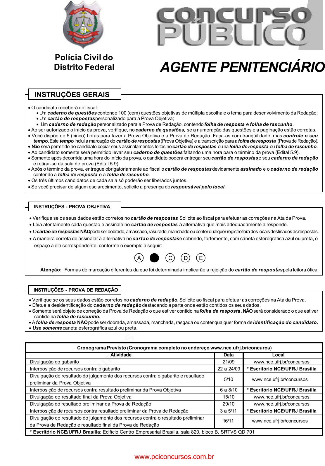 pcimarkpci MDAwMDowMDAwOjAwMDA6MDAwMDowMDAwOmZmZmY6MzZlOTpjMjU5:RnJpLCAxNyBTZXAgMjAyMSAwNjozNjozMiAtMDMwMA== Polícia Civil do Distrito Federal AGENTE PENITENCIÁRIO Cronograma Previsto (Cronograma completo no endereço www.nce.ufrj.br/concuros) Atividade Data Local Divulgação do gabarito 21/09 www.nce.ufrj.br/concursos Interposição de recursos contra o gabarito 22 a 24/09 * Escritório NCE/UFRJ Brasília Divulgação do resultado do julgamento dos recursos contra o gabarito e resultado preliminar da Prova Objetiva Interposição de recursos contra resultado preliminar da Prova Objetiva 6 a 8/10 * Escritório NCE/UFRJ Brasília Divulgação do resultado final da Prova Objetiva 15/10 www.nce.ufrj.br/concursos Divulgação do resultado preliminar da Prova de Redação 29/10 www.nce.ufrj.br/concursos Interposição de recursos contra resultado preliminar da Prova de Redação 3 a 5/11 * Escritório NCE/UFRJ Brasília Divulgação do resultado do julgamento dos recursos contra o resultado preliminar da Prova de Redação e resultado final da Prova de Redação * Escritório NCE/UFRJ Brasília: Edifício Centro Empresarial Brasília, sala 820, bloco B, SRTVS QD 701 INSTRUÇÕES - PROVA DE REDAÇÃO • Verifique se os seus dados estão corretos no caderno de redação. Solicite ao fiscal para efetuar as correções na Ata da Prova. • Efetue a desidentificação do caderno de redação destacando a parte onde estão contidos os seus dados. • Somente será objeto de correção da Prova de Redação o que estiver contido na folha de resposta . NÃO será considerado o que estiver contido na folha de rascunho. • A folha de resposta NÃO pode ser dobrada, amassada, manchada, rasgada ou conter qualquer forma de identificação do candidato. • Use somente caneta esferográfica azul ou preta. 5/10 www.nce.ufrj.br/concursos 16/11 www.nce.ufrj.br/concursos INSTRUÇÕES GERAIS • O candidato receberá do fiscal: • Um caderno de questões contendo 100 (cem) questões objetivas de múltipla escolha e o tema para desenvolvimento da Redação; • Um cartão de respostas personalizado para a Prova Objetiva; • Um caderno de redação personalizado para a Prova de Redação, contendo folha de resposta e folha de rascunho. • Ao ser autorizado o início da prova, verifique, no caderno de questões, se a numeração das questões e a paginação estão corretas. • Você dispõe de 5 (cinco) horas para fazer a Prova Objetiva e a Prova de Redação. Faça-as com tranqüilidade, mas controle o seu tempo. Este tempo inclui a marcação do cartão de respostas (Prova Objetiva) e a transcrição para a folha de resposta (Prova de Redação). • Não será permitido ao candidato copiar seus assinalamentos feitos no cartão de respostas ou na folha de resposta ou folha de rascunho. • Ao candidato somente será permitido levar seu caderno de questões faltando uma hora para o término da prova (Edital 5.9). • Somente após decorrida uma hora do início da prova, o candidato poderá entregar seu cartão de respostas e seu caderno de redação e retirar-se da sala de prova (Edital 5.9). • Após o término da prova, entregue obrigatoriamente ao fiscal o cartão de respostas devidamente assinado e o caderno de redação contendo a folha de resposta e a folha de rascunho. • Os três últimos candidatos de cada sala só poderão ser liberados juntos. • Se você precisar de algum esclarecimento, solicite a presença do responsável pelo local. INSTRUÇÕES - PROVA OBJETIVA • Verifique se os seus dados estão corretos no cartão de respostas. Solicite ao fiscal para efetuar as correções na Ata da Prova. • Leia atentamente cada questão e assinale no cartão de respostas a alternativa que mais adequadamente a responde. • O cartão de respostas NÃO pode ser dobrado, amassado, rasurado, manchado ou conter qualquer registro fora dos locais destinados às respostas. • A maneira correta de assinalar a alternativa no cartão de respostas é cobrindo, fortemente, com caneta esferográfica azul ou preta, o espaço a ela correspondente, conforme o exemplo a seguir: Atenção: Formas de marcação diferentes da que foi determinada implicarão a rejeição do cartão de respostas pela leitora ótica. A C D E www.pciconcursos.com.br pcimarkpci MDAwMDowMDAwOjAwMDA6MDAwMDowMDAwOmZmZmY6MzZlOTpjMjU5:RnJpLCAxNyBTZXAgMjAyMSAwNjozNjozMiAtMDMwMA== AGENTE PENITENCIÁRIO 2004 2 LÍNGUA PORTUGUESA TEXTO 1 – CIDADE DE DEUS (fragmento) Rubem Fonseca O nome dele é João Romeiro, mas é conhecido como Zinho na Cidade de Deus, uma favela em Jacarepaguá, onde comanda o tráfico de drogas. Ela é Soraia Gonçalves, uma mulher dócil e calada. Soraia soube que Zinho era traficante dois meses depois de estarem morando juntos num condomínio de classe média alta na Barra da Tijuca. Você se importa?, Zinho perguntou e ela respondeu que havia tido na vida dela um homem metido a direito que não passava de um canalha. No condomínio Zinho é conhecido como vendedor de uma firma de importação. Quando chega uma partida grande de droga na favela, Zinho some durante alguns dias. Para justificar sua ausência Soraia diz, para as vizinhas que encontra no playground ou na piscina, que o marido está viajando pela firma. A polícia anda atrás dele, mas sabe apenas o seu apelido, e que ele é branco. Zinho nunca foi preso. 1 - “...e ela respondeu que havia tido na vida dela um homem metido a direito que não passava de um canalha”; a resposta de Soraia equivale a dizer que: a) todos os homens são canalhas; b) não vale a pena viver dentro da lei; c) nem tudo na vida é perfeito; d) a vida criminosa é mais cheia de emoções; e) todos os homens são hipócritas. 2 - No primeiro período do texto, o segmento uma favela em Jacarepaguá é um aposto, empregado para: a) informar algo hipoteticamente desconhecido; b) situar a ação num bairro perigoso; c) ironizar sobre o nome de Deus na designação de uma favela; d) pre