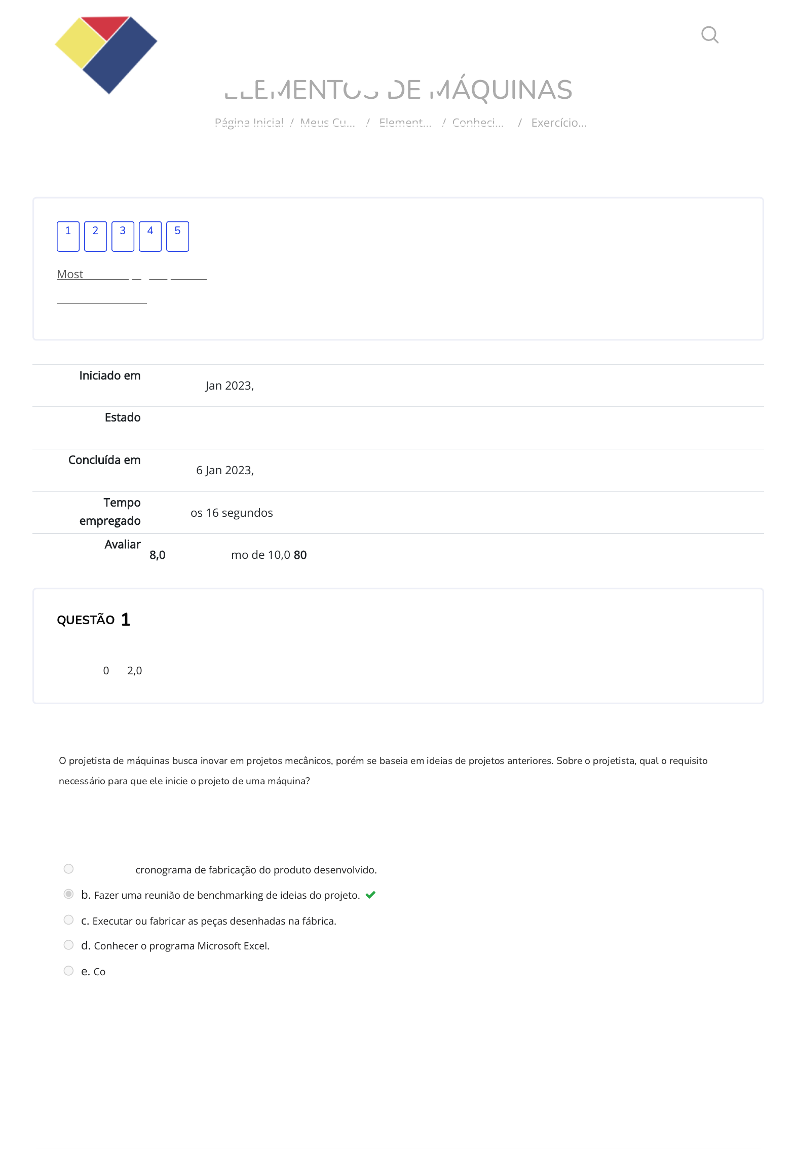 26/01/23, 13:35 Exercício de Fixação - Conhecimentos básicos para um projetista: Revisão da tentativa https://cpetead.com.br/mod/quiz/review.php?attempt=3523633&cmid=49121 1/4 ELEMENTOS DE MÁQUINAS Página Inicial / Meus Cu… / Element… / Conheci… / Exercício… Iniciado em quinta, 26 Jan 2023, 13:18 Estado Finalizada Concluída em quinta, 26 Jan 2023, 13:22 Tempo empregado 4 minutos 16 segundos Avaliar 8,0 de um máximo de 10,0(80%) QUESTÃO Correto Atingiu 2,0 de 2,0 Mostrar uma página por vez Terminar revisão 1 2 3 4 5 1 O projetista de máquinas busca inovar em projetos mecânicos, porém se baseia em ideias de projetos anteriores. Sobre o projetista, qual o requisito necessário para que ele inicie o projeto de uma máquina? Escolha uma opção: a. De�nir o cronograma de fabricação do produto desenvolvido. b. Fazer uma reunião de benchmarking de ideias do projeto. c. Executar ou fabricar as peças desenhadas na fábrica. d. Conhecer o programa Microsoft Excel. e. Copiar um desenho de projeto de outro colega. Sua resposta está correta. A resposta correta é: Fazer uma reunião de benchmarking de ideias do projeto. https://cpetead.com.br/ https://cpetead.com.br/course/view.php?id=1890 https://cpetead.com.br/mod/quiz/view.php?id=49121 https://cpetead.com.br/mod/quiz/review.php?attempt=3523633&cmid=49121&showall=0 https://cpetead.com.br/mod/quiz/view.php?id=49121 https://cpetead.com.br/ 26/01/23, 13:35 Exercício de Fixação - Conhecimentos básicos para um projetista: Revisão da tentativa https://cpetead.com.br/mod/quiz/review.php?attempt=3523633&cmid=49121 2/4 QUESTÃO Correto Atingiu 2,0 de 2,0 QUESTÃO Incorreto Atingiu 0,0 de 2,0 2 Deseja-se desenhar os diagramas elétricos bidimensionais do projeto de uma máquina. Qual é o programa computacional comercial mais recomendado para esse projeto? Escolha uma opção: a. Catia b. Microsoft Paint. c. Solidworks d. Autocad e. Inventor Sua resposta está correta. A resposta correta é: Autocad 3 A simulação por elementos �nitos busca dar uma ideia ao projetista sobre o produto fabricado em relação aos esforços atuantes em determinadas partes da máquina. Sobre o método de elementos �nitos para o projeto de máquinas, assinale a alternativa correta. Escolha uma opção: a. Deve ser utilizado em alguns casos. b. Não deve ser utilizado, pois não assegura a realidade do funcionamento da máquina. c. Deve ser sempre utilizado. d. É um método que não agrega valor ao projeto de máquinas. e. Não deve ser utilizado, é apenas um recurso visual. Sua resposta está incorreta. A resposta correta é: Deve ser sempre utilizado. 26/01/23, 13:35 Exercício de Fixação - Conhecimentos básicos para um projetista: Revisão da tentativa https://cpetead.com.br/mod/quiz/review.php?attempt=3523633&cmid=49121 3/4 QUESTÃO Correto Atingiu 2,0 de 2,0 QUESTÃO Correto Atingiu 2,0 de 2,0 4 Deseja-se projetar o deslocamento do �uido hidráulico de uma máquina. A qual projetista deve-se recorrer para o projeto desse sistema lubri�cante? Escolha uma opção: a. Projetista de usinagem. b. Projetista mecânico. c. Projetista elétrico. d. Projetista hidráulico. e. Projetista de métodos e tempo. Sua resposta está correta. A resposta correta é: Projetista hidráulico. 5 Um determinado projetista inicia o projeto de uma máquina operatriz e, após fazer uma pesquisa sobre normas técnicas, veri�ca que não há uma norma atual ou atualizada referente ao desenvolvimento daquela máquina. Nesse caso, o que o projetista deve fazer? Escolha uma opção: a. Utilizar uma norma que não seja a adequada àquela máquina. b. Não utilizar a norma, mas pedir aprovação ao líder de projeto. c. Recorrer a normas antigas, como as militares. d. Não utilizar norma, seguir com o projeto a seu gosto. e. Criar uma nova norma especí�ca ao produto. Sua resposta está correta. A resposta correta é: Recorrer a normas antigas, como as militares. ◄ Saiba+ Seguir para... Conteúdo de Estudo - Tipos de carregamento e análise de esforços – choques e cargas de choques ► https://cpetead.com.br/mod/url/view.php?id=93062&forceview=1 https://cpetead.com.br/mod/lti/view.php?id=49122&forceview=1 26/01/23, 13:35 Exercício de Fixação - Conhecimentos básicos para um projetista: Revisão da tentativa https://cpetead.com.br/mod/quiz/review.php?attempt=3523633&cmid=49121 4/4 Quem somos Cursos Certi�cação Unidades Contato Copyright © 2021 CPET - Centro de Pro�ssionalização e Educação Técnica https://www.cpet.com.br/quem-somos-cpet-cursos-tecnicos-a-distancia-ead/ https://www.cpet.com.br/course-cat/cursos/cursos-online/ https://www.cpet.com.br/certificacao-cpet/ https://www.cpet.com.br/unidades-cpet/ https://www.cpet.com.br/contato/ https://www.facebook.com/CPET-Centro-de-Profissionaliza%C3%A7%C3%A3o-e-Educa%C3%A7%C3%A3o-T%C3%A9cnica-1039179026236475/ https://twitter.com/soucpet/ https://www.instagram.com/soucpet/