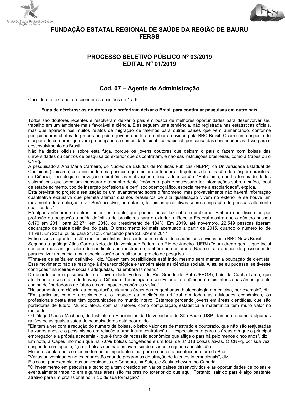pcimarkpci MDAwMDowMDAwOjAwMDA6MDAwMDowMDAwOmZmZmY6MzZlOTpjMjU5:RnJpLCAxNyBTZXAgMjAyMSAwMTozNDowOSAtMDMwMA== 1 FUNDAÇÃO ESTATAL REGIONAL DE SAÚDE DA REGIÃO DE BAURU FERSB PROCESSO SELETIVO PÚBLICO Nº 03/2019 EDITAL No 01/2019 Cód. 07 – Agente de Administração Considere o texto para responder às questões de 1 a 5: Fuga de cérebros: os doutores que preferiram deixar o Brasil para continuar pesquisas em outro país Todos são doutores recentes e resolveram deixar o país em busca de melhores oportunidades para desenvolver seu trabalho em um ambiente mais favorável à ciência. Eles seguem uma tendência, não registrada nas estatísticas oficiais, mas que aparece nos muitos relatos de migração de talentos para outros países que vêm aumentando, conforme pesquisadores chefes de grupos no país e jovens que foram embora, ouvidos pela BBC Brasil. Ocorre uma espécie de diáspora de cérebros, que vem preocupando a comunidade científica nacional, por causa das consequências disso para o desenvolvimento do Brasil. Não há dados oficiais sobre esta fuga, porque os jovens doutores que deixam o país o fazem com bolsas das universidades ou centros de pesquisa do exterior que os contratam, e não das instituições brasileiras, como a Capes ou o CNPq. A pesquisadora Ana Maria Carneiro, do Núcleo de Estudos de Políticas Públicas (NEPP), da Universidade Estadual de Campinas (Unicamp) está iniciando uma pesquisa que tentará entender as trajetórias de migração da diáspora brasileira de Ciência, Tecnologia e Inovação e também as motivações e locais de inserção. "Entretanto, não há fontes de dados sistemáticas que permitam mensurar o tamanho deste fenômeno, pois é necessário ter informações sobre a saída, local de estabelecimento, tipo de inserção profissional e perfil sociodemográfico, especialmente a escolaridade", explica. Está prevista no projeto a realização de um levantamento sobre o fenômeno, mas provavelmente não haverá informação quantitativa exaustiva que permita afirmar quantos brasileiros de alta qualificação vivem no exterior e se houve um movimento de ampliação, diz. "Será possível, no entanto, ter pistas qualitativas sobre a migração de pessoas altamente qualificadas." Há alguns números de outras fontes, entretanto, que podem lançar luz sobre o problema. Embora não discrimine por profissão ou ocupação a saída definitiva de brasileiros para o exterior, a Receita Federal mostra que o número passou 8.170 em 2011 para 23.271 em 2018, ou crescimento de 184%. Em 2019, até novembro, 22.549 pessoas fizeram declaração de saída definitiva do país. O crescimento foi mais acentuado a partir de 2015, quando o número foi de 14.981. Em 2016, pulou para 21.103, crescendo para 23.039 em 2017. Entre esses migrantes, estão muitos cientistas, de acordo com o relato de acadêmicos ouvidos pela BBC News Brasil. Segundo o geólogo Atlas Correa Neto, da Universidade Federal do Rio de Janeiro (UFRJ) "é um dreno geral", que inclui doutores mais antigos além de candidatos ao mestrado e também ao doutorado. Não se trata apenas de pessoas indo para realizar um curso, uma especialização ou realizar um projeto de pesquisa. "Trata-se de saída em definitivo", diz. "Quem tem possibilidade está indo, mesmo sem manter a ocupação de cientista. Esse movimento não se restringe à área tecnológica e também afeta as ciências sociais. Aliás, se eu pudesse, se tivesse condições financeiras e sociais adequadas, iria embora também." De acordo com o pesquisador da Universidade Federal do Rio Grande do Sul (UFRGS), Luís da Cunha Lamb, que atualmente é secretário de Inovação, Ciência e Tecnologia do seu Estado, o fenômeno é mais intenso nas áreas que ele chama de "portadoras de futuro e com impacto econômico visível". "Notadamente em ciência da computação, algumas áreas das engenharias, biotecnologia e medicina, por exemplo", diz. "Em particular, com o crescimento e o impacto da inteligência artificial em todas as atividades econômicas, os profissionais desta área têm oportunidades no mundo inteiro. Estamos perdendo jovens em áreas científicas, que são portadoras de futuro. Mundo afora, dominar setores como computação, estatística e matemática têm muito valor no mercado." O biólogo Glauco Machado, do Instituto de Biociências da Universidade de São Paulo (USP), também enumera algumas razões pelas quais a saída de pesquisadores está ocorrendo. "Ela tem a ver com a redução do número de bolsas, o baixo valor das de mestrado e doutorado, que não são reajustadas há vários anos, e o pessimismo em relação a uma futura contratação — especialmente para as áreas em que o principal empregador é a própria academia -, que é fruto da recessão econômica que aflige o país há pelo menos cinco anos", diz. Em nota, a Capes informou que há 7.699 bolsas congeladas e um total de 87.018 bolsas ativas. O CNPq, por sua vez, suspendeu em agosto, 4,5 mil bolsas que não estavam sendo usadas, segundo a instituição. Ele acrescenta que, ao mesmo tempo, é importante olhar para o que está acontecendo fora do Brasil. "Várias universidades no exterior estão criando programas de atração de talentos internacionais", diz. É o caso, por exemplo, das universidades de Genebra, na Suíça, e Saskatchewan, no Canadá. "O investimento em pesquisa e tecnologia tem crescido em vários países desenvolvidos e as oportunidades de bolsas e eventualmente trabalho em algumas áreas são maiores no exterior do que aqui. Portanto, sair do país é algo bastante atrativo para um profissional no início de sua formação." pcimarkpci MDAwMDowMDAwOjAwMDA6MDAwMDowMDAwOmZmZmY6MzZlOTpjMjU5:RnJpLCAxNyBTZXAgMjAyMSAwMTozNDowOSAtMDMwMA== 2 Eduardo Farias Sanches, de 39 anos, que o diga. Ele considera que teve sorte de receber um convite para ir embora em um momento oportuno, "devido ao incessante ataque do governo federal às universida